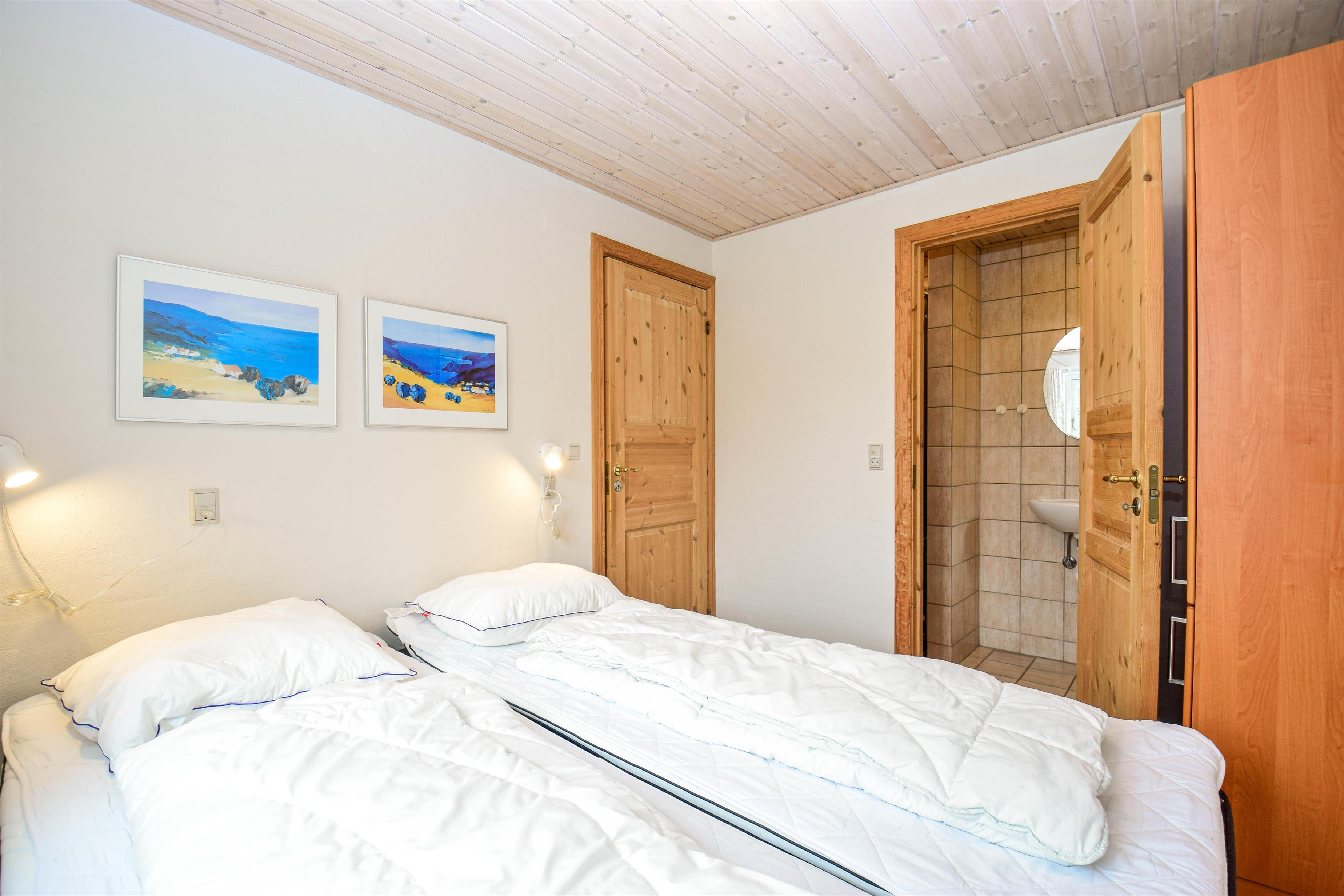 - Et rummeligt værelse med dobbeltseng og direkte adgang til eget badeværelse med toilet og bruser.