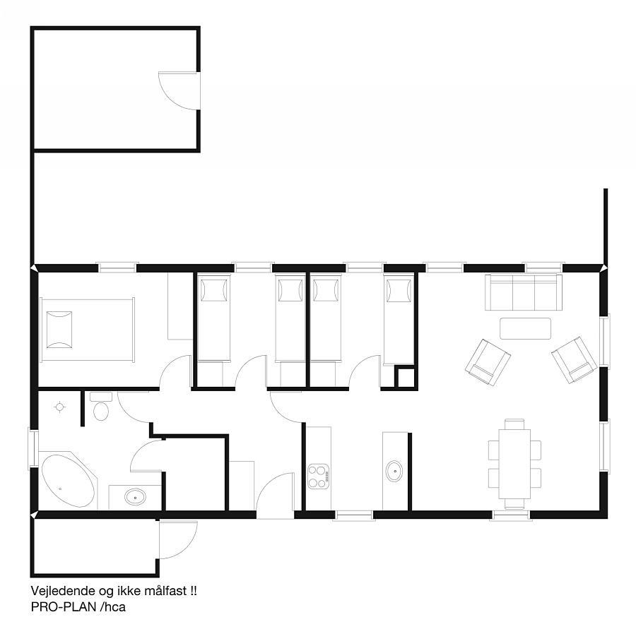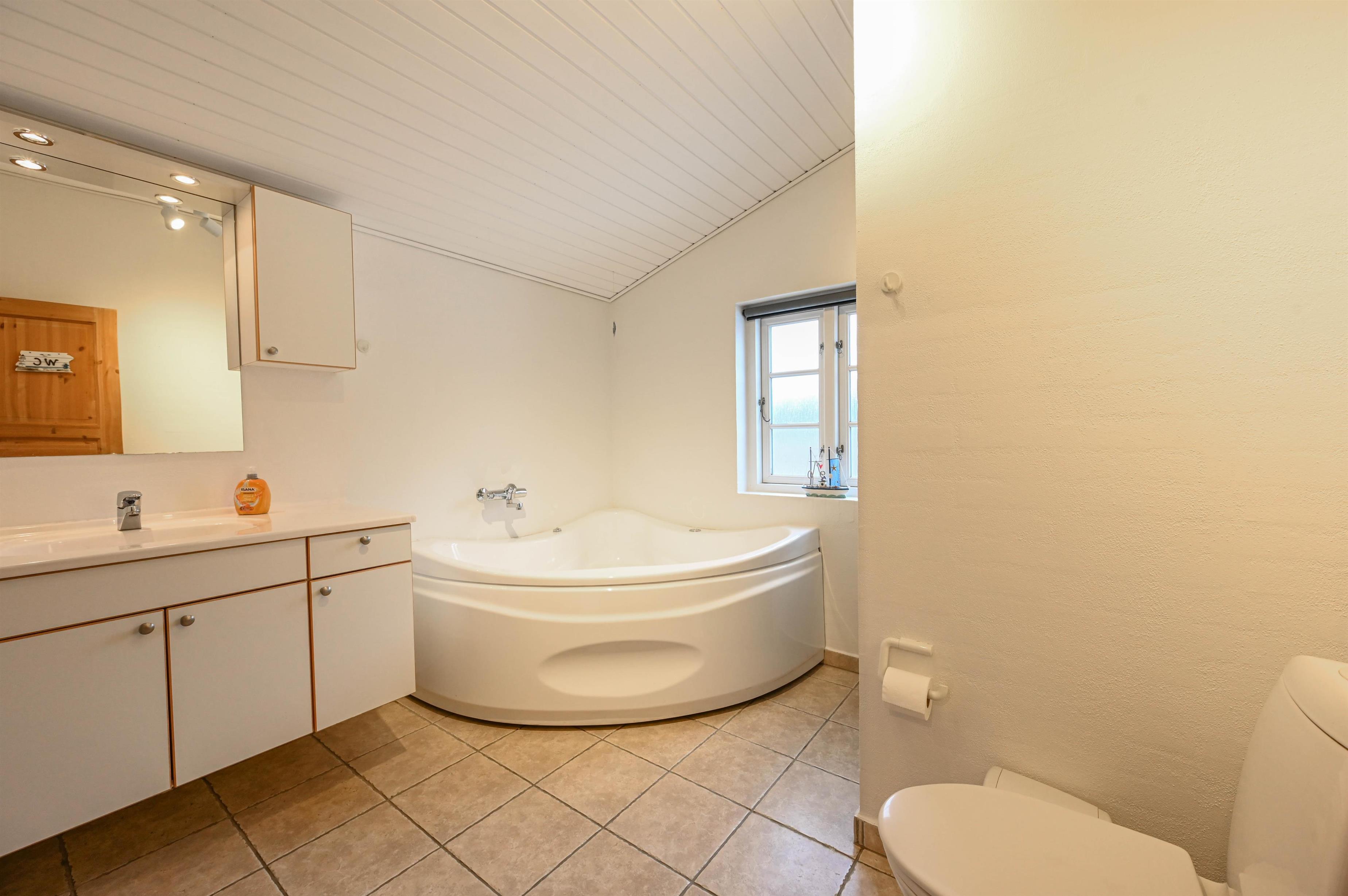 Indretning: Flot køkken i åben forbindelse til lys stue med brændeovn og varmepumpe. Herfra er der udgang til den store terrasse. Pænt badeværelse med spa og sauna. 3 gode værelser. Ét med dobbeltseng og to værelser med hver 2 enkeltsenge. Entré.