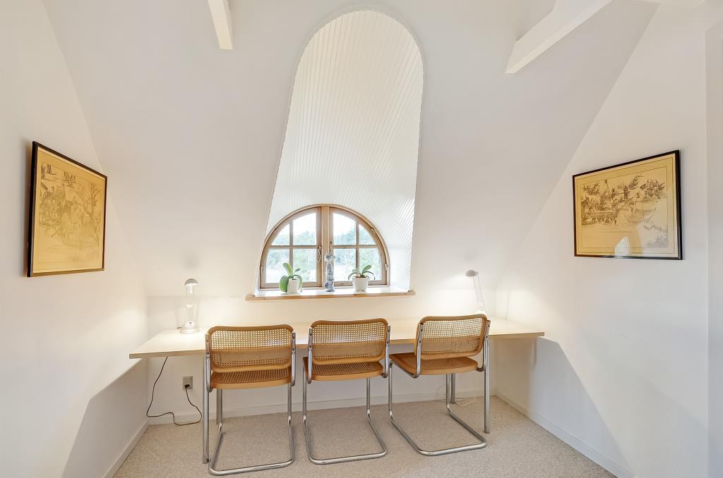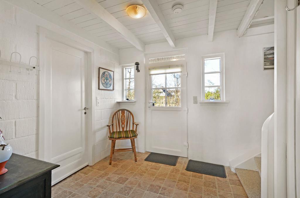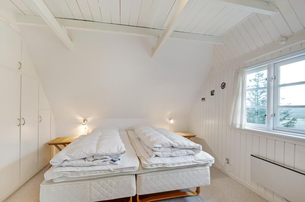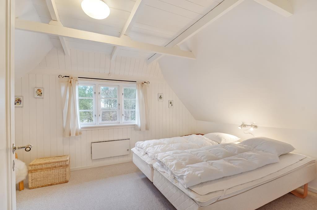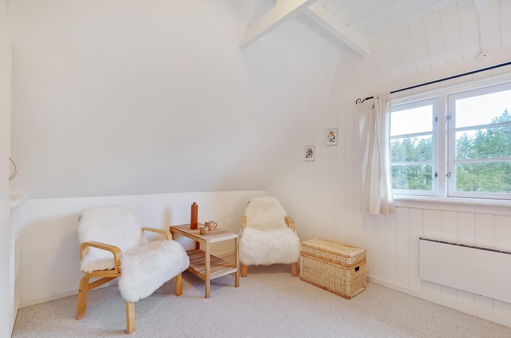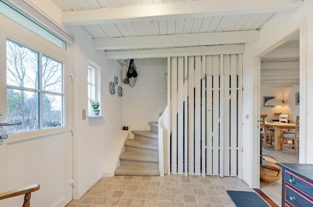 Fra entréen fører trappen op til første sal, hvor du finder to store soveværelser – begge med dobbeltseng, gode skabe og en rolig atmosfære, der indbyder til en god nats søvn efter en dag i naturen.