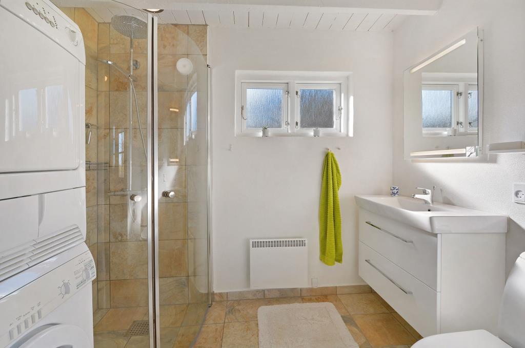 Badeværelset er flot og funktionelt, med bruseniche, vaskemaskine og tørretumbler – perfekt til både korte og lange ophold.