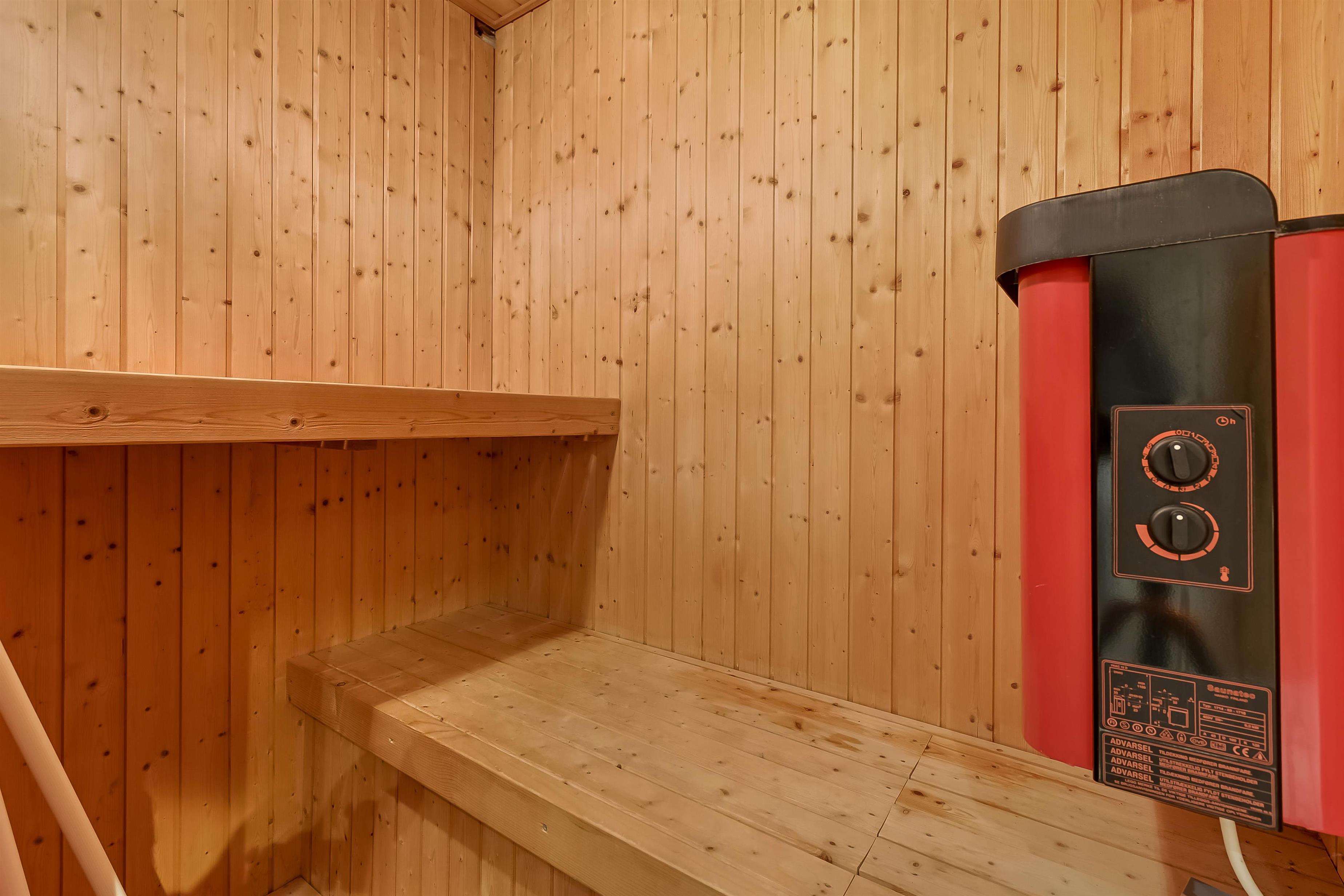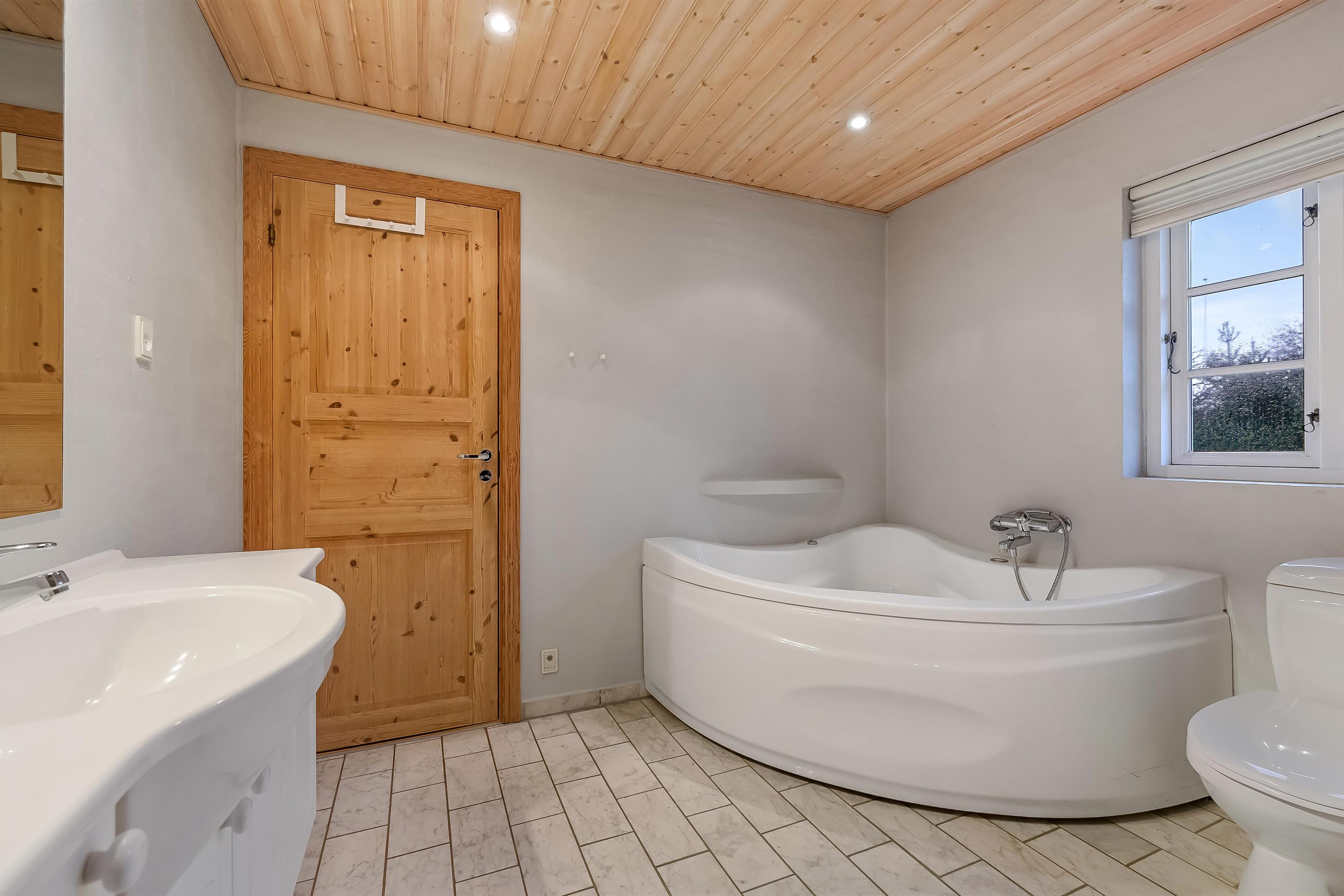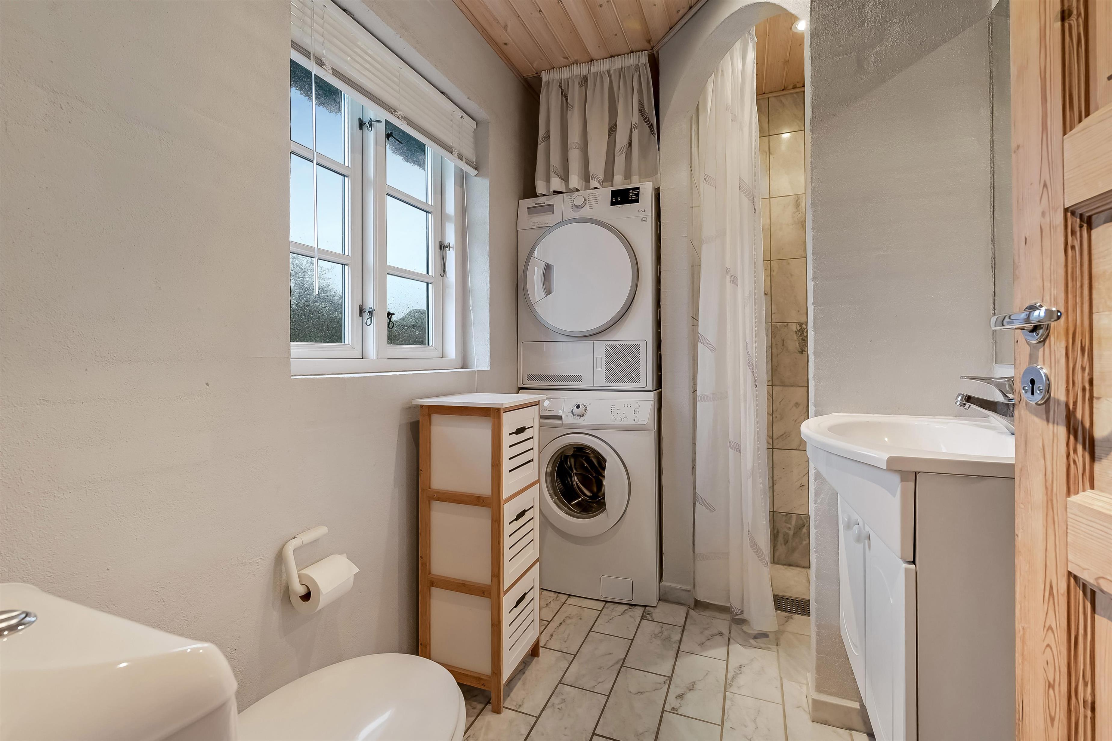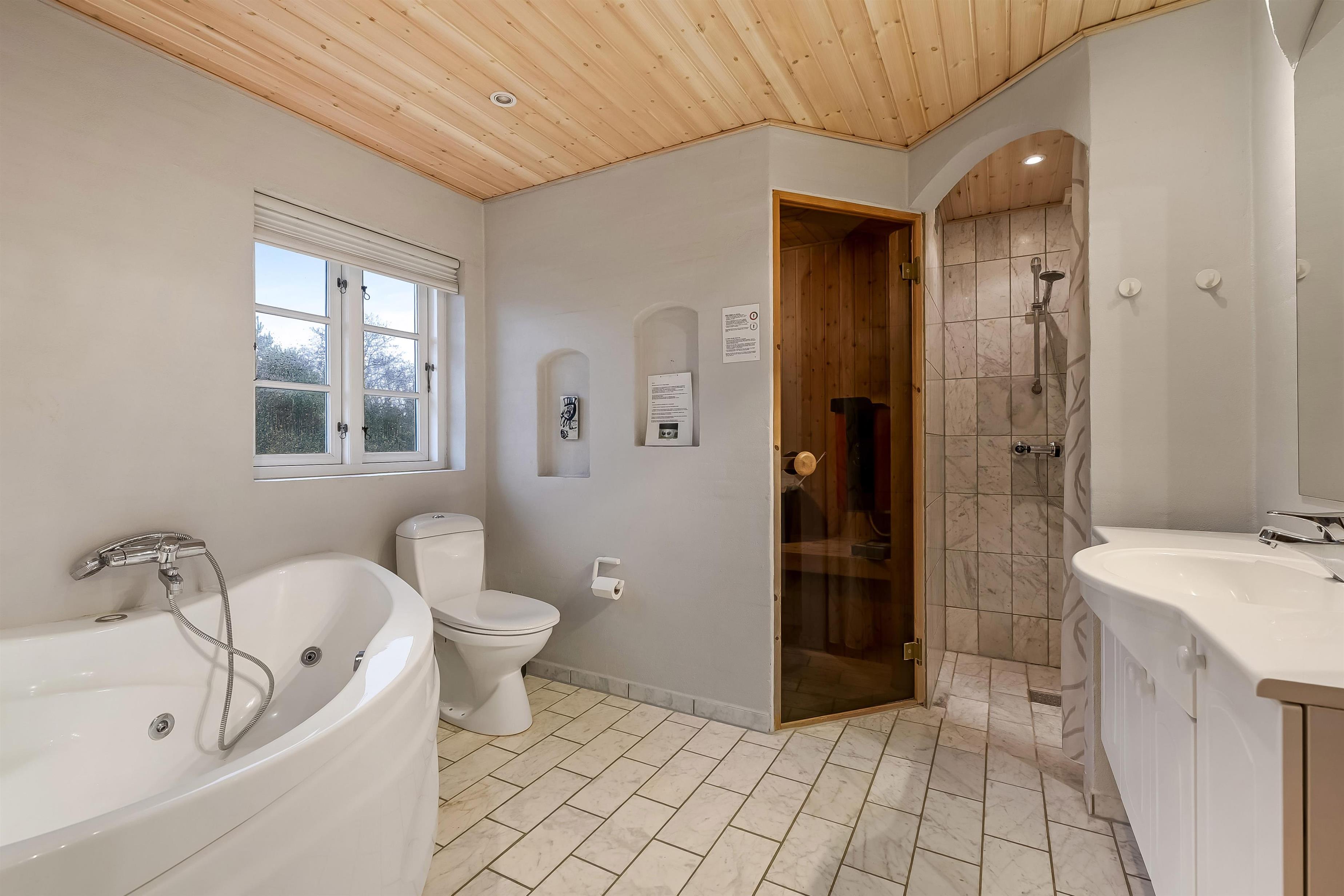 Huset har to badeværelser: ét med spa, gulvvarme og adgang til sauna, og et ekstra med bruser.