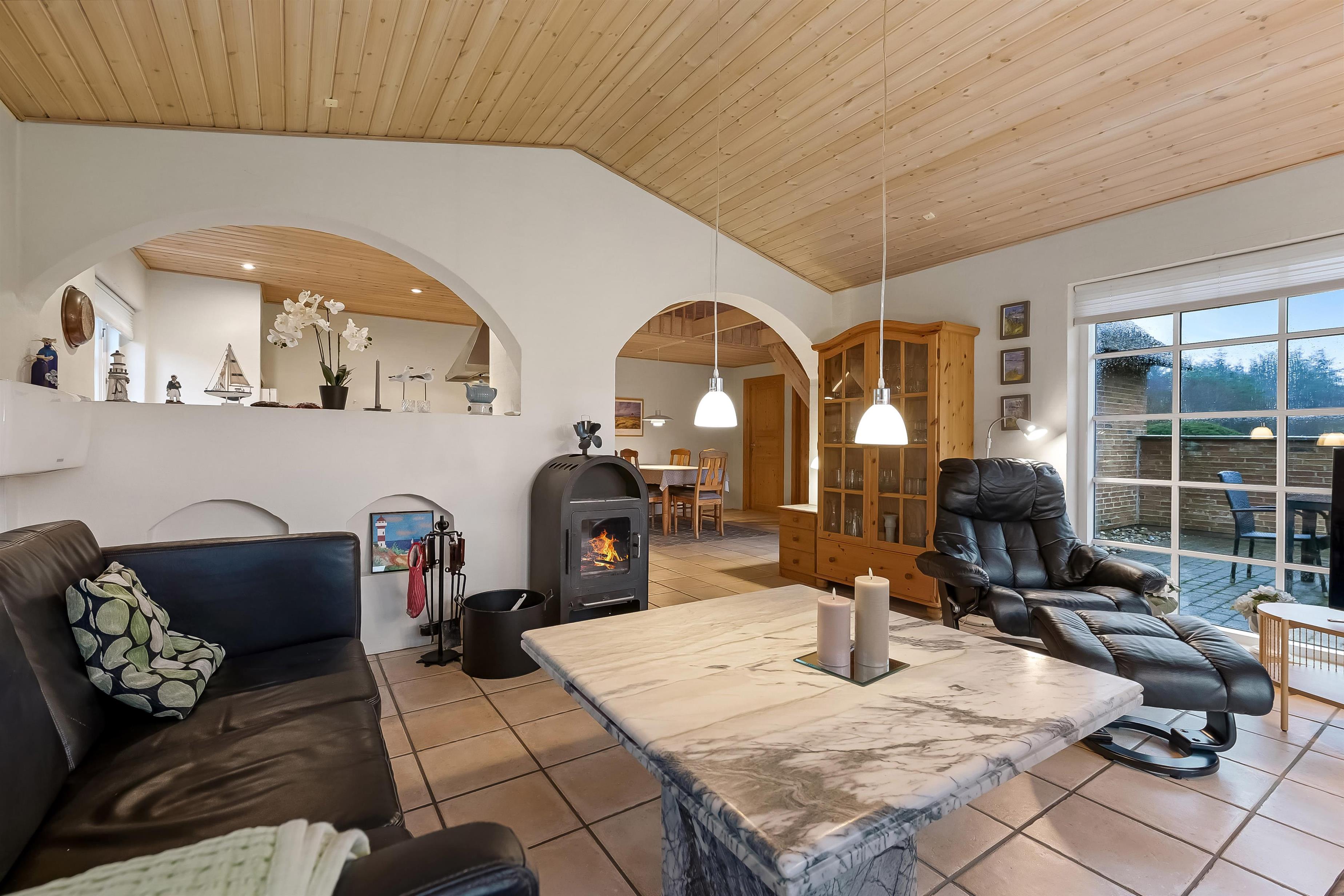 Den store opholdsstue ligger i åben forbindelse med det veludstyrede køkken – her skaber brændeovnen, klinkegulv med gulvvarme og bløde møbler en indbydende atmosfære. Fra stuen er der udgang til en dejlig syd-/vestvendt terrasse, hvor du kan nyde solen dagen lang.