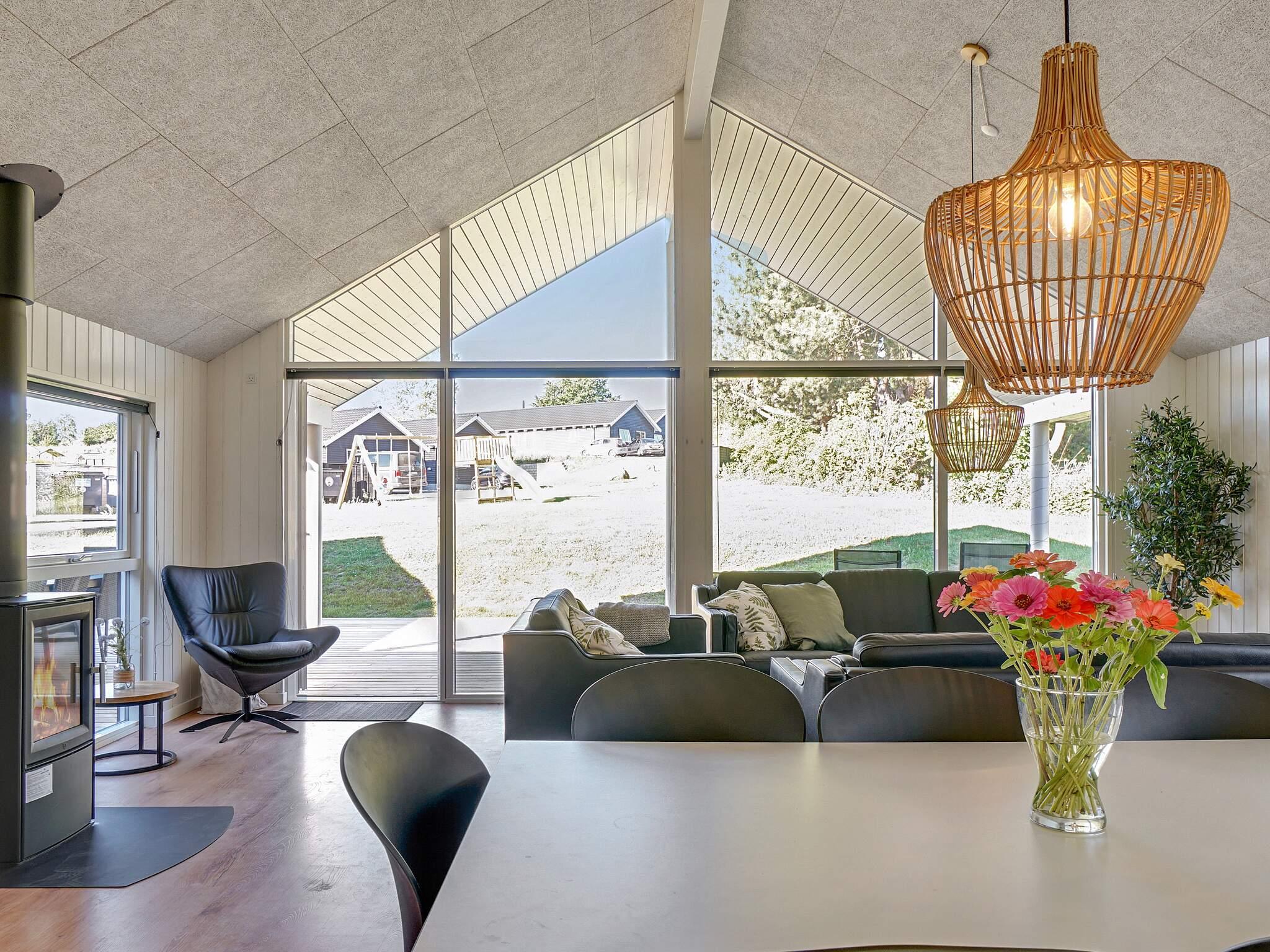 Køkken/alrummet fungerer som et naturligt samlingspunkt med sin centrale placering midt i sommerhuset. Her kan I hygge jer i sofaen, foran brændeovnen eller samles til et lækkert måltid mad. I forlængelse af stuen ligger det veludstyrede køkken med bl.a. 2 ovne, så hvis I er på madholdet, er I ikke afskåret fra resten af flokken.
