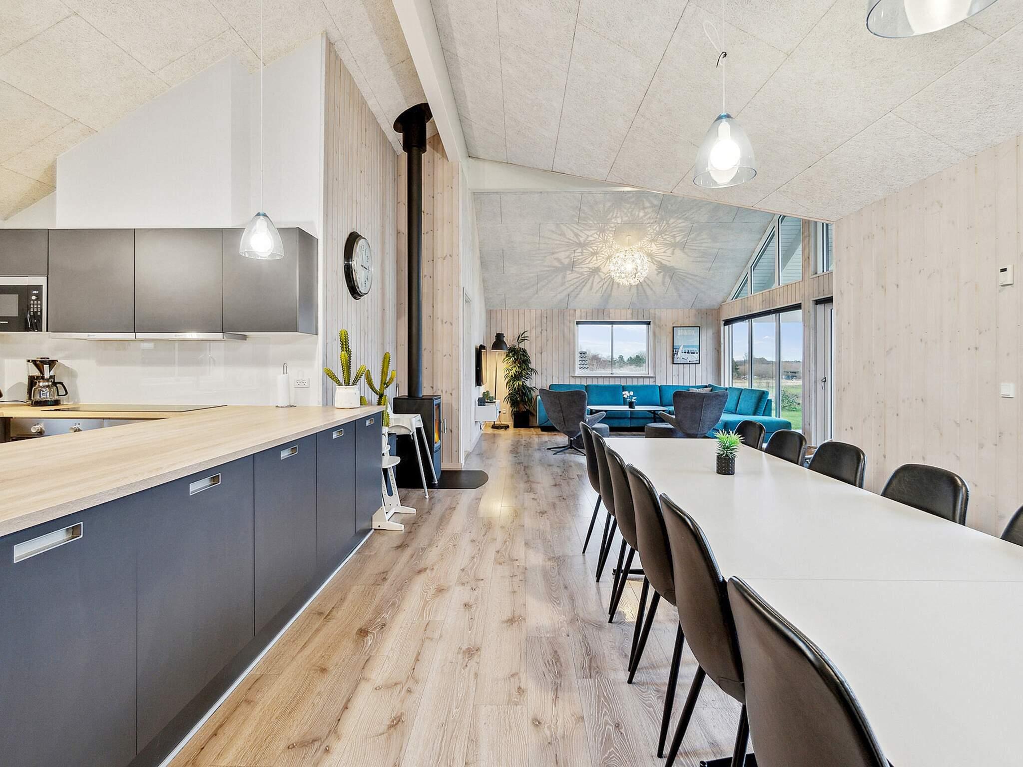 Det naturlige samlingspunkt er det store og arkitektonisk spændende rum med kombineret stue og køkken. Køkkenet er velindrettet, så der uden problemer kan være flere kokke og køkkenskrivere om den fælles madlavning. Stuen er smagfuldt indrettet med komfortable møbler og brændeovn og stort fladskærms-tv. Fra entre til køkken er der trapper.