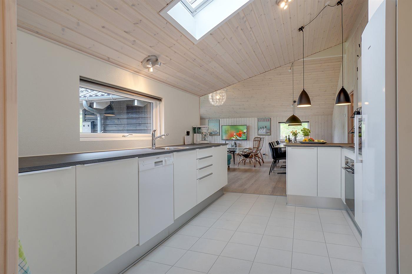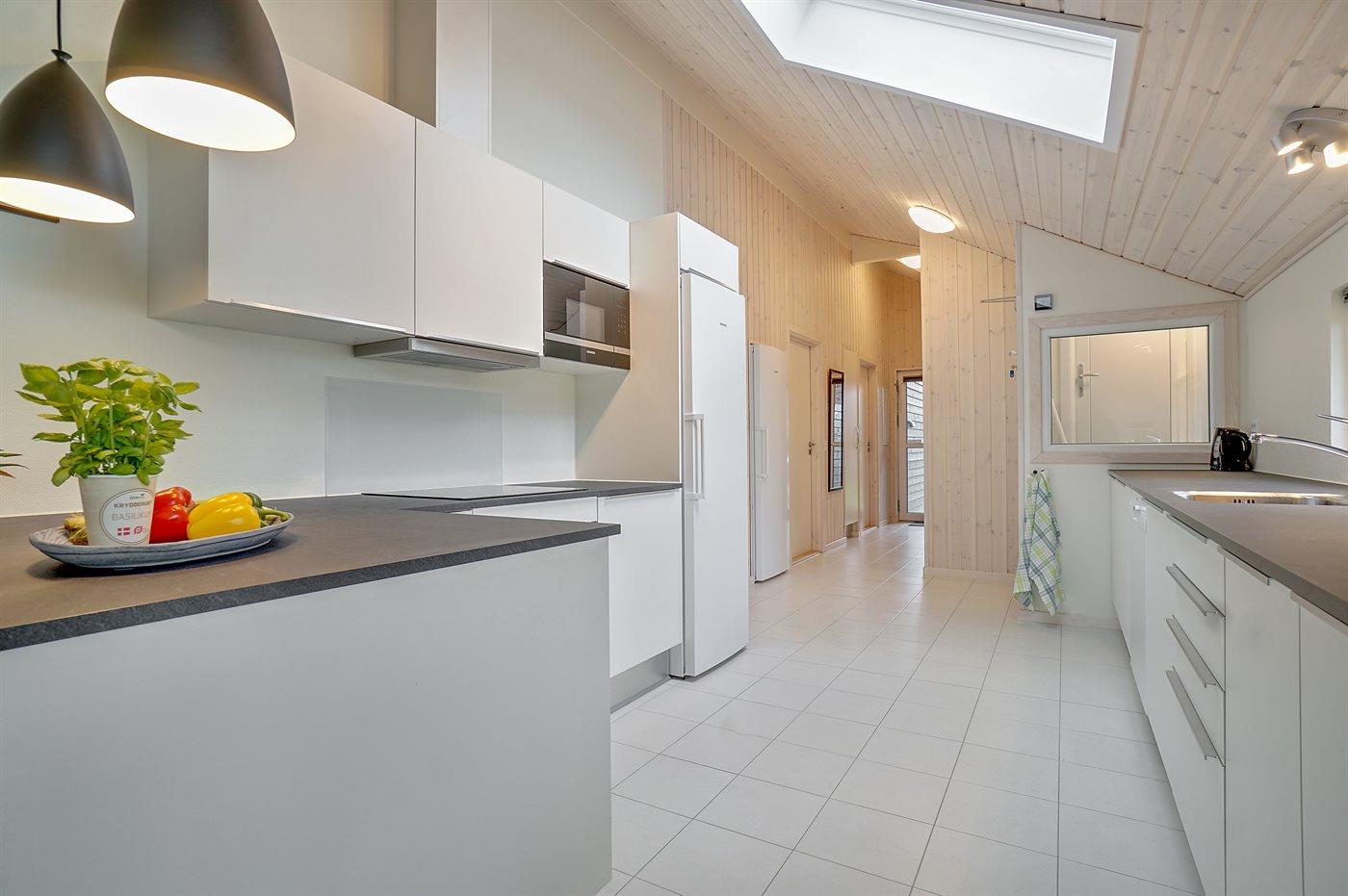 Køkkenet er udstyret med 1 køleskab. Der er 4 induktionskogeplader, varmluftovn, mikrobølgeovn samt opvaskemaskine.