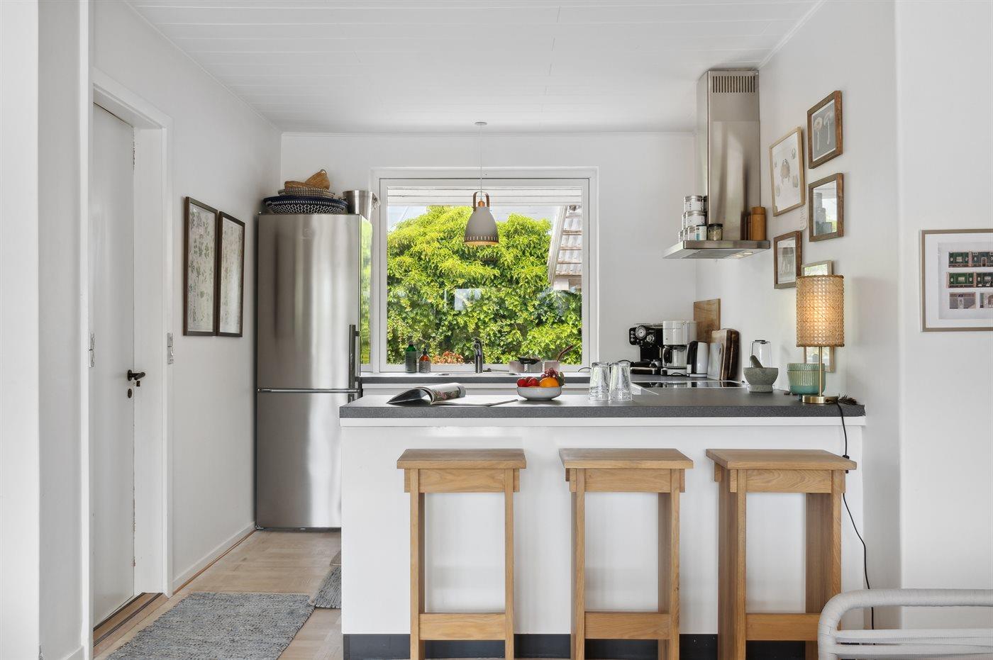 Køkkenet er udstyret med 1 køleskab. Der er 4 induktionskogeplader, 2 varmluftovne samt opvaskemaskine.