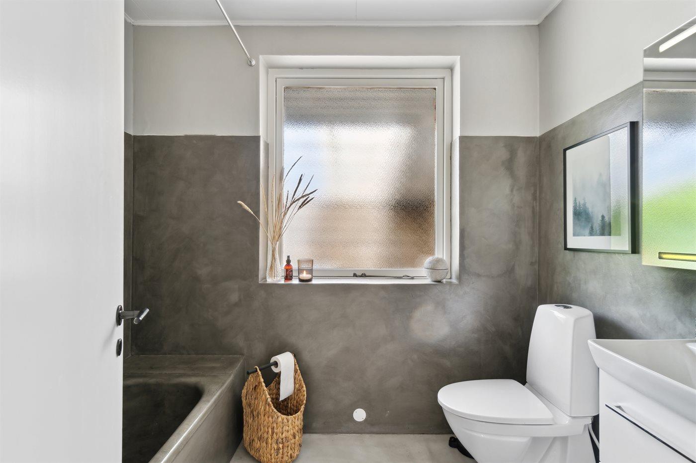 Der er 1 badeværelse med gulvvarme, toilet og badekar. Desuden findes der 1 gæstetoilet med gulvvarme.