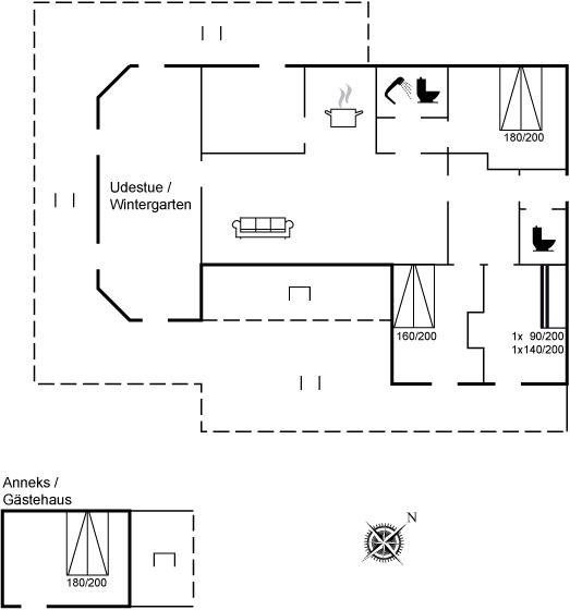 Bemærk: Husets opvaskemaskine findes i bryggerset ved siden af køkkenet. Til huset hører et anneks, som er indrettet med 2 af de i alt 8 sovepladser.