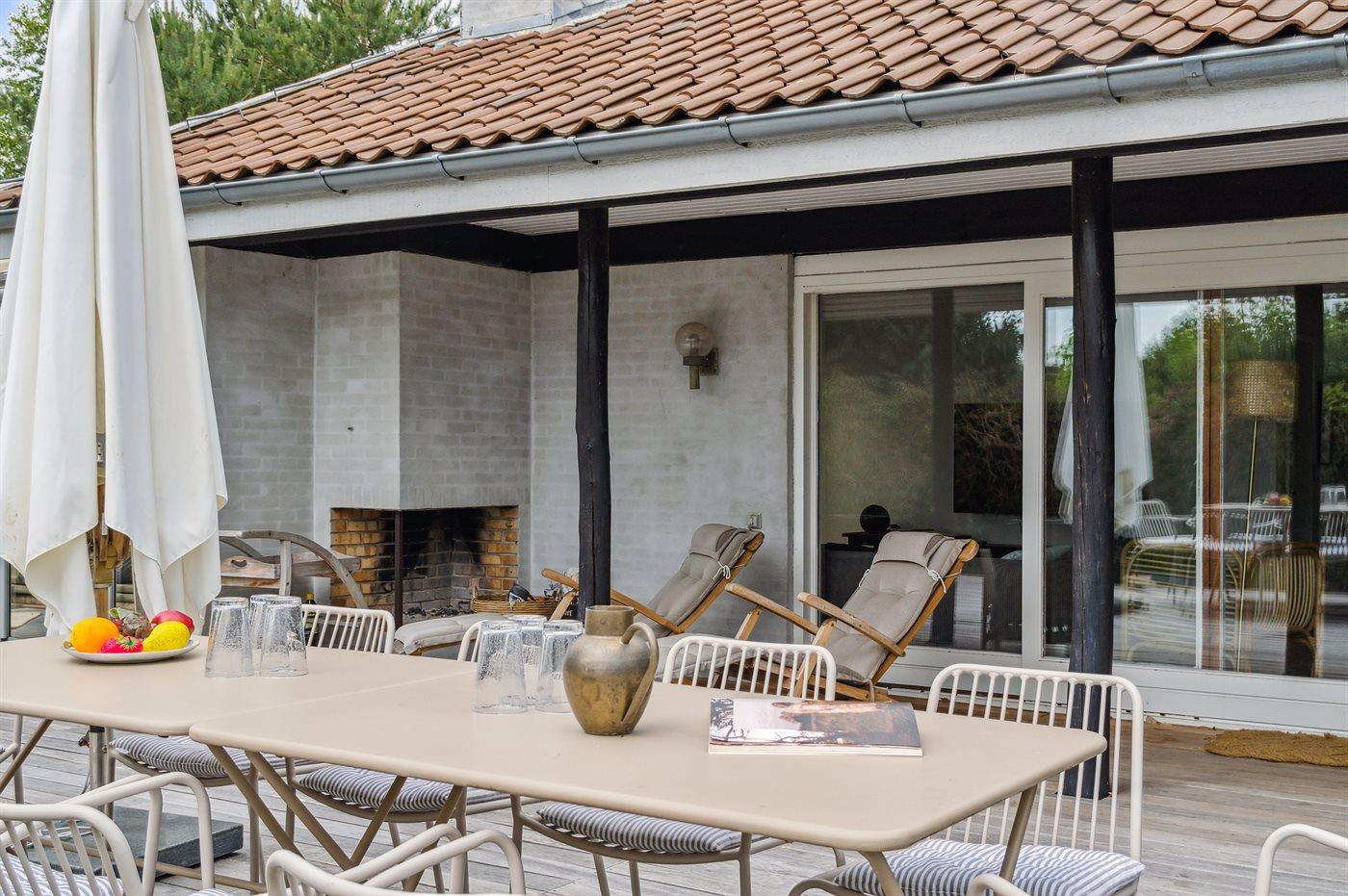 Rummeligt sommerhus nær Vejby Strand med moderne faciliteter og stor terrasse med udendørs pejs.