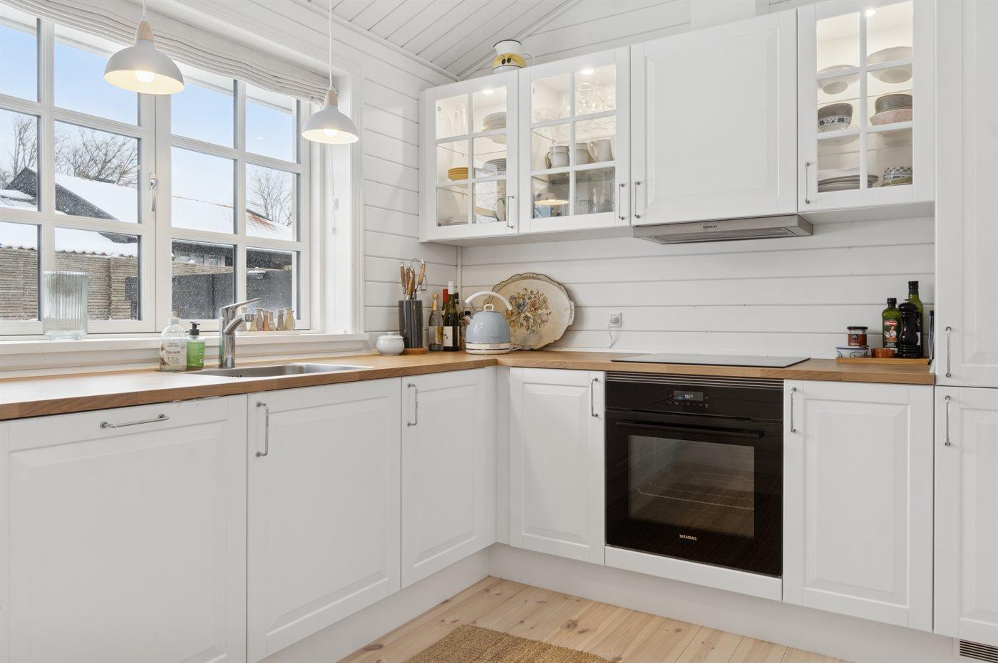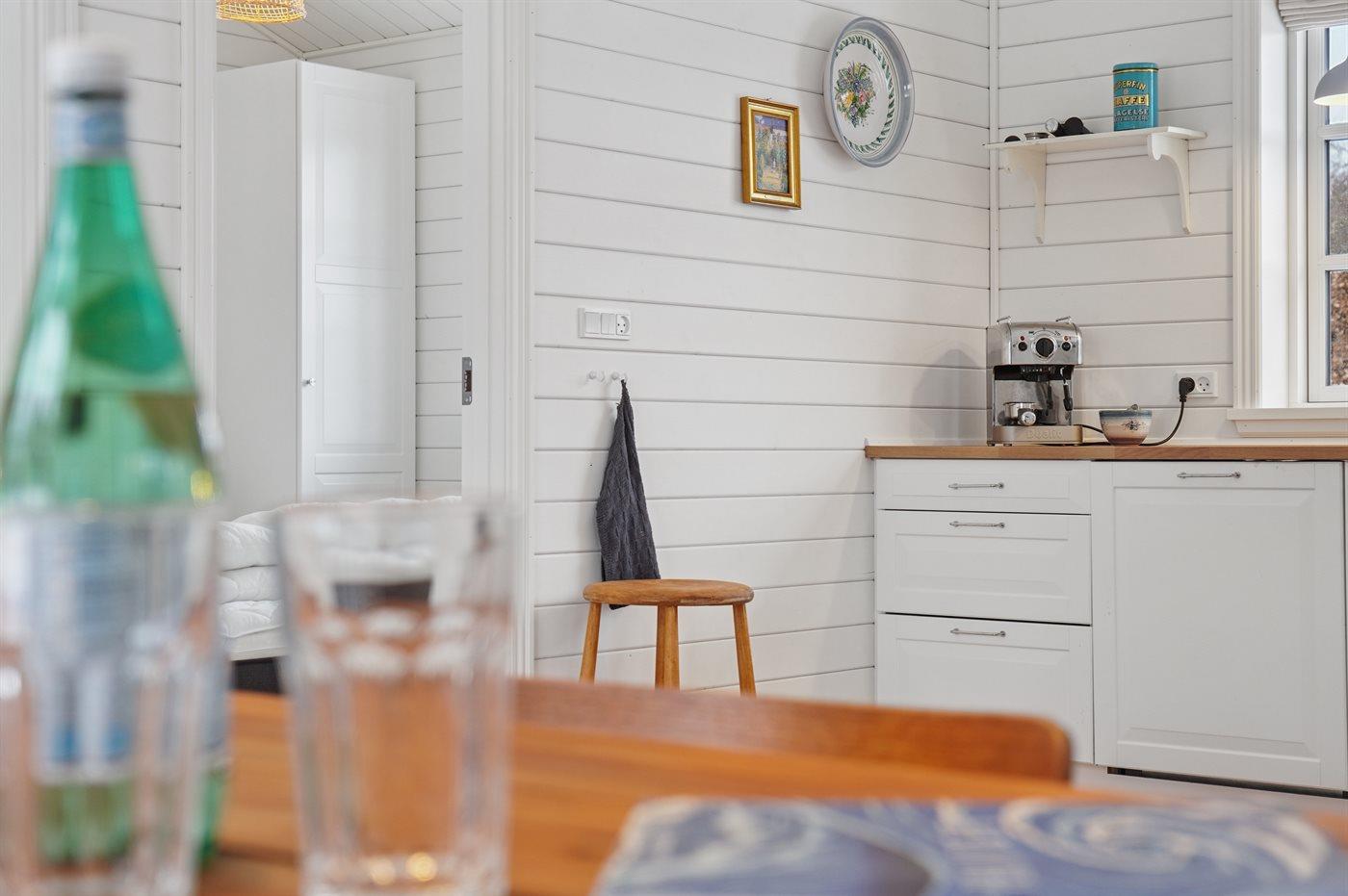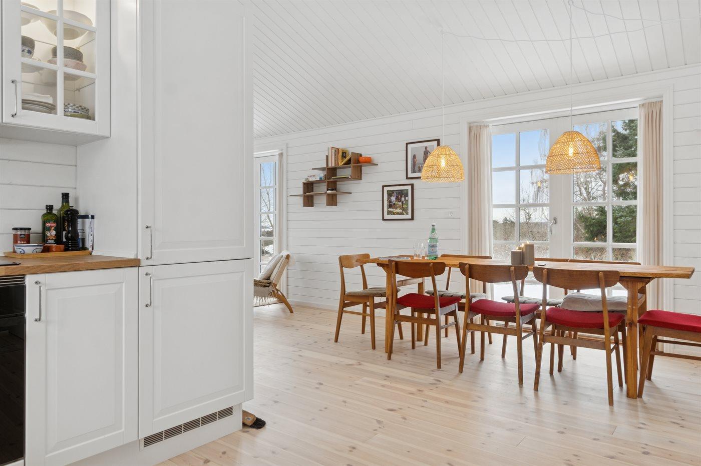Køkkenet er udstyret med 1 køleskab. Der er 4 induktionskogeplader, varmluftovn, mikrobølgeovn samt opvaskemaskine.
