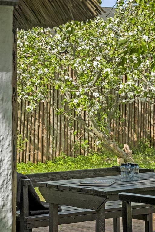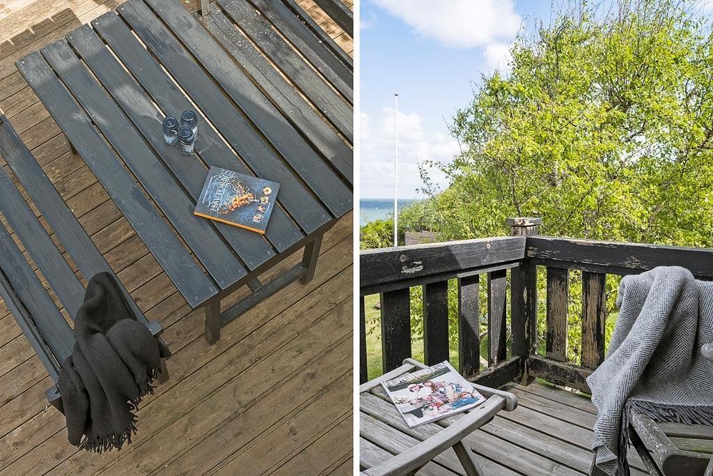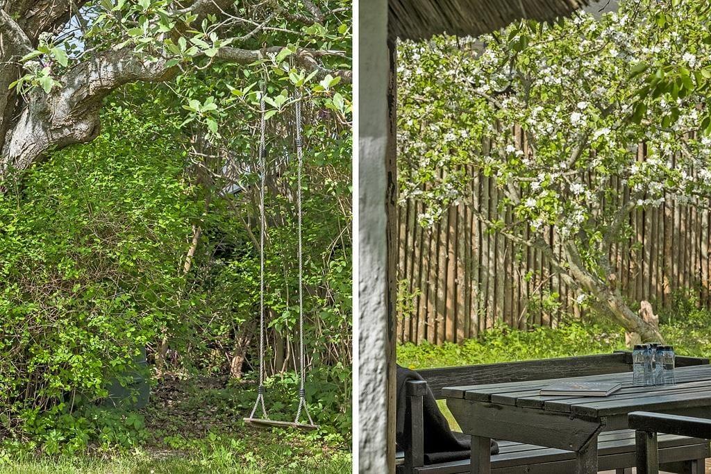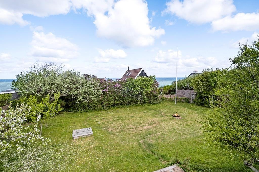 Haven er indrammet af buske og træer, der skaber en privat atmosfære, hvor du kan nyde ferien i fred og ro. Der er både plads til at ligge på græsplænen og nyde solen eller slappe af i havestolene på terrassen. Når vejret er godt, kan frokosten nydes i solskinnet på terrassen, der ligger i forlængelse af køkkenet.