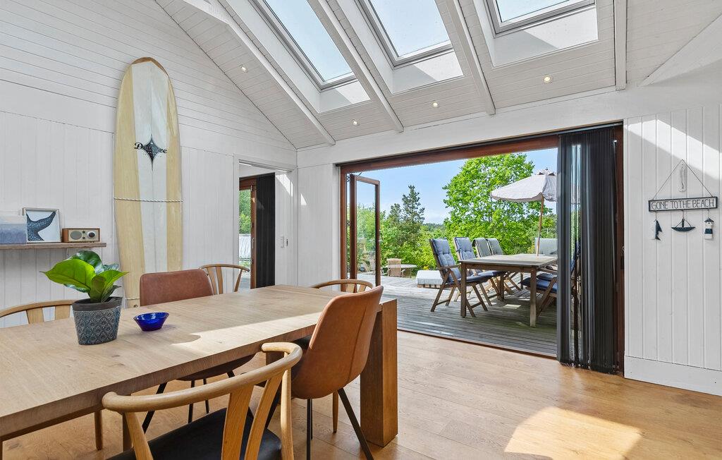 Dette moderne feriehus tilbyder en lys, åben atmosfære med lækre indretningsløsninger og masser af plads til at slappe af. Tilbring tiden i den smagfulde opholdsstue med brændeovn, et stort sofaområde og direkte adgang til terrassen. Spil bordfodbold eller minibordtennis, og brug det moderne køkken med køkkenø til at lave mad sammen. Den tilstødende spisestue med ovenlysvinduer tilbyder en lys atmosfære. Forkæl jer selv med afslappende timer i spabadet og saunaen.