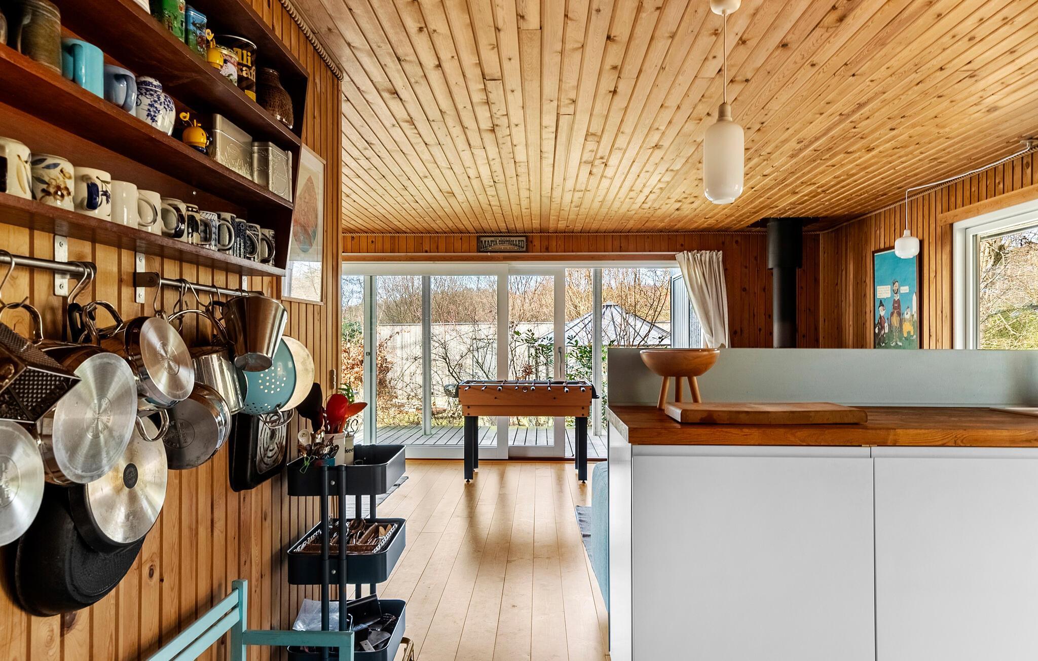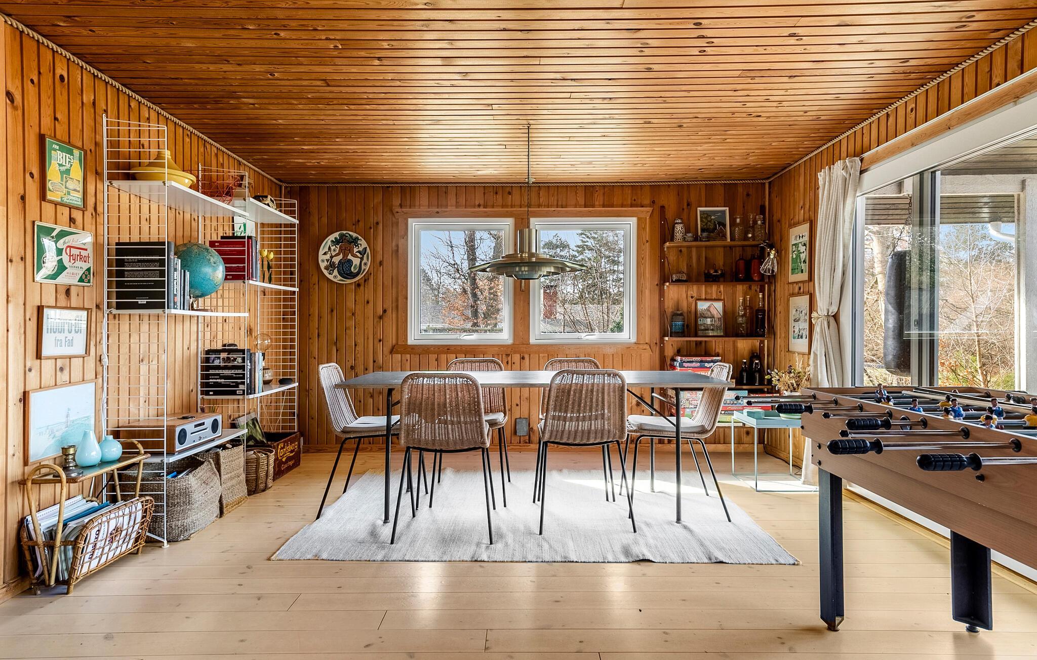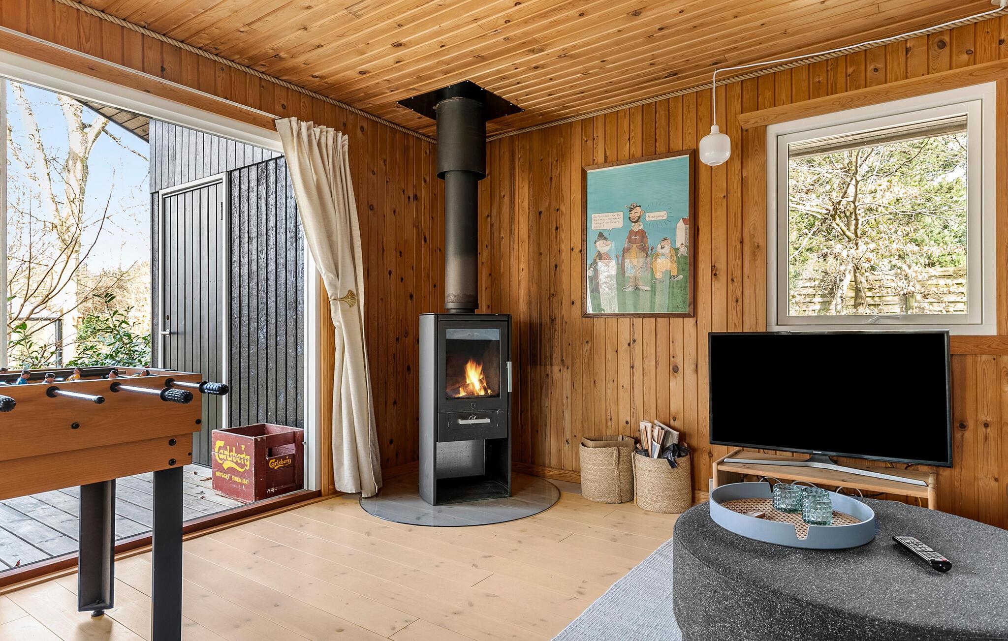 I dette smukt indrettede feriehus hersker en hjemlig atmosfære, som hurtigt får alle i feriestemning. Begynd dagene med morgenmad ved det stilfulde spisebord og tag jer god tid, mens solen langsomt oplyser haven udenfor. Børnene vil garanteret kaste sig over bordfodboldbordet. I mellemtiden kan I finde jer godt til rette på sofaen i stuen. Snup et spil kort sammen eller læs en god bog, mens brændeovnen sørger for hyggelig varme på kølige dage.
