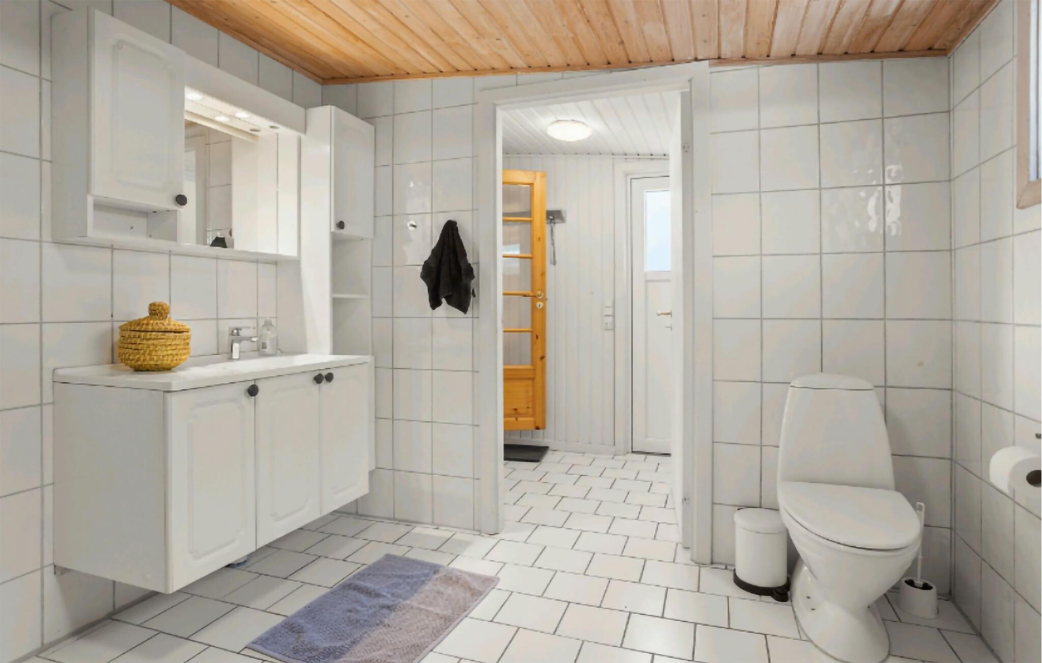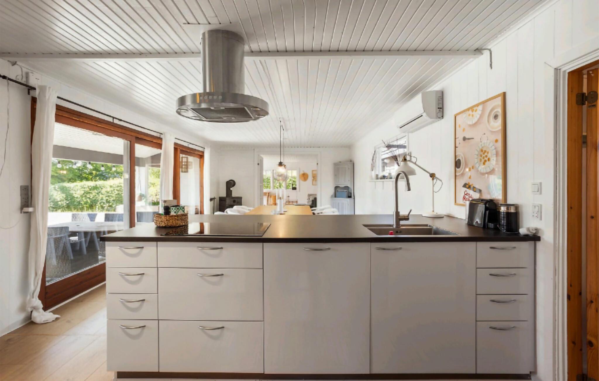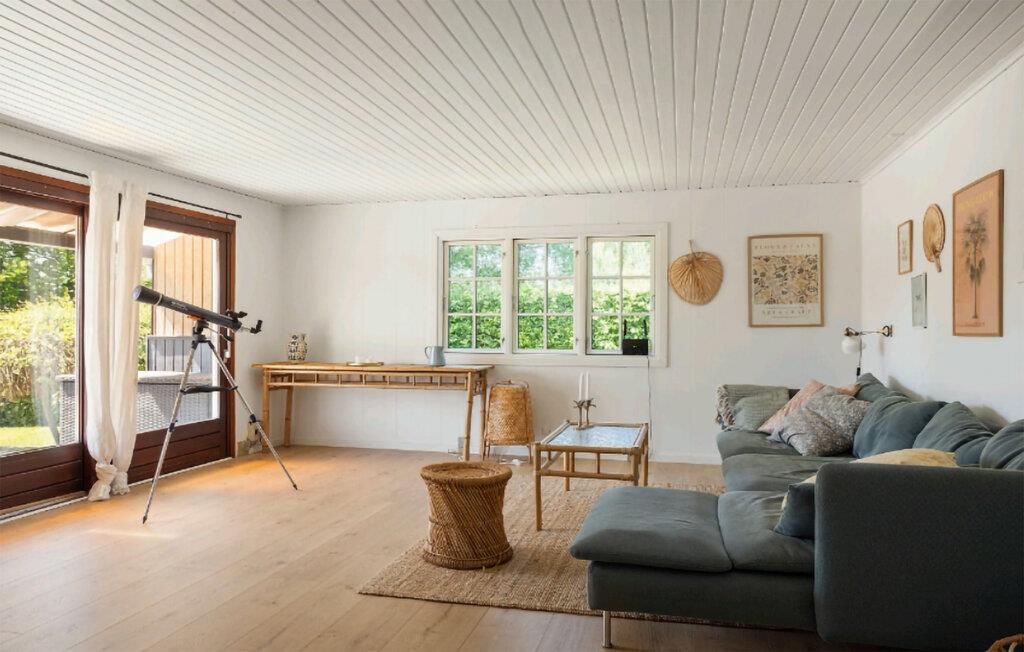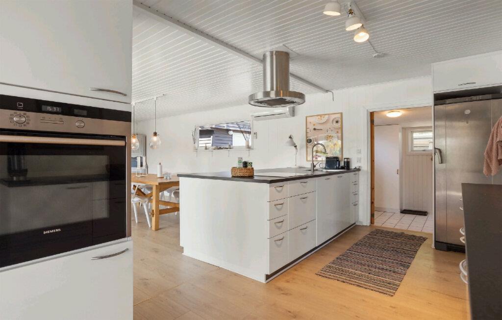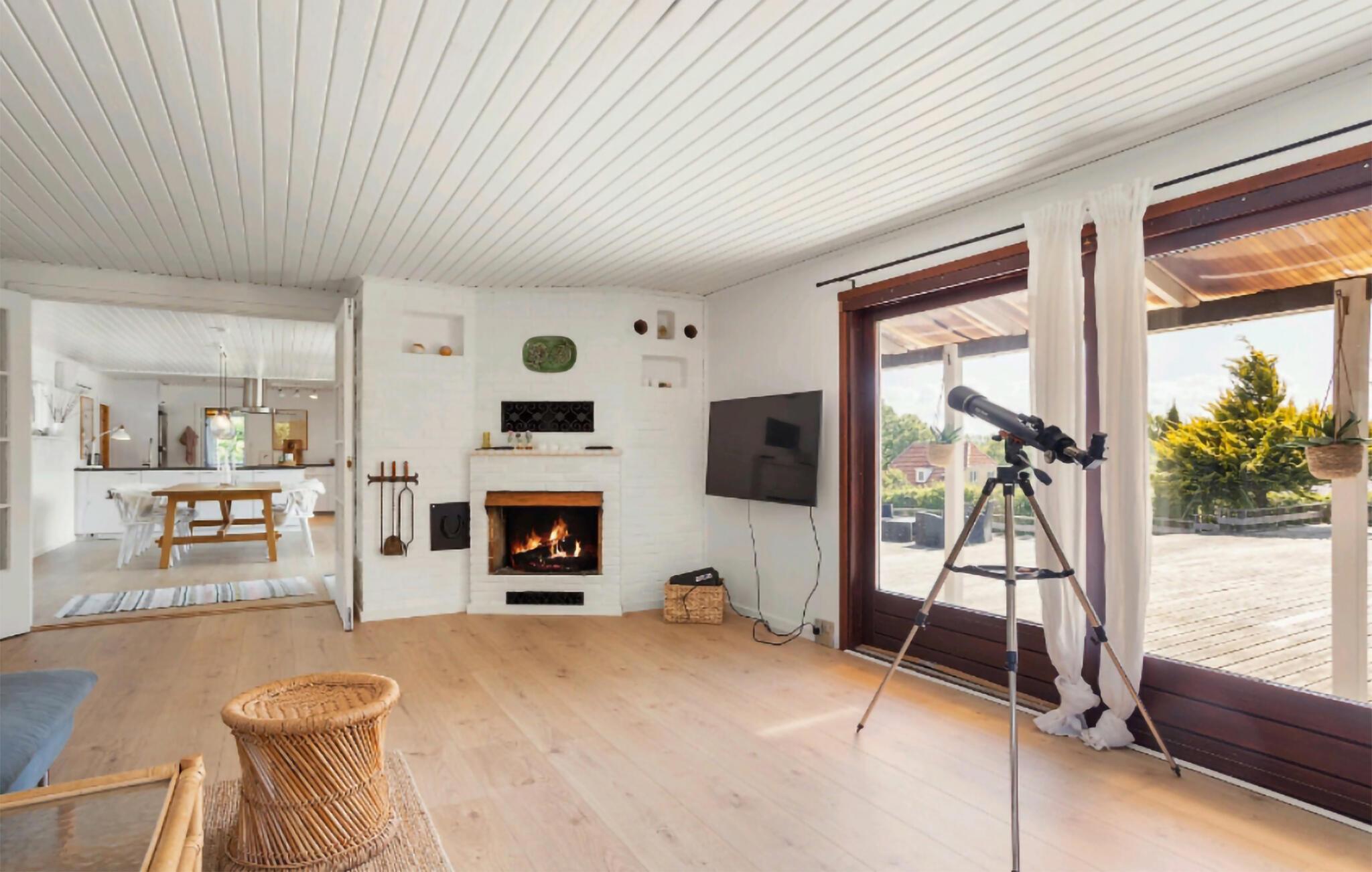 Huset er dejligt lyst at træde ind i. Læn jer godt tilbage i den rummelige opholdsstue og nyd den hyggelige varme fra brændeovnen. Tilbered jeres måltider i det moderne køkken med kogeø og nyd dem ved det store spisebord. De store vinduer lukker masser af lys ind i rummene og skaber en behagelig, åben atmosfære.