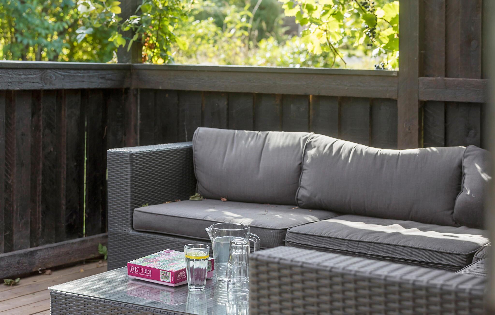 Den overdækkede terrasse og den dejlige have indbyder til solbadning og afslapning i sommermånederne, og her vil I bruge mange timer med en god bog eller en spændende podcast i ørerne.