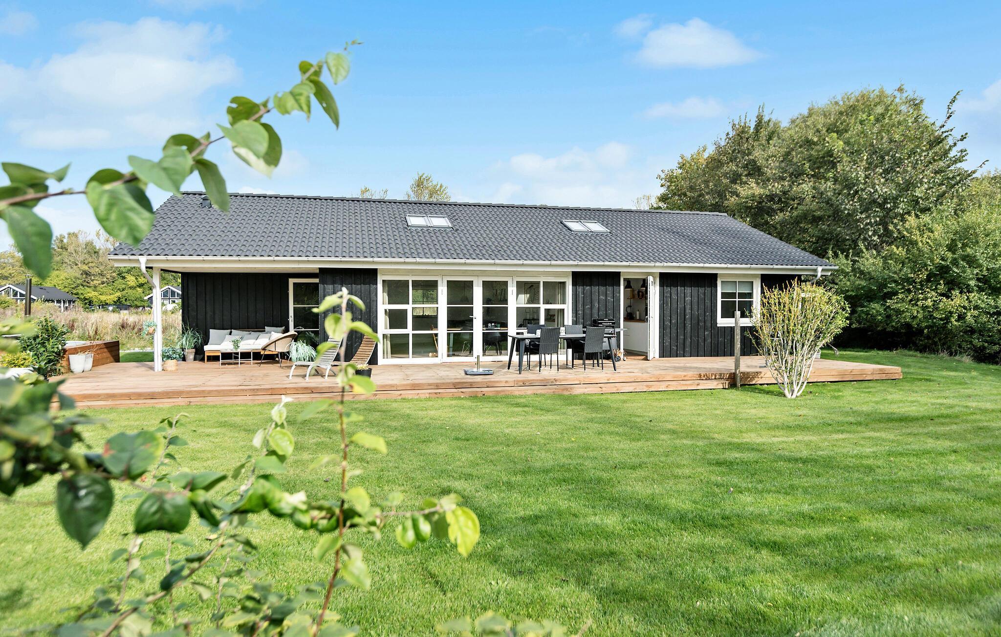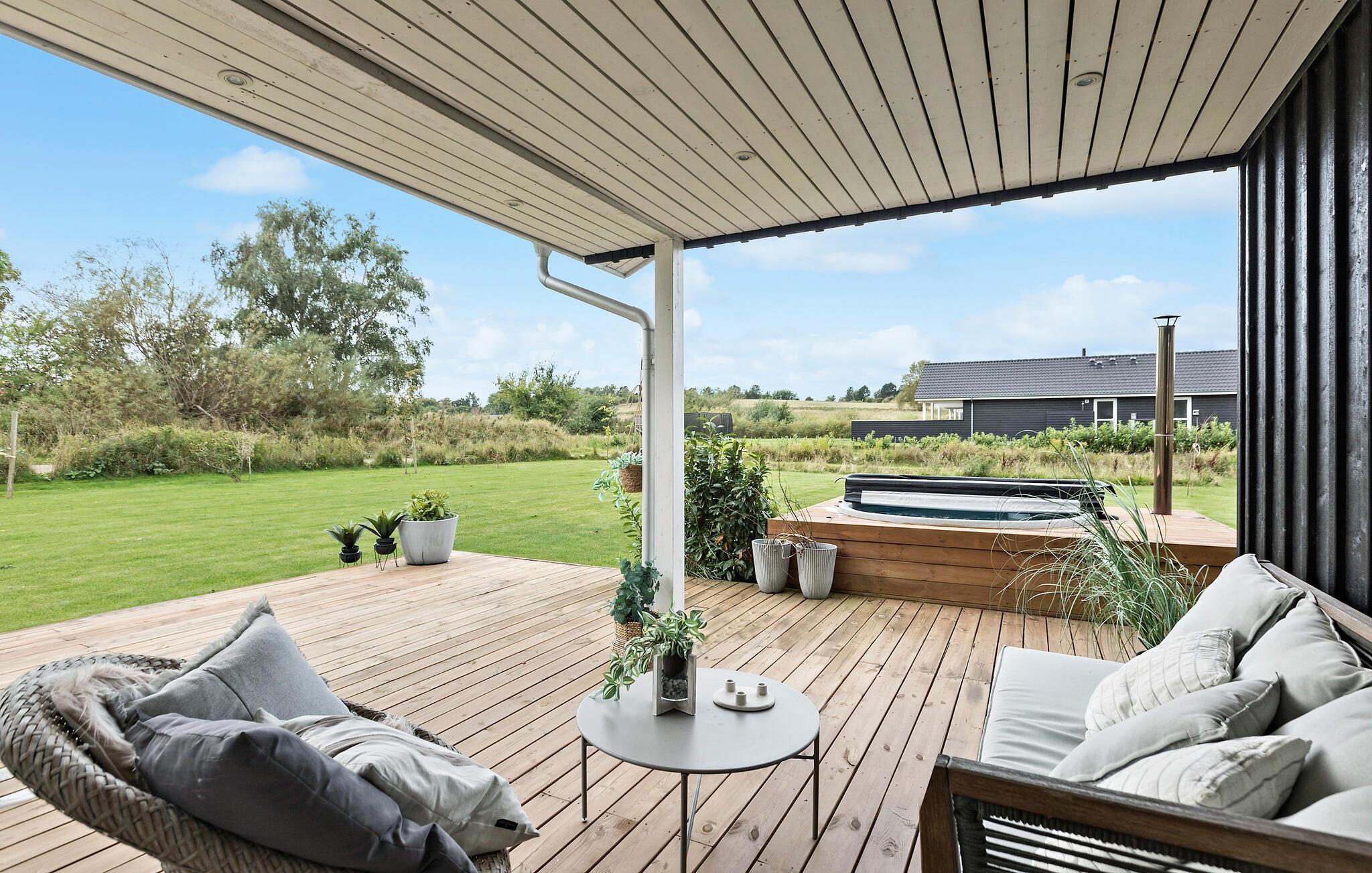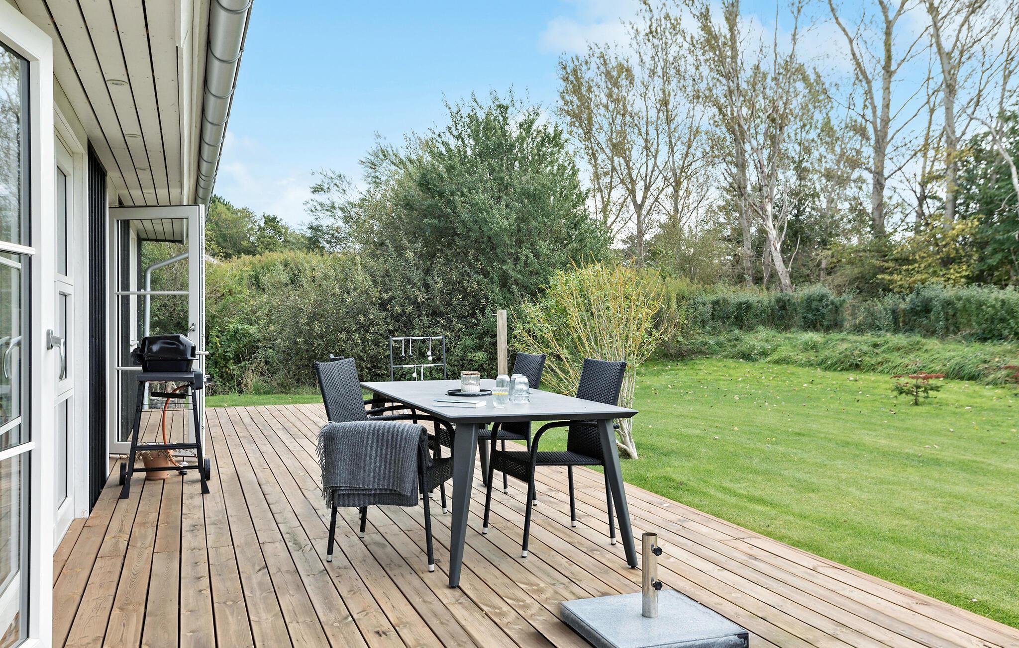 På den rummelige træterrasse kan I slappe af i det indbyggede finske vildmarksbad og nyde den friske luft. Leg spil i haven, eller nyd solen, mens familiens grillmester forbereder aftensmaden. Uanset om det er sommer eller vinter, tilbyder dette nye feriehus det perfekte miljø til en afslappende pause – kun få minutters gang fra vandet og Heatherhill.
