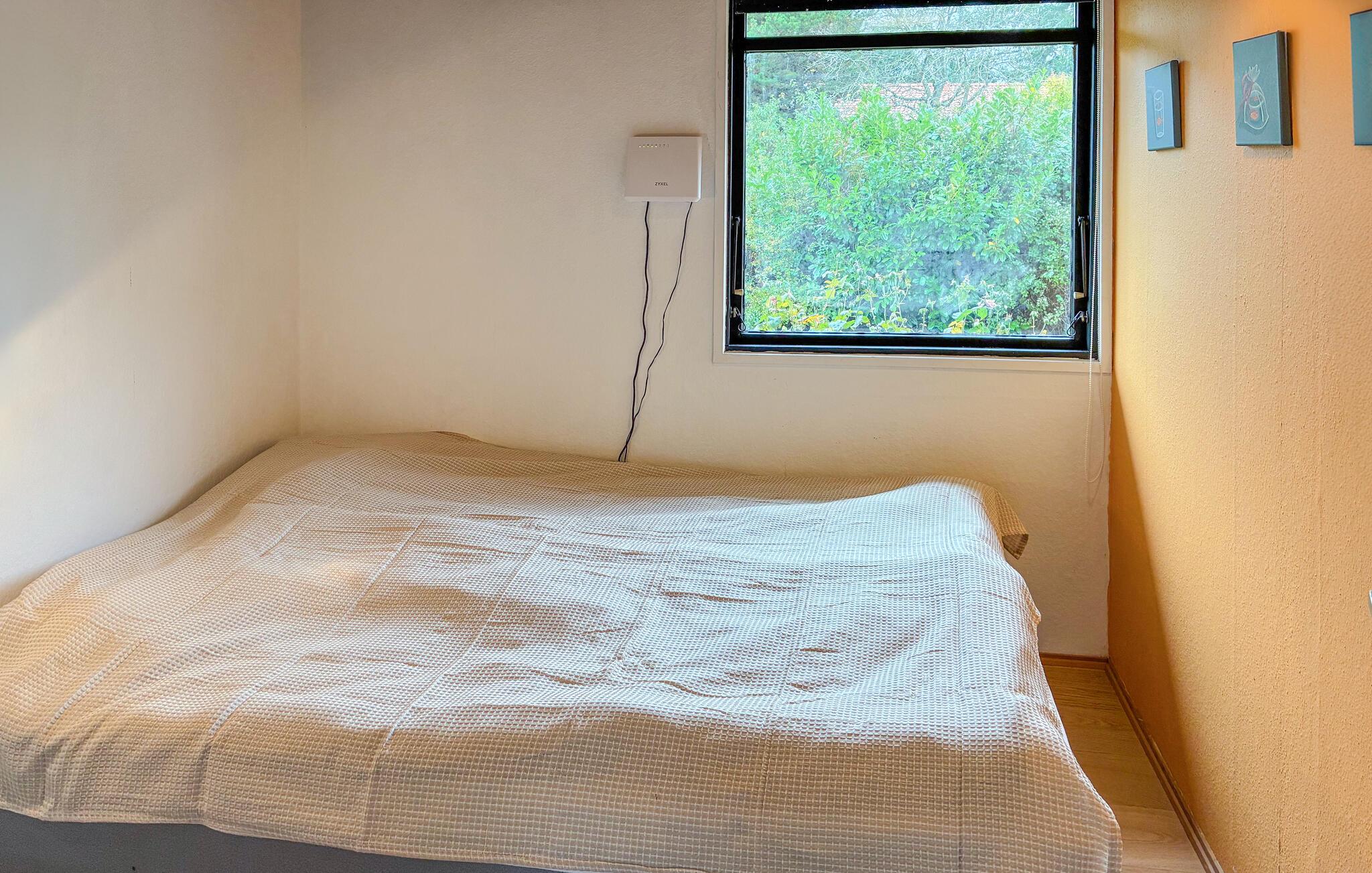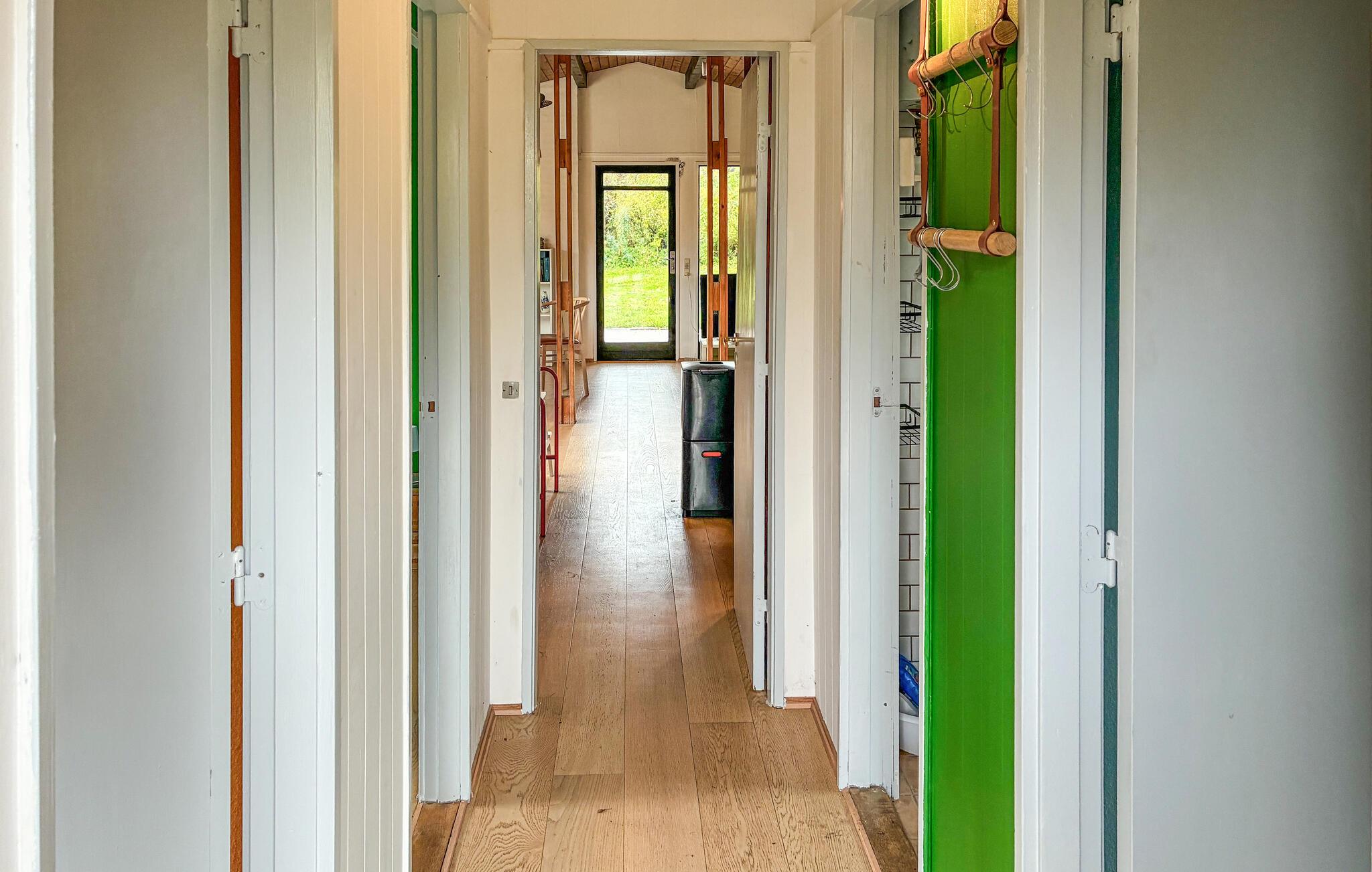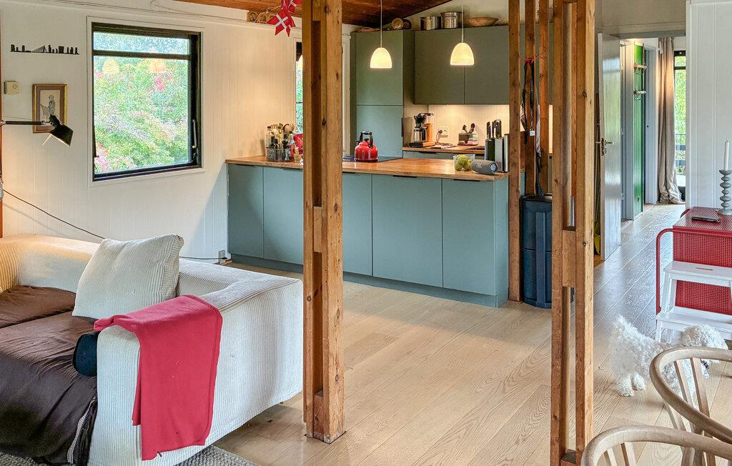 Oplev en rolig ferie i dette hyggelige feriehus, der byder jer velkommen med en varm atmosfære og masser af lys. Nyd det åbne opholds- og spiseområde med store vinduer og udsigt til haven. Hyg jer sammen i sofahjørnet, læs en god bog, eller tilbring aftenerne med hyggesnak og sjove spil. Spisepladsen med sine stilfulde lamper skaber en indbydende stemning, og det moderne køkken med bordplade i træ har alt, hvad I behøver til fælles madlavning. Samspillet mellem lyse farver og naturlige materialer giver rummet en behagelig stemning.