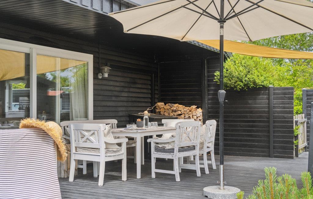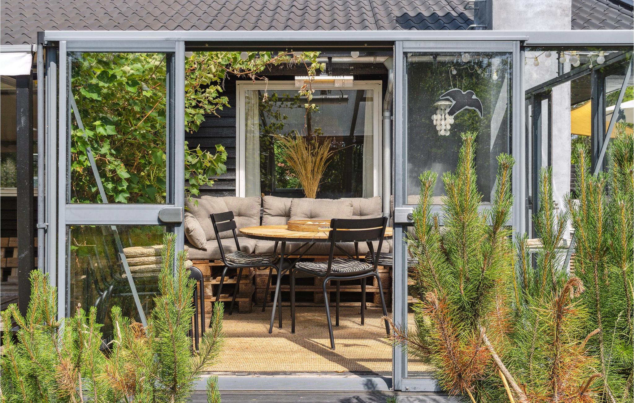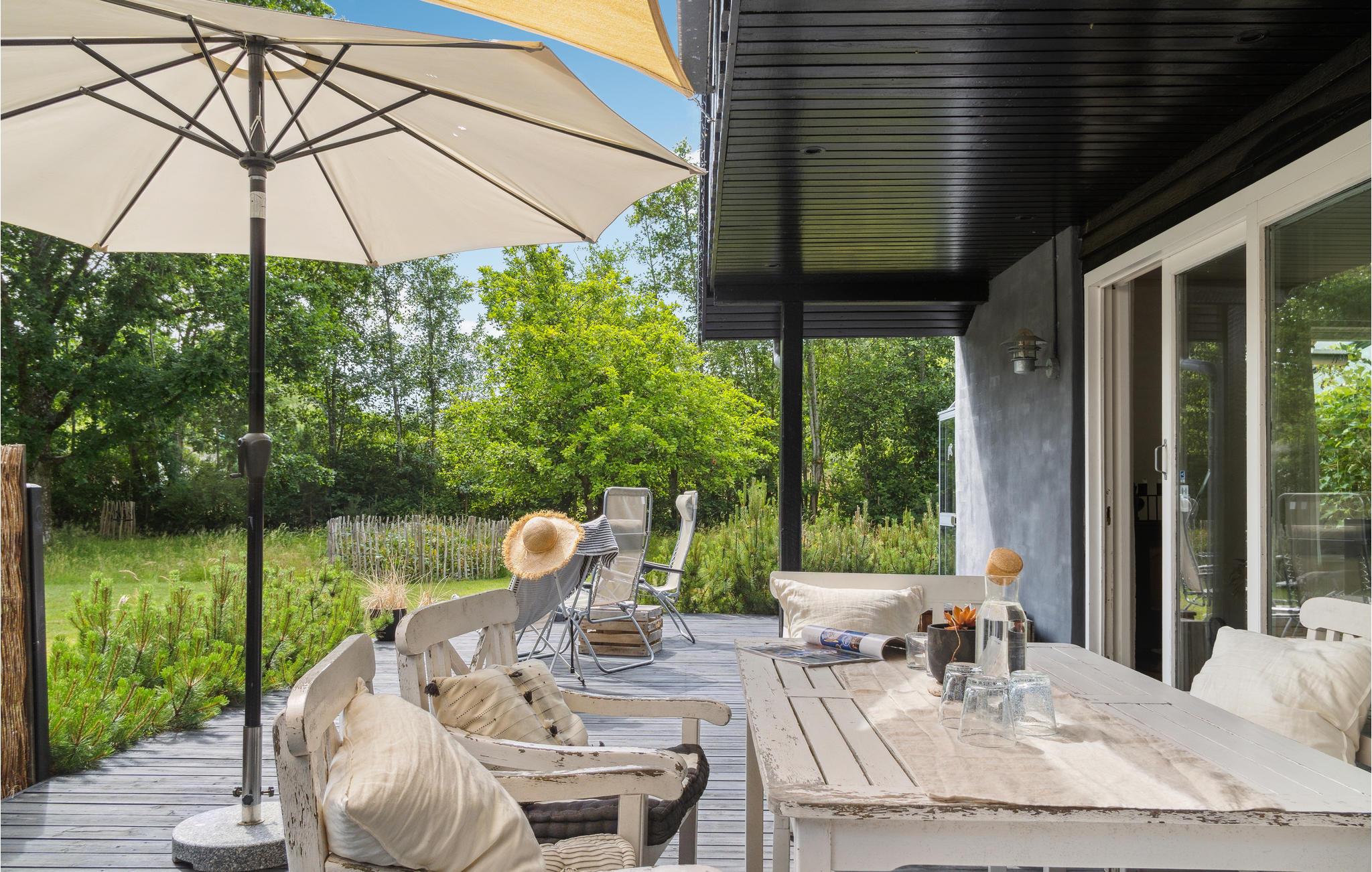 Fra opholdsstuen træder I ud på den store terrasse, hvor I kan nyde solskinnet til fulde. Spis måltiderne i det fri, slap i solen i haven i en behagelig liggestol, eller nyd en kold forfriskning i loungehjørnet.