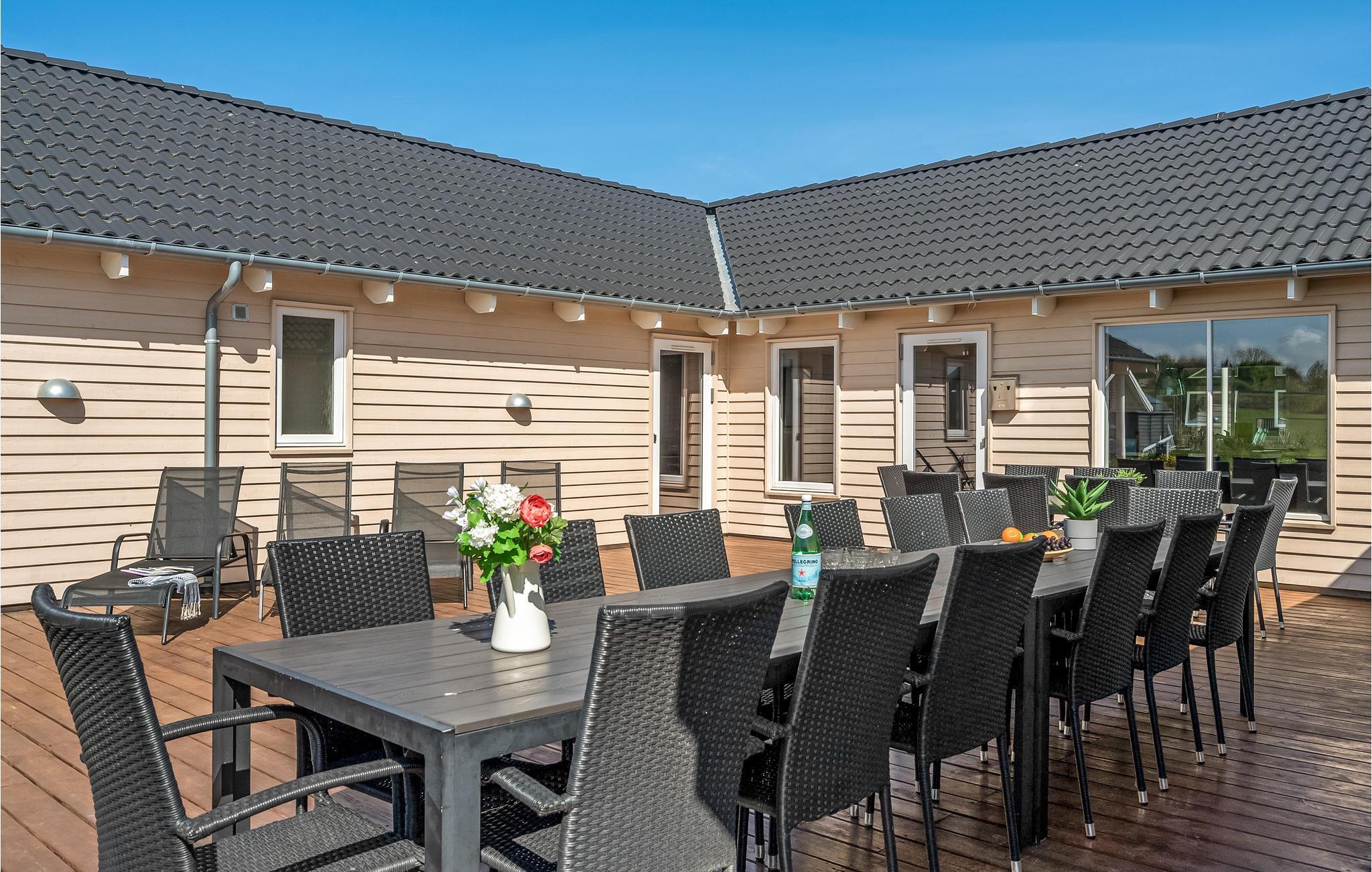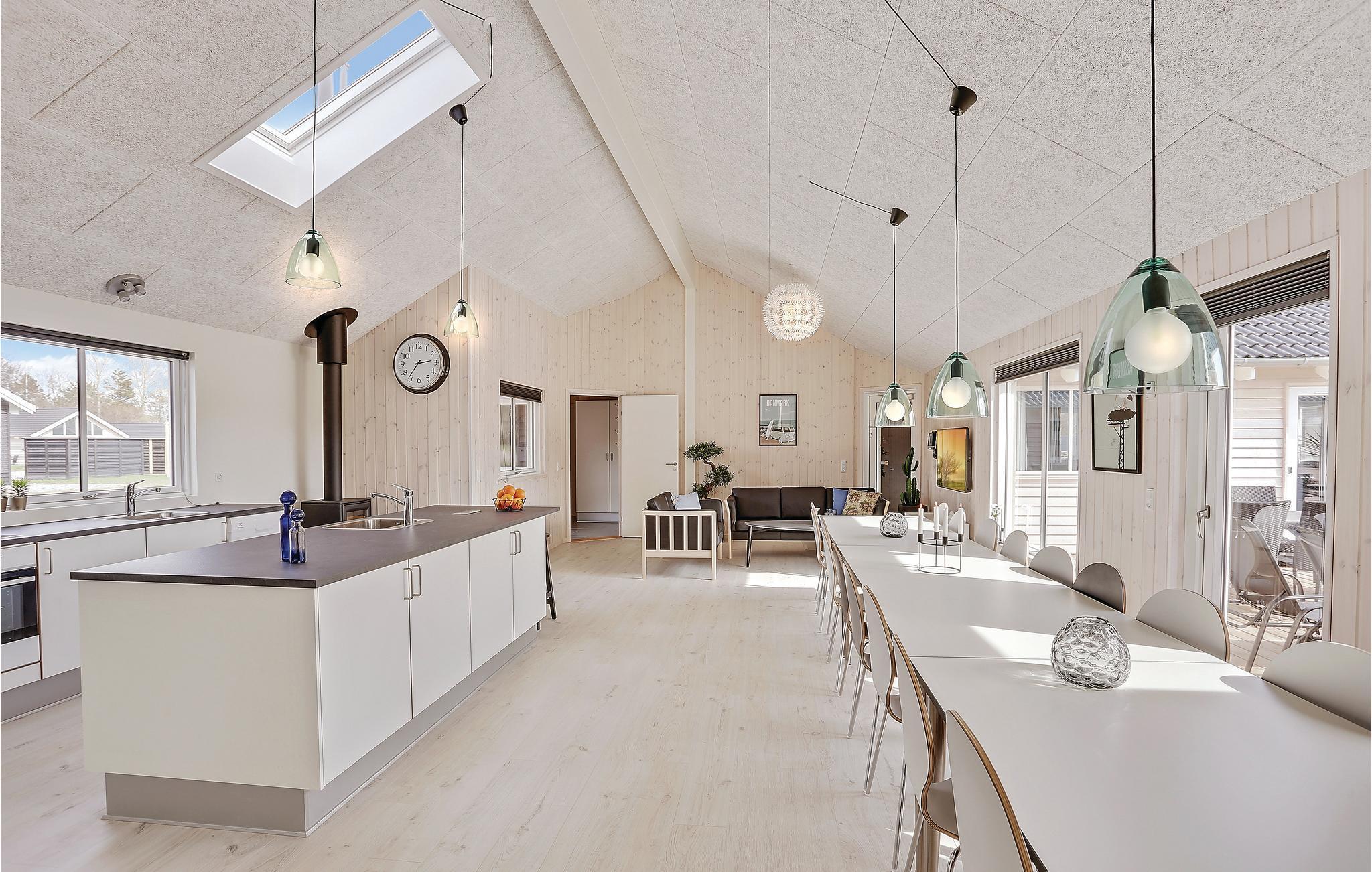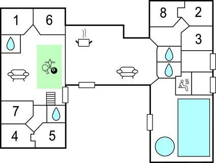 Her er rammerne skabt for en dejlig ferie med aktiviteter for hele familien. Det arkitekttegnede luksusferiehus har mange gode soveværelser fordelt på tre sektioner; hver sektion har et separat badeværelse, så flere familier kan nyde ferien sammen. Hertil kommer et aktivitetsrum med bordfodbold, billard, bordtennis og dart. Aktivitetsrummet ligger lige ved siden af den store stue med direkte adgang til køkkenet. I poolrummet kan I boltre jer både i poolen og i det fire personers spabad. Herfra er også adgang til saunaen. Adgang til poolrummet er børnesikret med et håndtag, der er placeret højt på døren samt en lås, således at husets yngste gæster ikke kan komme alene ud i rummet.