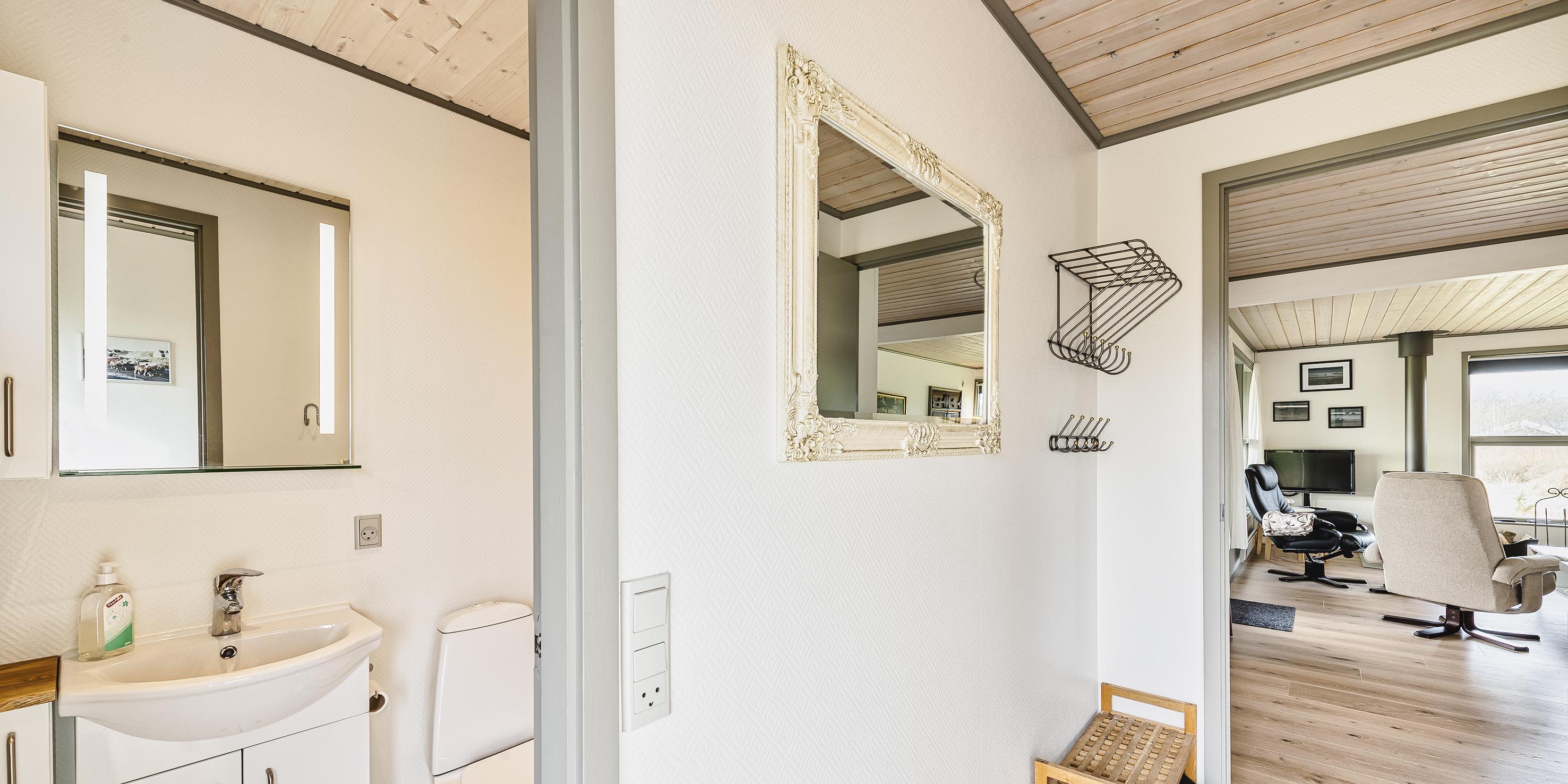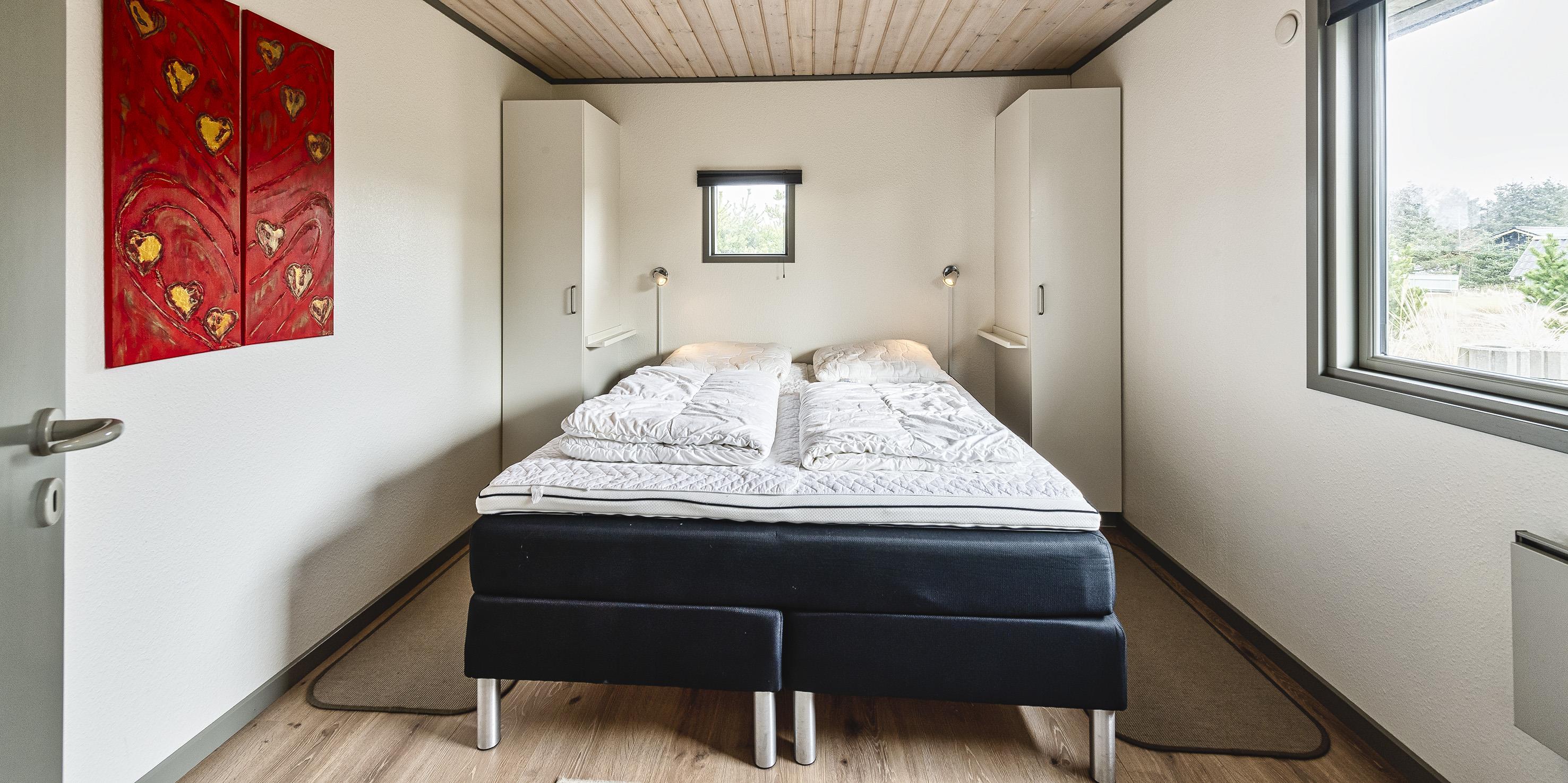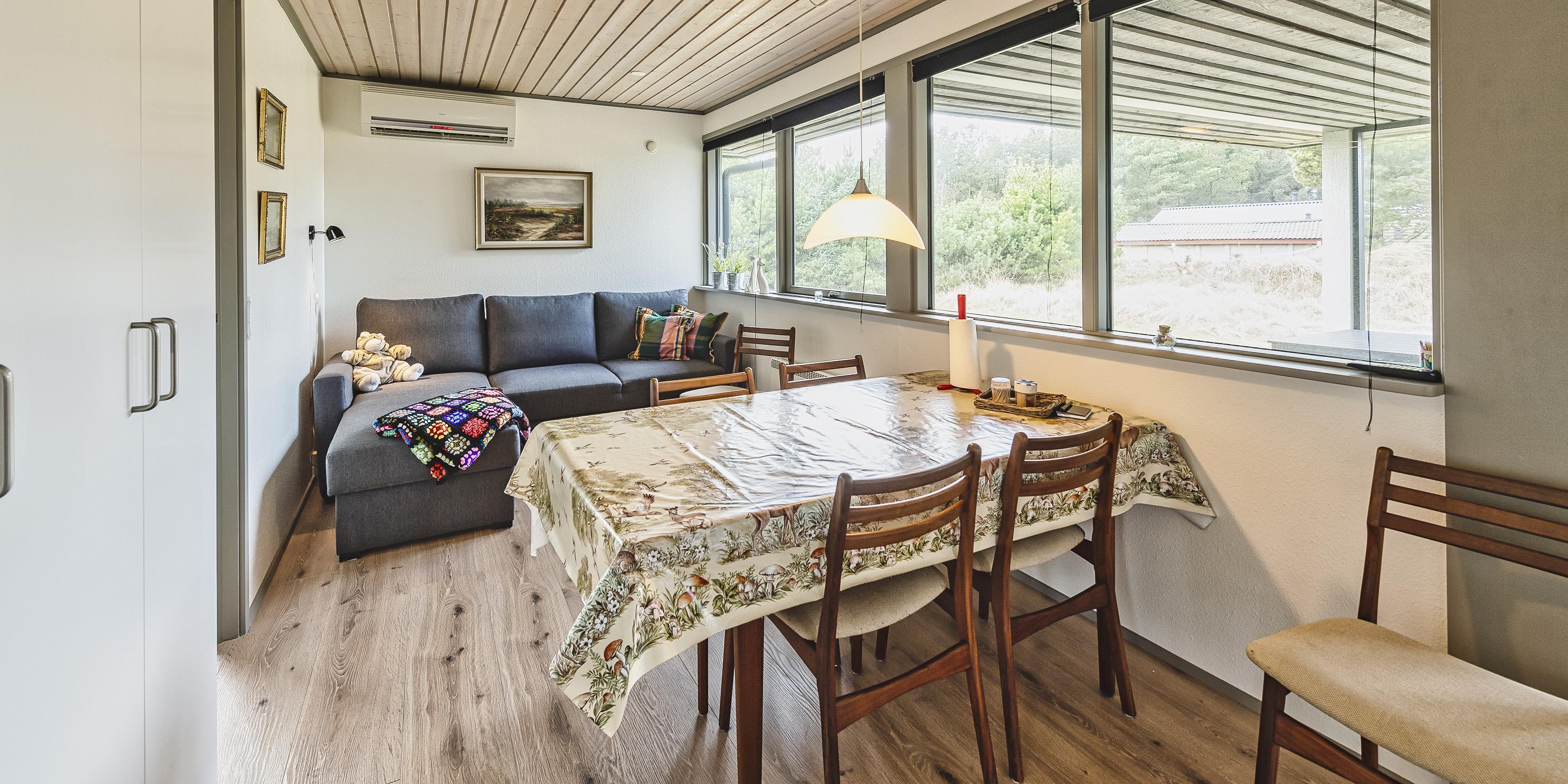 Charmerende sommerhus til 4-6 Vejers fan beliggende på en dejlig ugeneret naturgrund, ca. 900 meter fra stranden. Huset indeholder: Lille entre med indgang til stort opholdsrum. Det åbne opholdsrum er opdelt i spisestue og opholdstue med køkkenet imellem. Opholdsstuen er hyggeligt indrettet med udsigt til brændeovn, radio, fjernsyn med Stofa-Tv pakke, DVD-afspiller og trådløs internet. Spisestuen er indrettet med spiseplads, sovesofa og varmepumpe, fra spisepladsen er der udkig til den overdækkede terrasse som haven. Åbent køkken med køle-/frysekombination, mikroovn og opvaskemaskine. Fra spisestuen er der indgang til 1 soveværelse med 1 dobbeltseng. Fra entreen er der adgang til nyrenoveret (2021) badeværelse med vaskearrangement, bruser, wc og gulvvarme. 1 rummeligt soveværelse med dobbeltseng, klædeskabe og en saftyboks. 2 soveværelser: DS + DS. Anneks til f.eks. cykler. Rundt om huset er der flisebelagt, mod vest forefindes en stor delvis overdækket terrasse. Den store græsudlagte have indbyder til bold og leg. Ungdomsgrupper er ikke tilladt. Der er tilladt med max. 1 hund - katte er ikke tilladt. Rygning er ikke tilladt. Byggeår 1973, renoveret løbende.