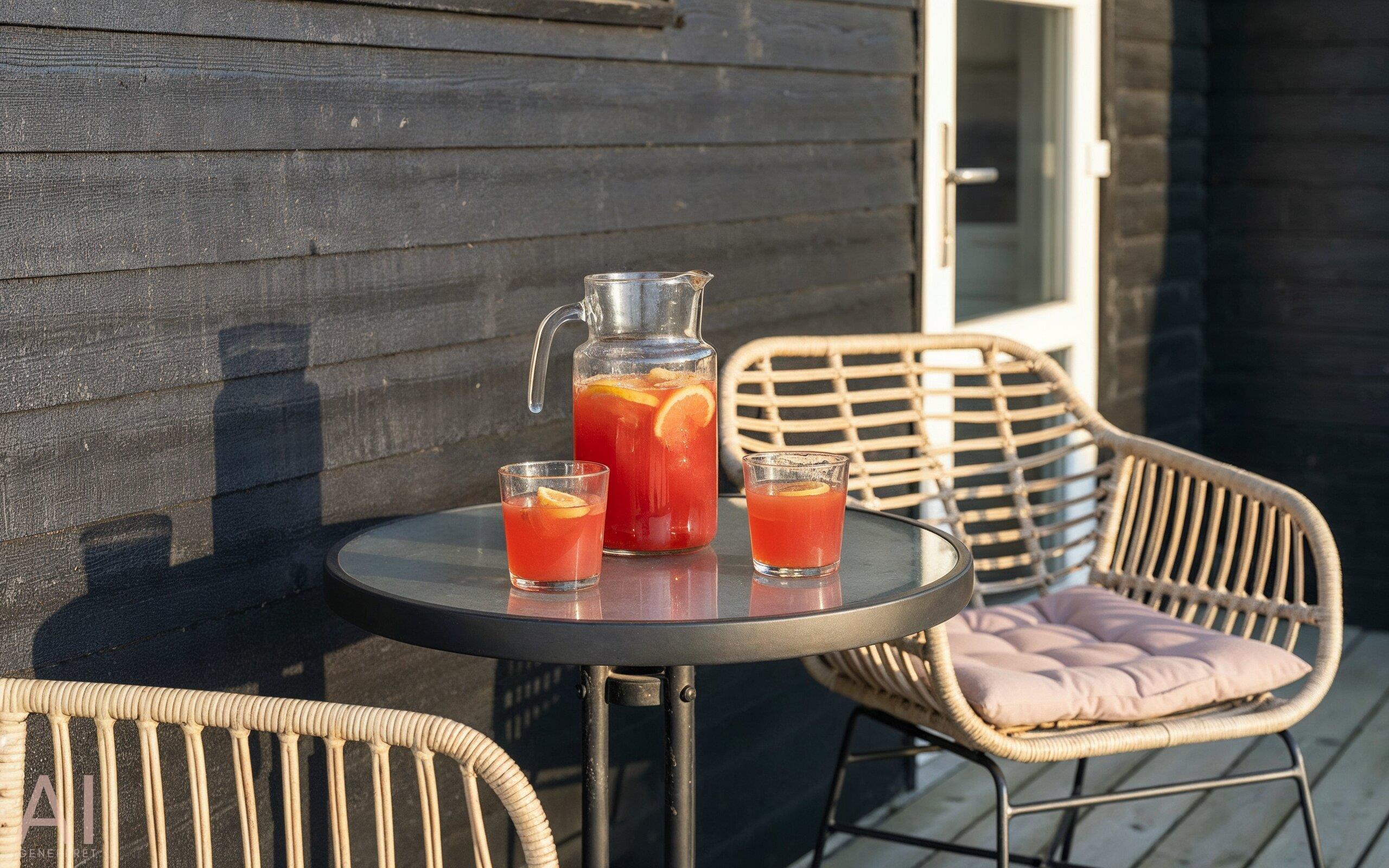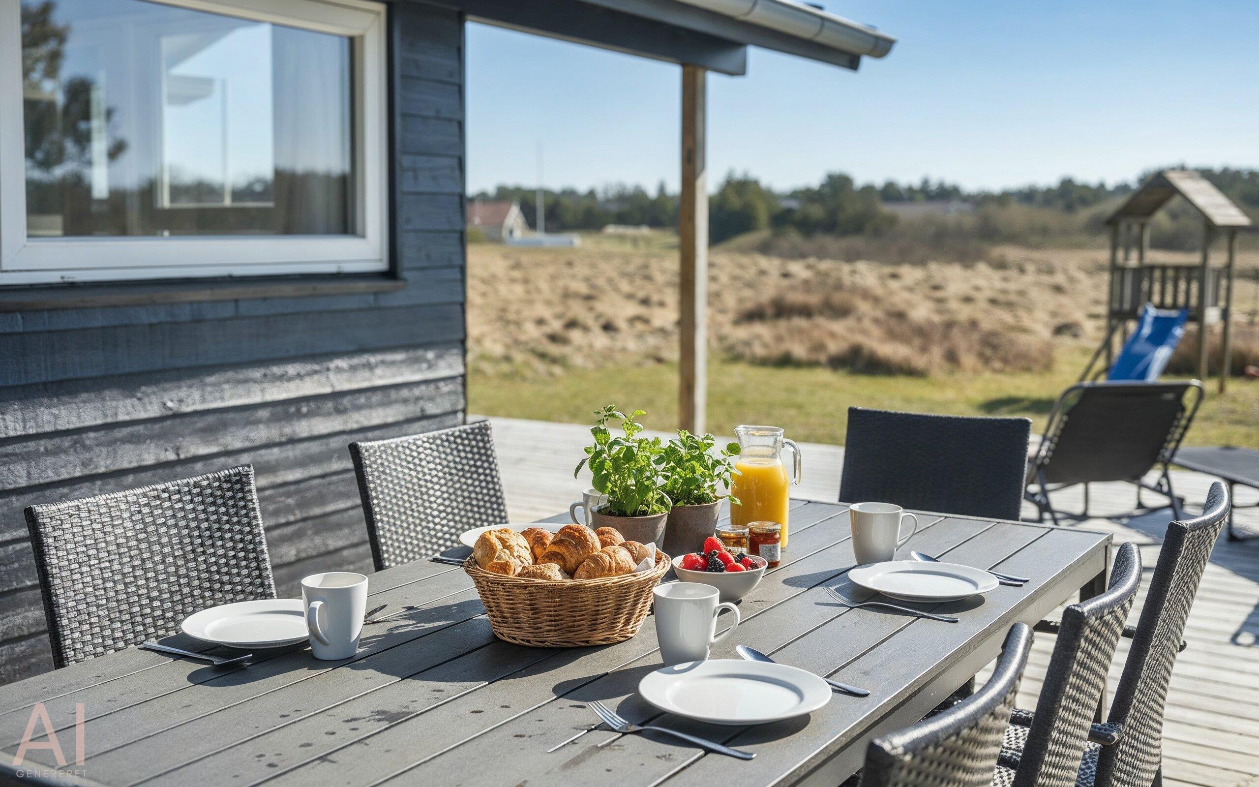 Udenfor finder I en stor, velindrettet terrasse mod syd, hvor I kan nyde solen hele dagen. Her er også en havegrill, så I kan tilberede lækre måltider i det fri, omgivet af husets 1600 m² store naturgrund.