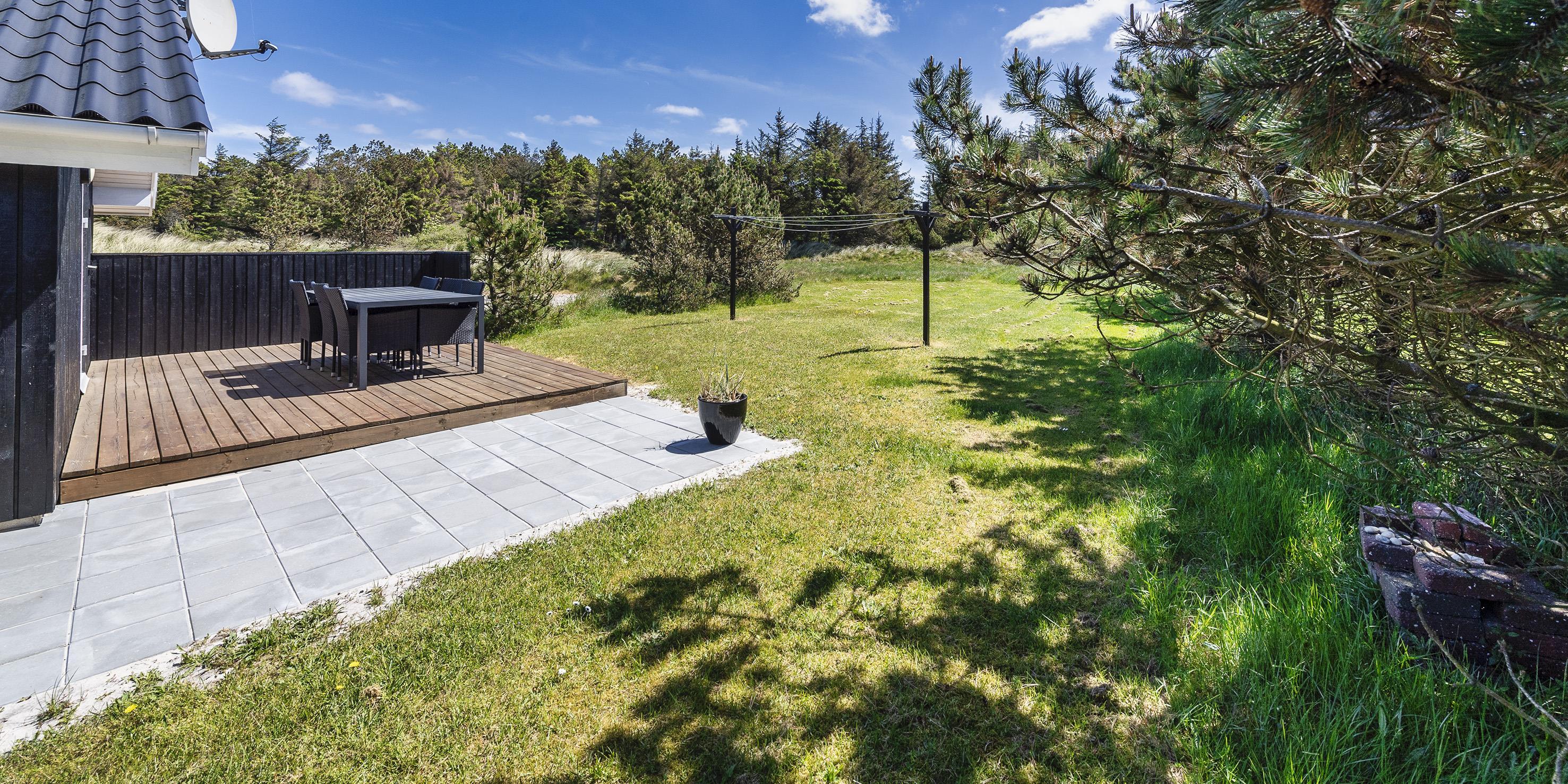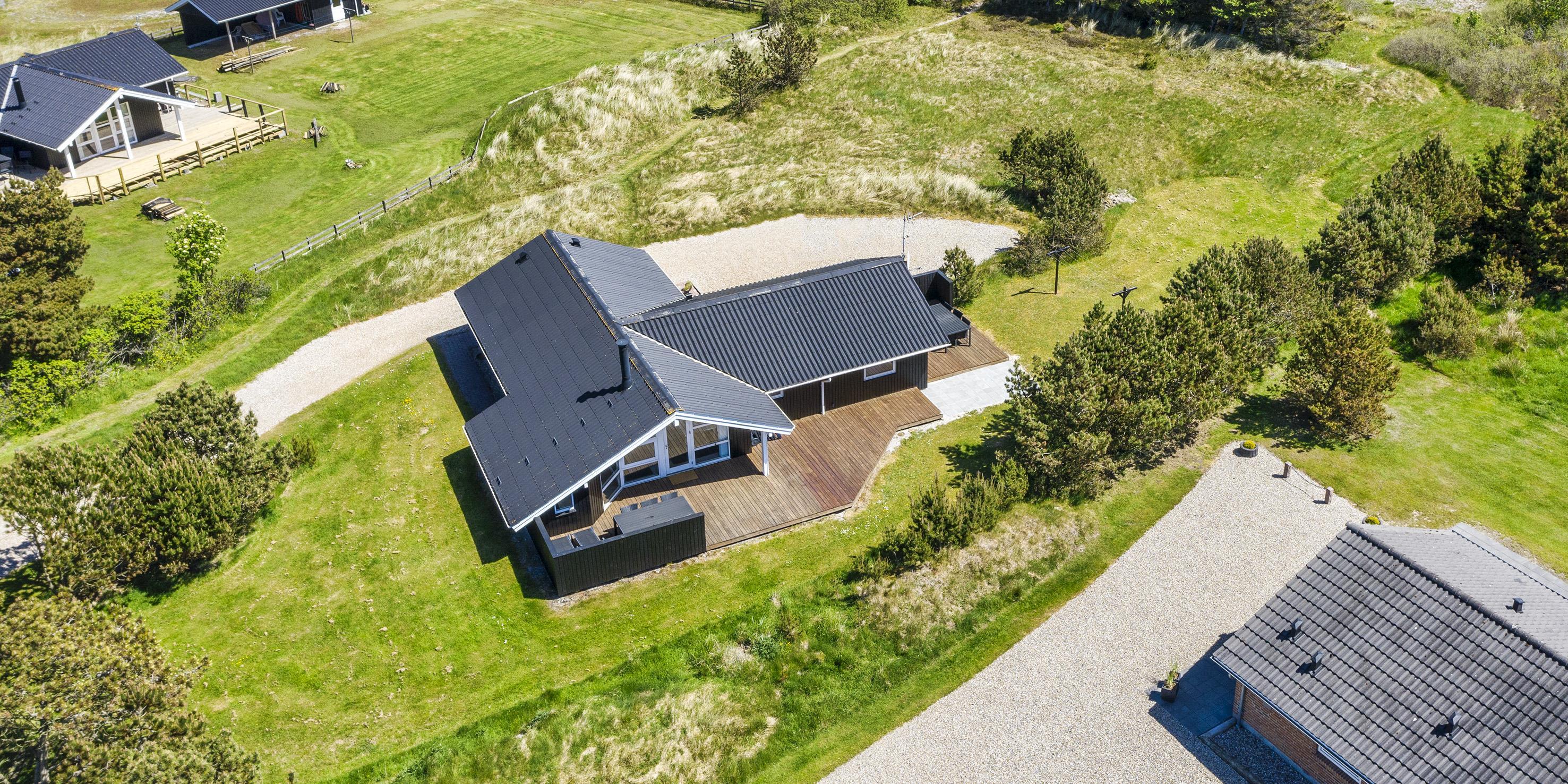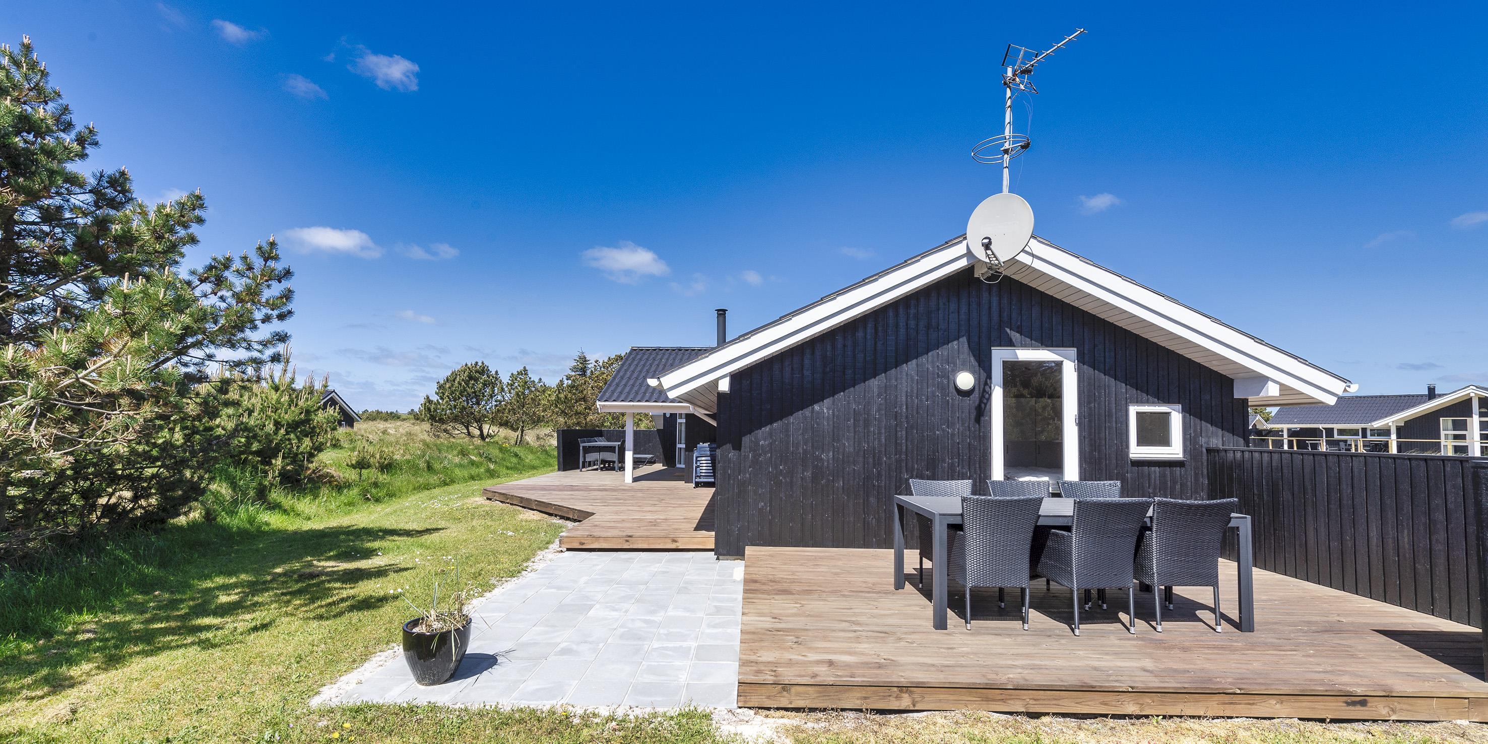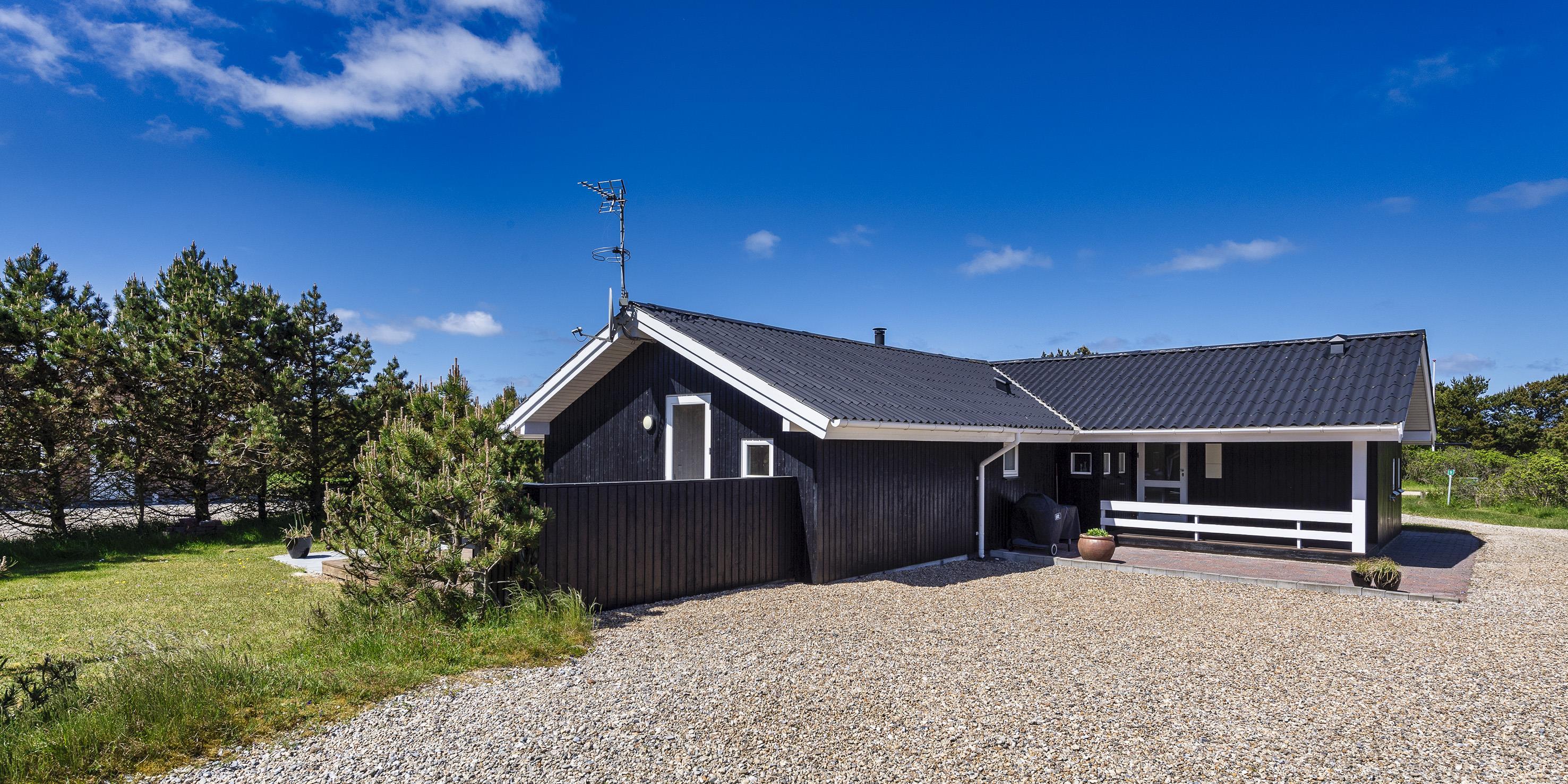 Smagfuldt og nyrenoveret sommerhus beliggende på åben stor naturgrund. Huset er udstyret til 6 personer og stranden ligger ca. 1 km fra huset. Hele feriehuset er lyst indvendigt og dejligt indrettet. Stuen har komfortabelt opholdsområde med pejs. I et hjørne i stuen er der en alkove. Her kan du trække dig tilbage og slappe af, eller bare læse en spændende bog i fred og ro. Der er installeret en lille lampe til dette formål. Der er varmepumpe i huset. Med denne varmepumpe har du mulighed for at reducere elomkostningerne, fordi varmepumpen er energibesparende. Køkkenområdet er moderne og udstyret med komfur med keramisk kogeplade, ovn, opvaskemaskine, mikroovn og køleskab med fryser. Gæsterne har adgang til to dejlige badeværelser. Det ene badeværelse har toilet, håndvask, bruser, sauna og spa. Vaskemaskinen er også placeret i dette badeværelse. Det andet badeværelse har toilet, håndvask og bruser. I alt er der tre soveværelser i huset: DB + DB + 2B. To soveværelser har hver en dobbeltseng, og det sidste soveværelse er indrettet med to enkeltsenge. Det ydre indgangsparti er overdækket. Det samme gælder for en lille del af. Der er flere terrasseområder omkring huset, hvor man kan nyde solen eller en skøn grillaften. (Huset har grill som kan benyttes om sommeren). Feriehuset har internetforbindelse (W-Lan) og Smart-Tv. Huset er bygget i 1995 og pænt renoveret i 2016. Gynge til de små børn. Byens centrum ligger kun få minutters kørsel fra feriehuset, som byder på flere restauranter, et bageri, et pizzeria, 2 købmandsforretninger, en iscafé og meget mere. Byens centrum kan også nemt nås til fods. Huset ligger direkte i udkanten af skoven. Der er også en skovsti, der kun kan benyttes af fodgængere og cyklister, så man kan komme fra Vejers Strand til Grærup Strand og Henne Strand.