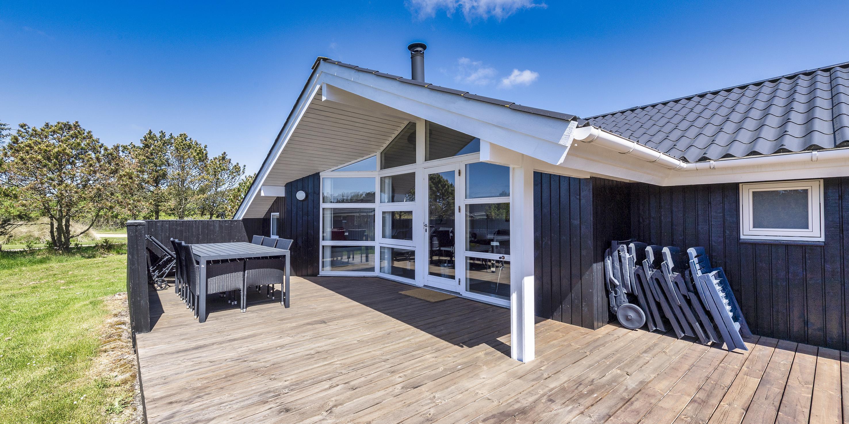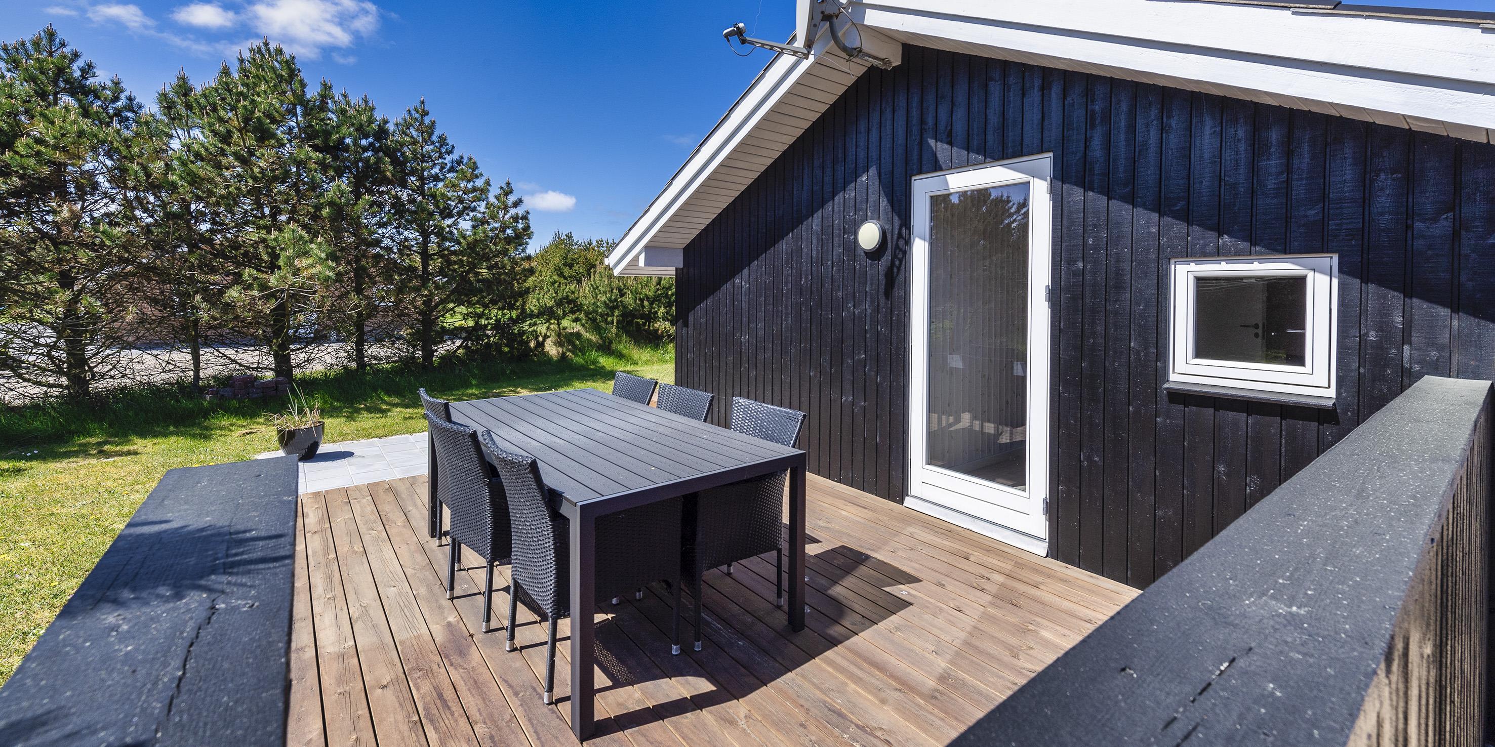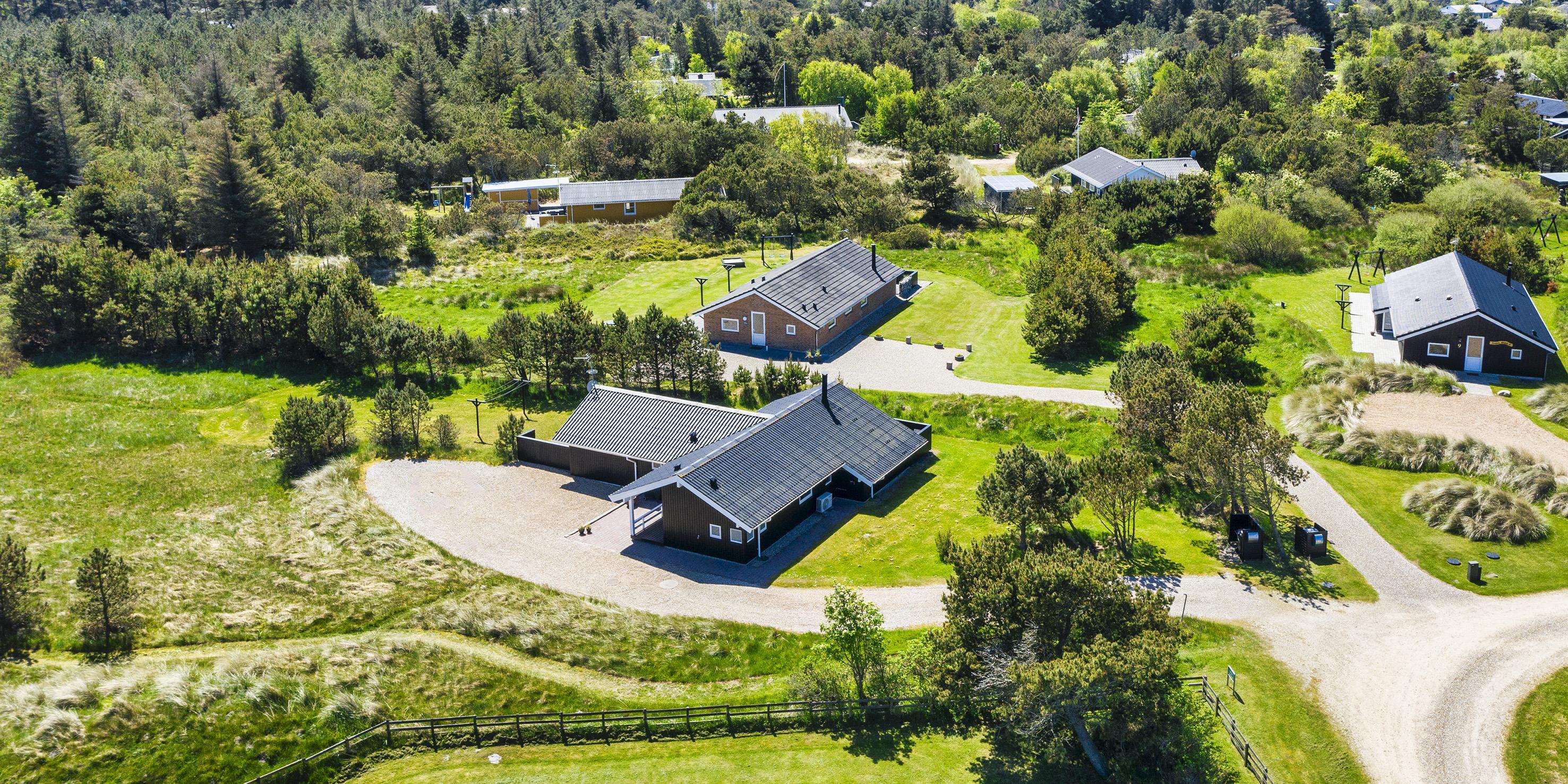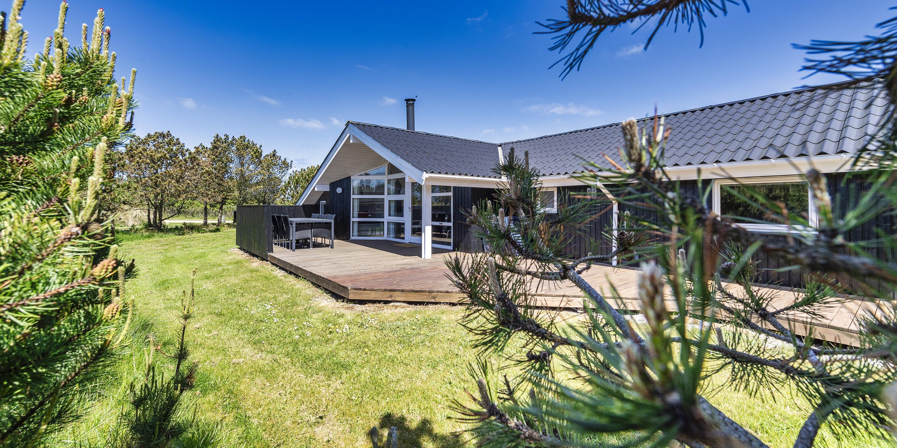 Smagfuldt og nyrenoveret sommerhus beliggende på åben stor naturgrund. Huset er udstyret til 6 personer og stranden ligger ca. 1 km fra huset. Hele feriehuset er lyst indvendigt og dejligt indrettet. Stuen har komfortabelt opholdsområde med pejs. I et hjørne i stuen er der en alkove. Her kan du trække dig tilbage og slappe af, eller bare læse en spændende bog i fred og ro. Der er installeret en lille lampe til dette formål. Der er varmepumpe i huset. Med denne varmepumpe har du mulighed for at reducere elomkostningerne, fordi varmepumpen er energibesparende. Køkkenområdet er moderne og udstyret med komfur med keramisk kogeplade, ovn, opvaskemaskine, mikroovn og køleskab med fryser. Gæsterne har adgang til to dejlige badeværelser. Det ene badeværelse har toilet, håndvask, bruser, sauna og spa. Vaskemaskinen er også placeret i dette badeværelse. Det andet badeværelse har toilet, håndvask og bruser. I alt er der tre soveværelser i huset: DB + DB + 2B. To soveværelser har hver en dobbeltseng, og det sidste soveværelse er indrettet med to enkeltsenge. Det ydre indgangsparti er overdækket. Det samme gælder for en lille del af. Der er flere terrasseområder omkring huset, hvor man kan nyde solen eller en skøn grillaften. (Huset har grill som kan benyttes om sommeren). Feriehuset har internetforbindelse (W-Lan) og Smart-Tv. Huset er bygget i 1995 og pænt renoveret i 2016. Gynge til de små børn. Byens centrum ligger kun få minutters kørsel fra feriehuset, som byder på flere restauranter, et bageri, et pizzeria, 2 købmandsforretninger, en iscafé og meget mere. Byens centrum kan også nemt nås til fods. Huset ligger direkte i udkanten af skoven. Der er også en skovsti, der kun kan benyttes af fodgængere og cyklister, så man kan komme fra Vejers Strand til Grærup Strand og Henne Strand.