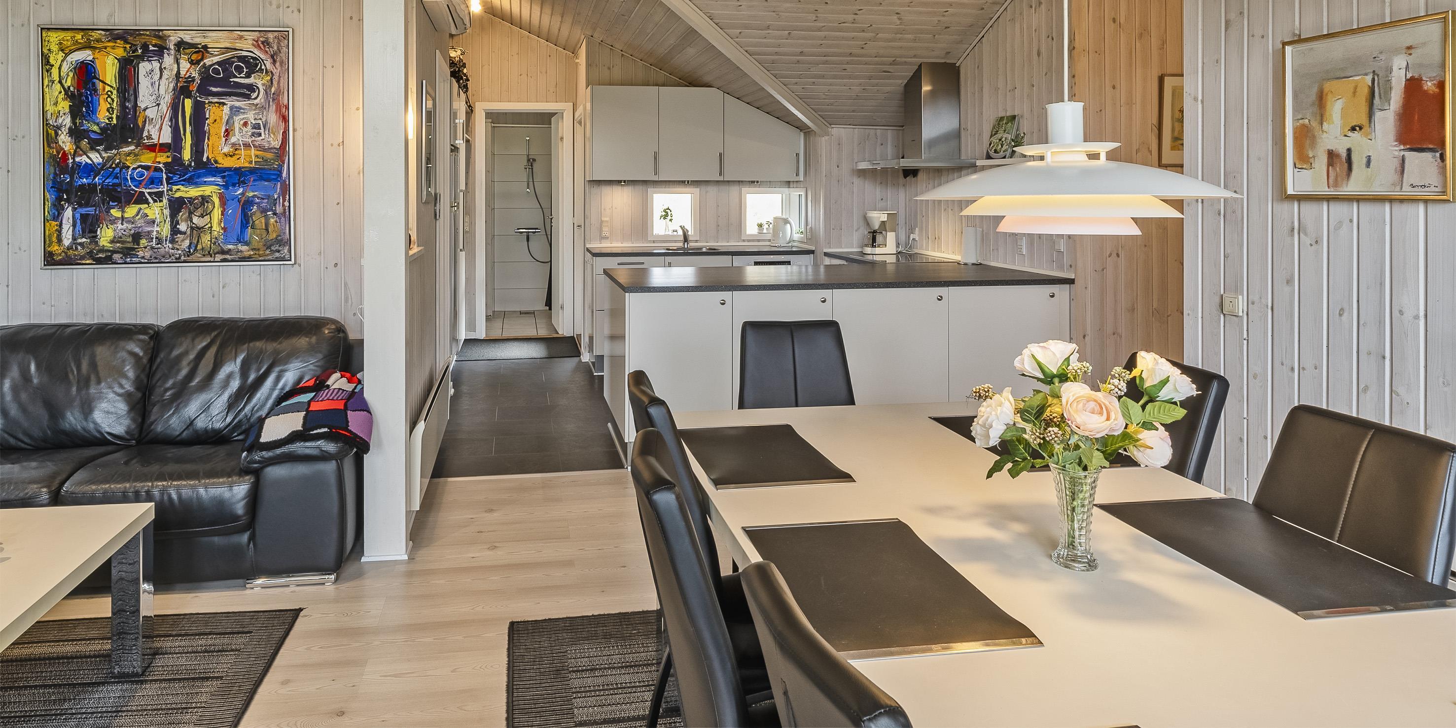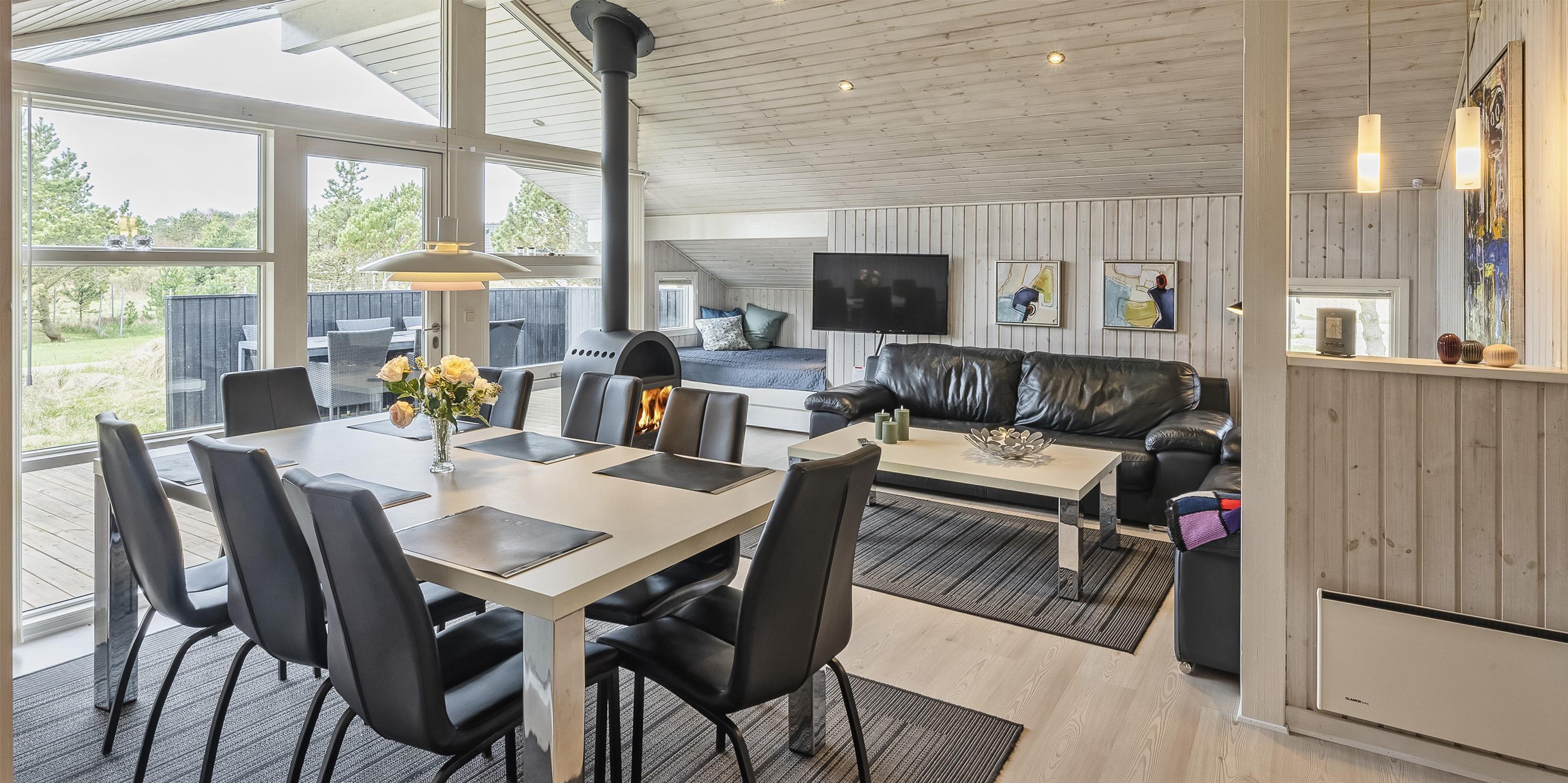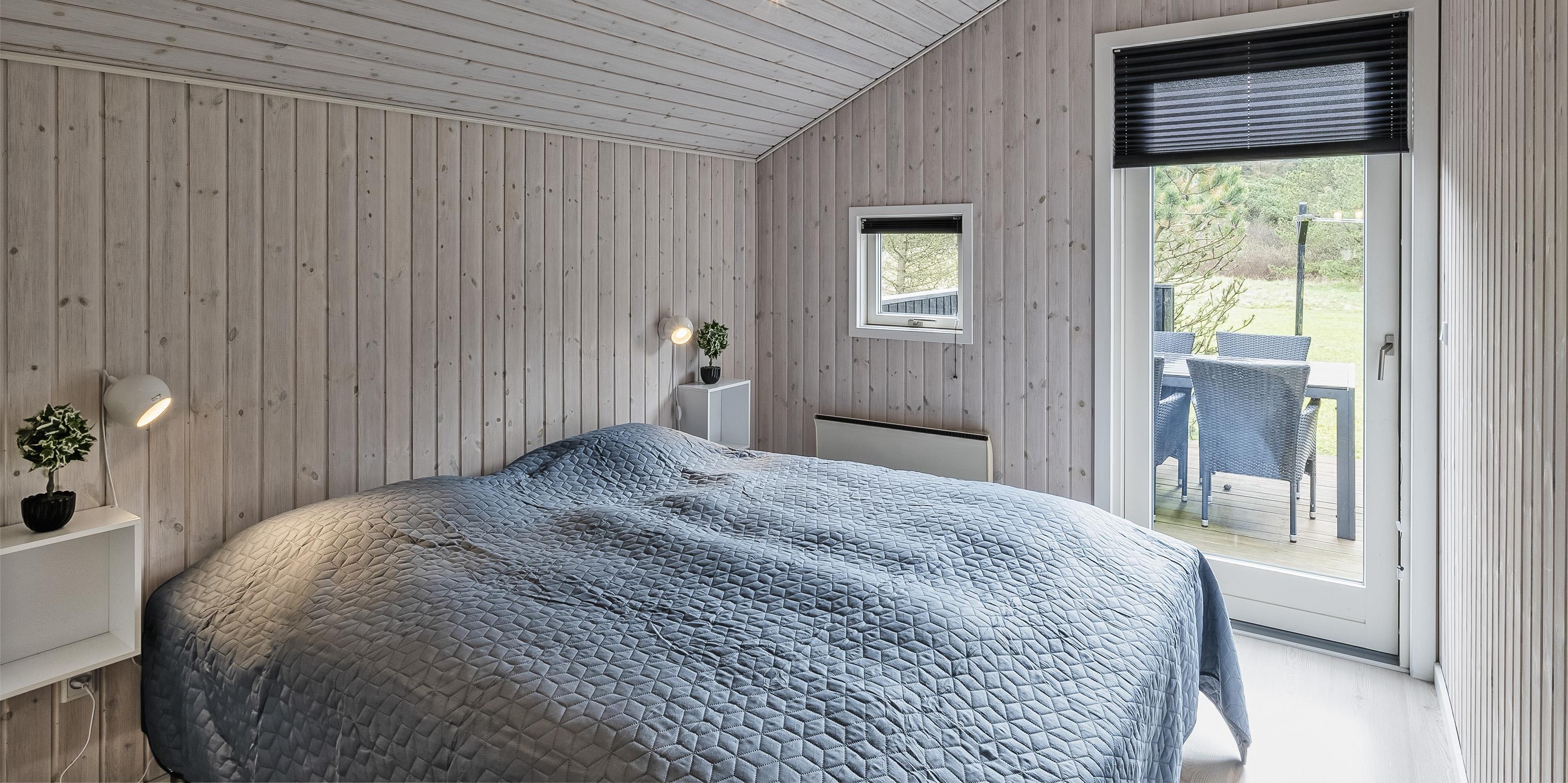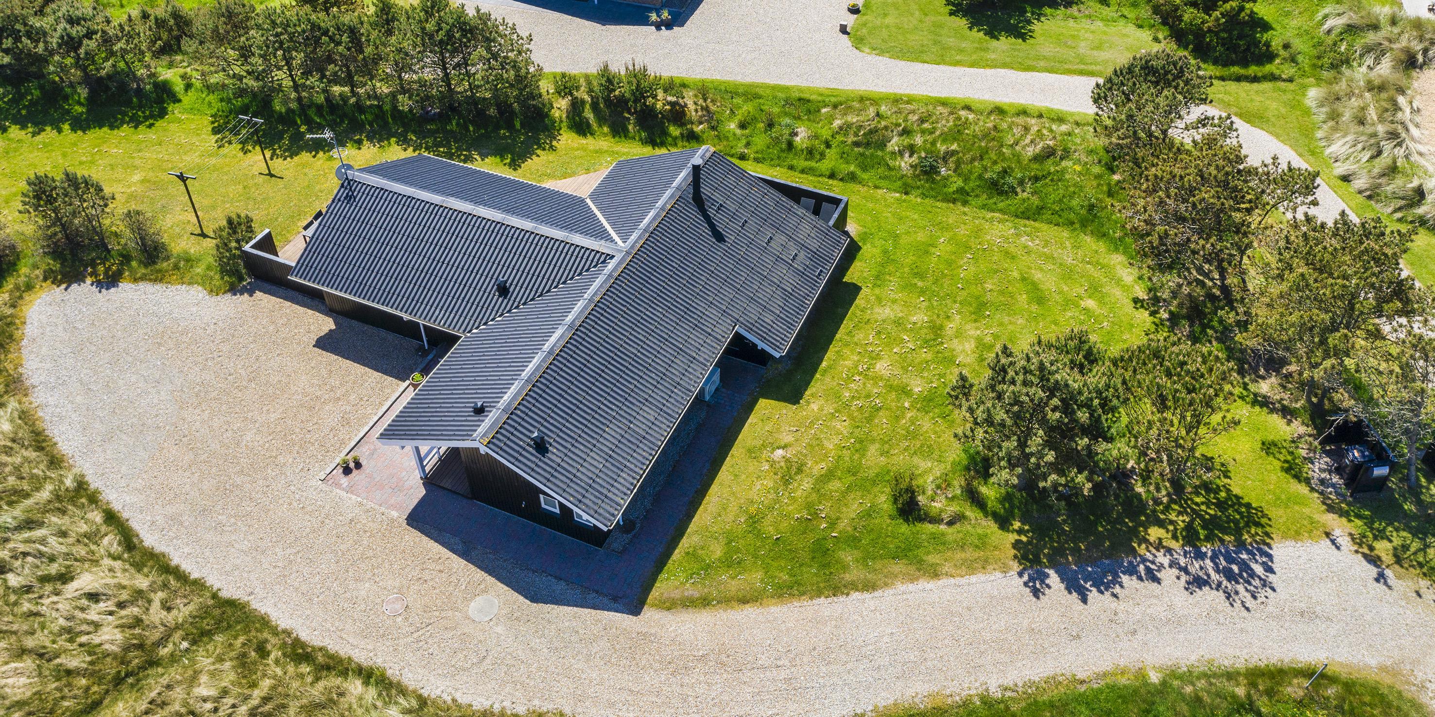 Smagfuldt og nyrenoveret sommerhus beliggende på åben stor naturgrund. Huset er udstyret til 6 personer og stranden ligger ca. 1 km fra huset. Hele feriehuset er lyst indvendigt og dejligt indrettet. Stuen har komfortabelt opholdsområde med pejs. I et hjørne i stuen er der en alkove. Her kan du trække dig tilbage og slappe af, eller bare læse en spændende bog i fred og ro. Der er installeret en lille lampe til dette formål. Der er varmepumpe i huset. Med denne varmepumpe har du mulighed for at reducere elomkostningerne, fordi varmepumpen er energibesparende. Køkkenområdet er moderne og udstyret med komfur med keramisk kogeplade, ovn, opvaskemaskine, mikroovn og køleskab med fryser. Gæsterne har adgang til to dejlige badeværelser. Det ene badeværelse har toilet, håndvask, bruser, sauna og spa. Vaskemaskinen er også placeret i dette badeværelse. Det andet badeværelse har toilet, håndvask og bruser. I alt er der tre soveværelser i huset: DB + DB + 2B. To soveværelser har hver en dobbeltseng, og det sidste soveværelse er indrettet med to enkeltsenge. Det ydre indgangsparti er overdækket. Det samme gælder for en lille del af. Der er flere terrasseområder omkring huset, hvor man kan nyde solen eller en skøn grillaften. (Huset har grill som kan benyttes om sommeren). Feriehuset har internetforbindelse (W-Lan) og Smart-Tv. Huset er bygget i 1995 og pænt renoveret i 2016. Gynge til de små børn. Byens centrum ligger kun få minutters kørsel fra feriehuset, som byder på flere restauranter, et bageri, et pizzeria, 2 købmandsforretninger, en iscafé og meget mere. Byens centrum kan også nemt nås til fods. Huset ligger direkte i udkanten af skoven. Der er også en skovsti, der kun kan benyttes af fodgængere og cyklister, så man kan komme fra Vejers Strand til Grærup Strand og Henne Strand.