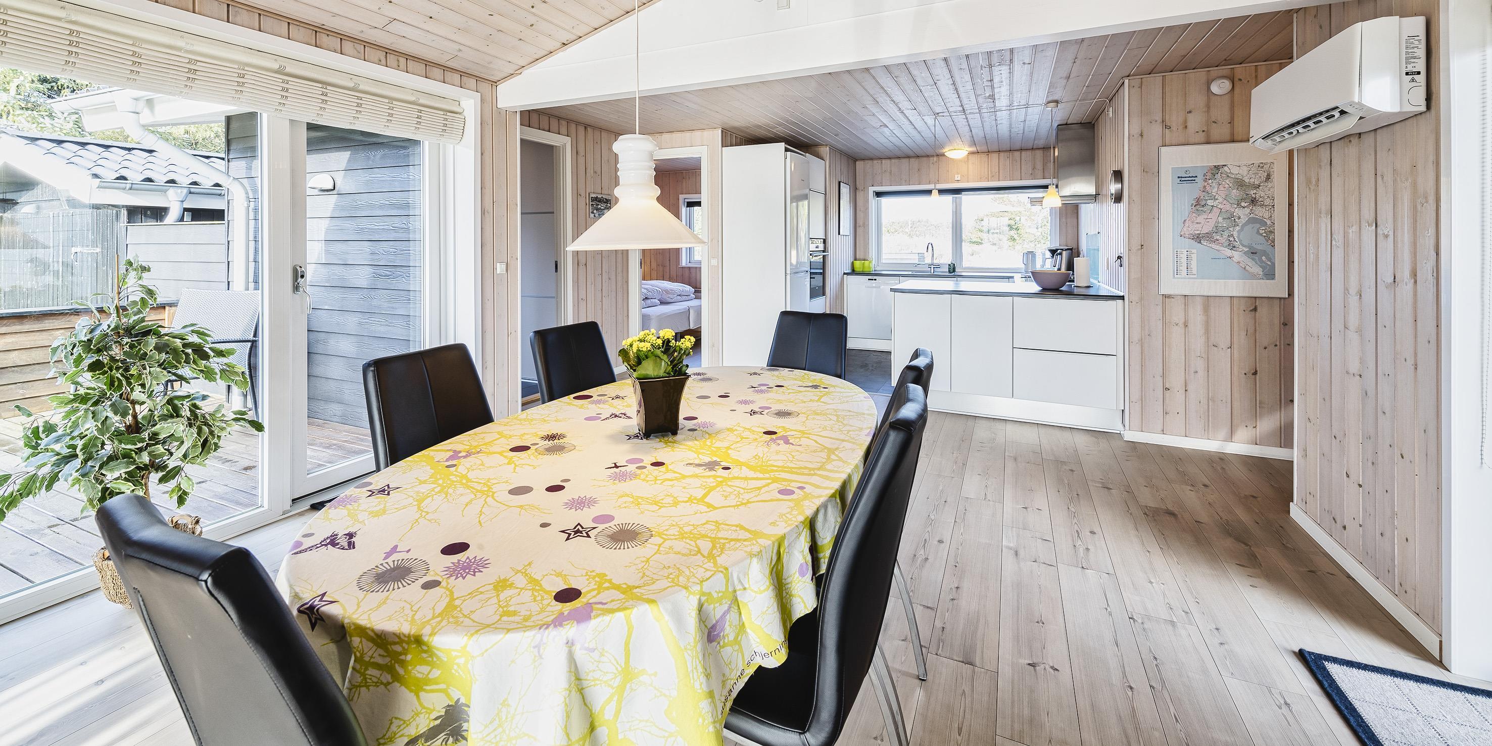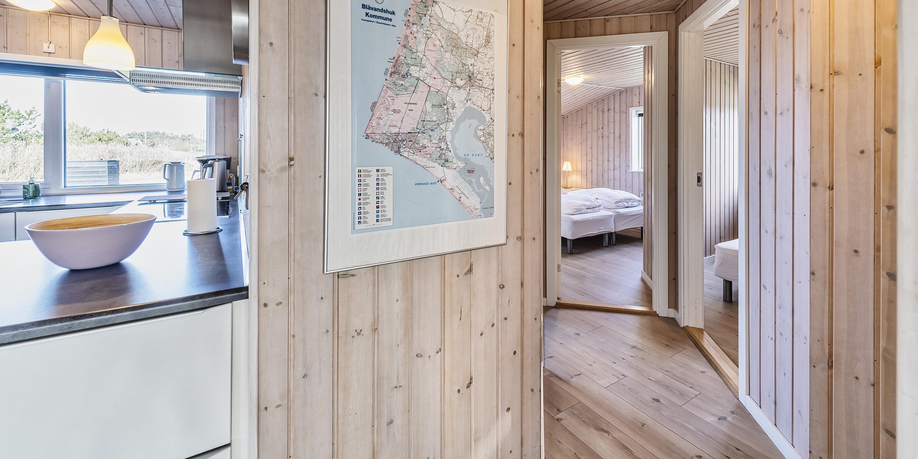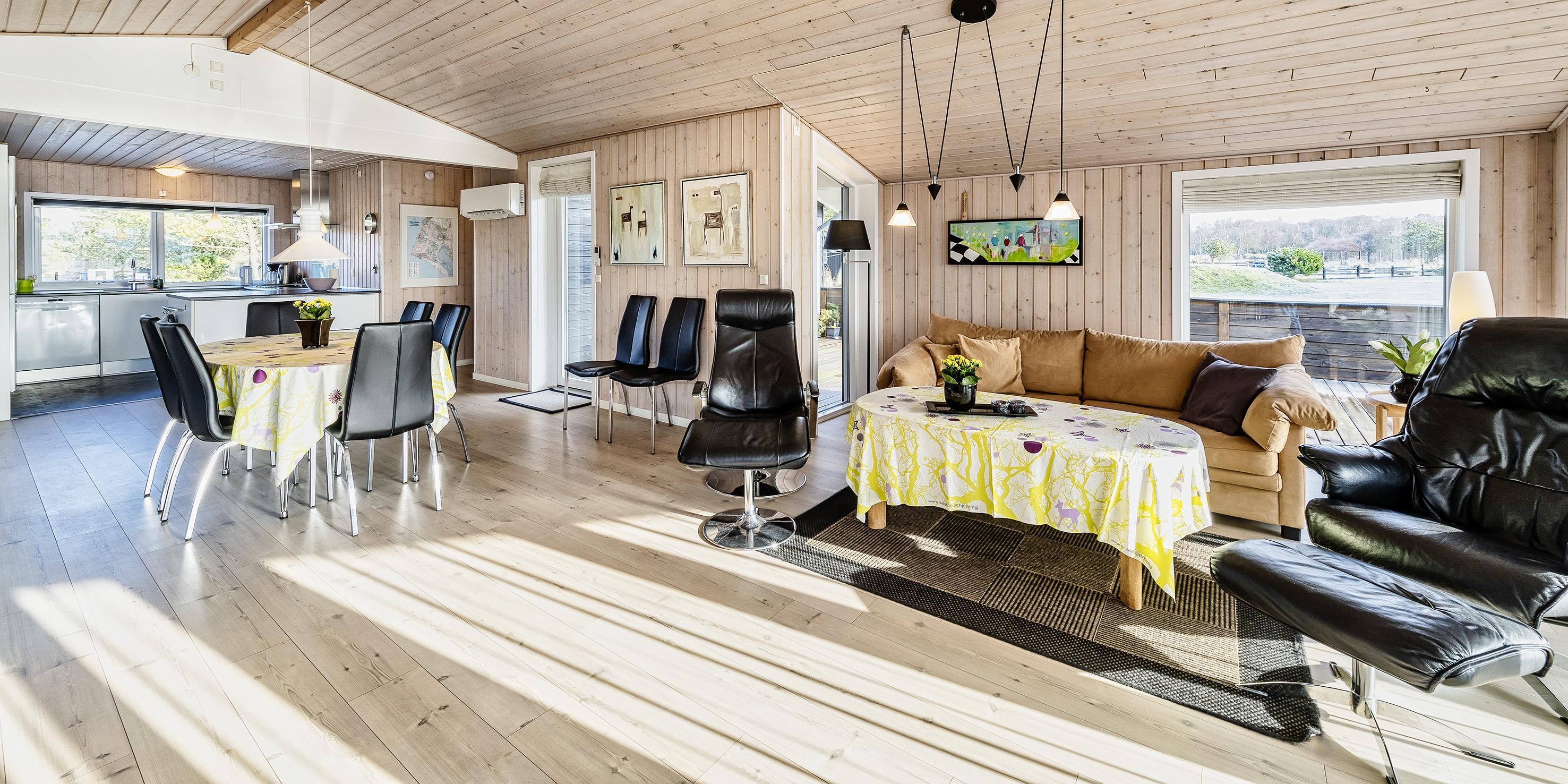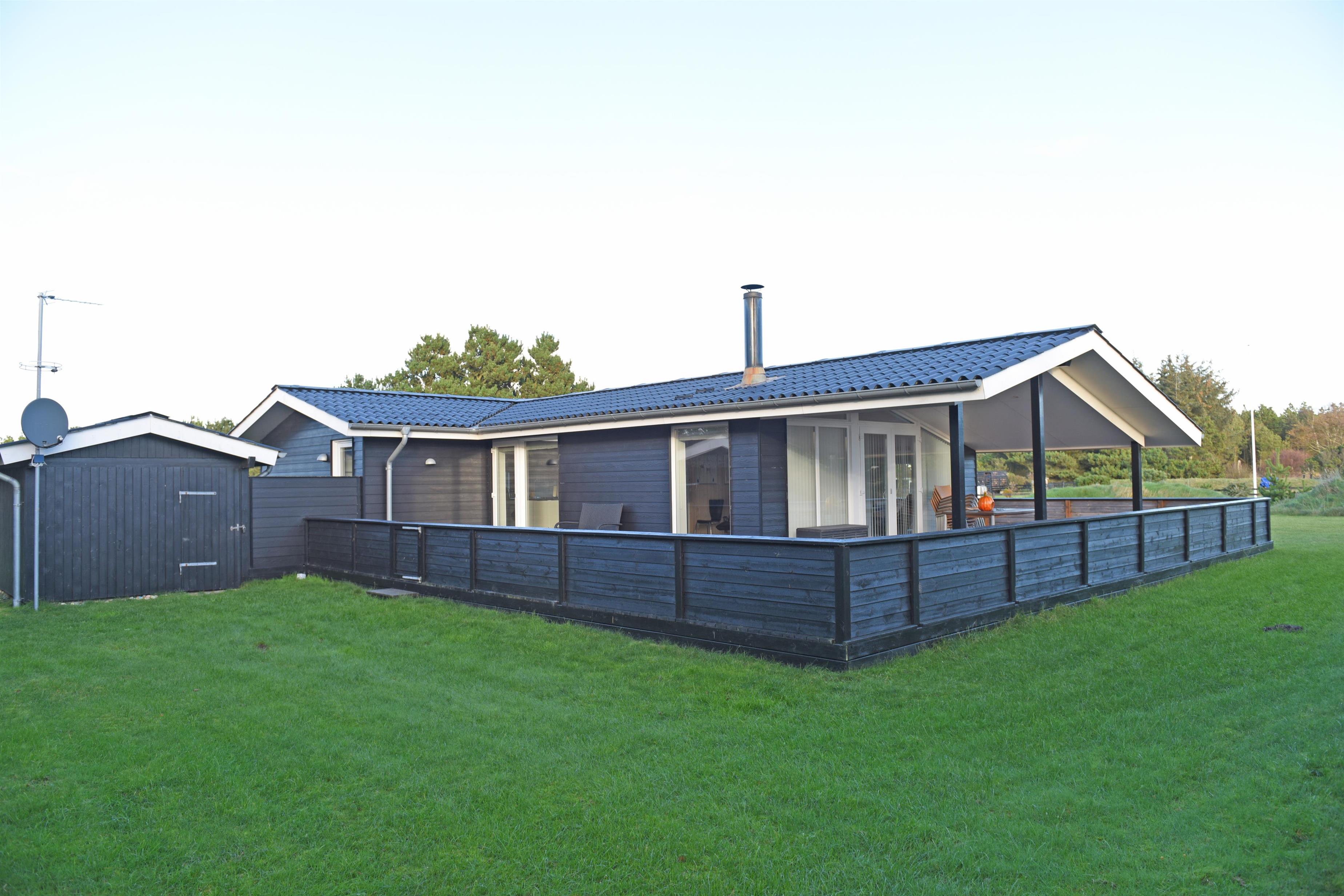 Hyggeligt og velplejet sommerhus til 6 Vejers fans, beliggende på naturskøn grund tæt ved skov og cykelsti. ca. 1000 meter fra stranden. Huset indeholder: Indgang/entre med garderobeplads, vaskemaskine og tørretumbler. Fra gangen kommer man ind i et stort åbent og hyggeligt indrettet opholdsstue, der er indrettet med spisestue afdeling, brændeovn og velindrettet sofahjørne med fjernsyn (DR programmer) og Chrome Cast. Klimaanlæg. Opholdsstuen er ydermere i åben forbindelse med køkkenet. Det velsorterede køkken råder over et køle-/fryseskab, varmluft ovn, keramisk kogeplade (Induktion), emhætte, mikroovn og opvaskemaskine. Fra den hyggeligt indrettede stue, er der udgang til en delvis overdækket lukket terrasse, hvor aften kan forlænges i det tidlige forår som efterår. Fra stuen er der indgang til 1 soveværelse med 1 dobbelt seng (2 x (90 x 200 cm)) og klædeskabe. Fordelingsgang med indgang til endnu 2 soveværelser med hver 1 dobbelt seng (2 x (90 x 200 cm)) 1 Badeværelse med bruser/wc. 3 soveværelser: DS + DS + DS. De udvendige forhold byder på en fantastisk lukket træterrasse samt en stor have, hvor børnene nemt kan udfolde sig på den store græsplæne der indbyder til boldspil. Rygning er ikke tilladt. Byggeår 1984. Ombygget 2010.