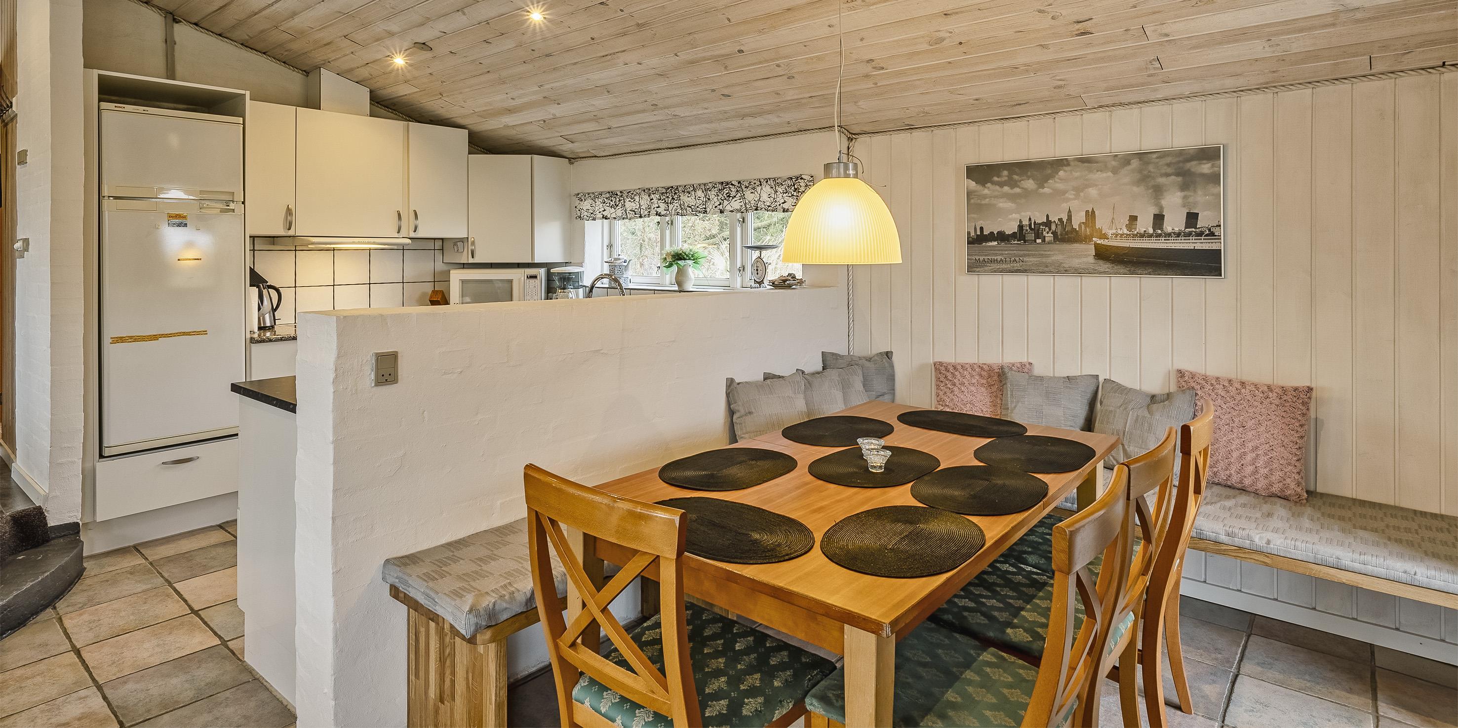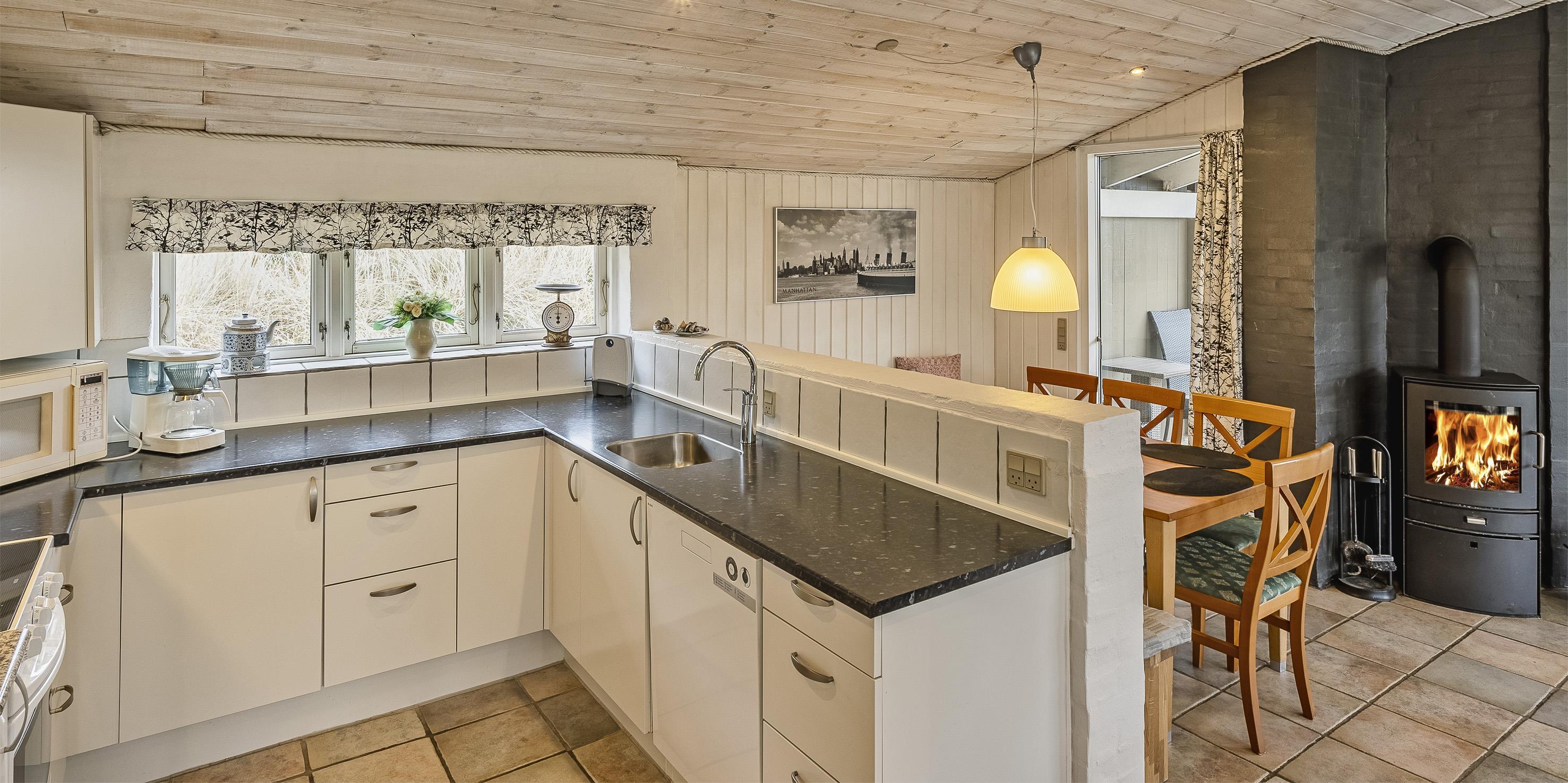 Sommerhuset: Adgang til køkkenalrum i forskudte plan fra husets terrasse. Huset råder over 1 pænt badeværelse med spa og gulvvarme. Stort køkkenalrum og stue med en hyggelig spisekrog. Vær opmærksom at der er 2 trin fra den øvre del af stuen til den nedre, hvor køkken, bløde sofaer og spisekrogen er. Rummet er lyst og dejligt med gode vinduespartier og udgang til terrassen. Terrassen er overdækket og lukket, for at passe på børn og husdyr. Køkkenet fremstår med alt komfort såsom opvaskemaskine, mikroovn, kogeplade, emhætte og køleskab med fryser. Dejlig opholdsstue med brændeovn, tv, satellit-tv, Boxer tv-pakke og trådløs internetadgang med god dækning. Huset har i alt 3 soverum. DS + 2S + 2S. Vær opmærksom på at der i ene soveværelse med dobbeltseng er et trin på ca. 25 cm. Vaskemaskine befinder sig på badeværelset. Hyggelig overdækket og lukket terrasse-miljø. På terrassen kan dagene nydes fra morgen til aften. På taget af huset er der solceller, og når solen skinner er strømmen praktisk talt gratis. Lademulighed til elbil ved huset.