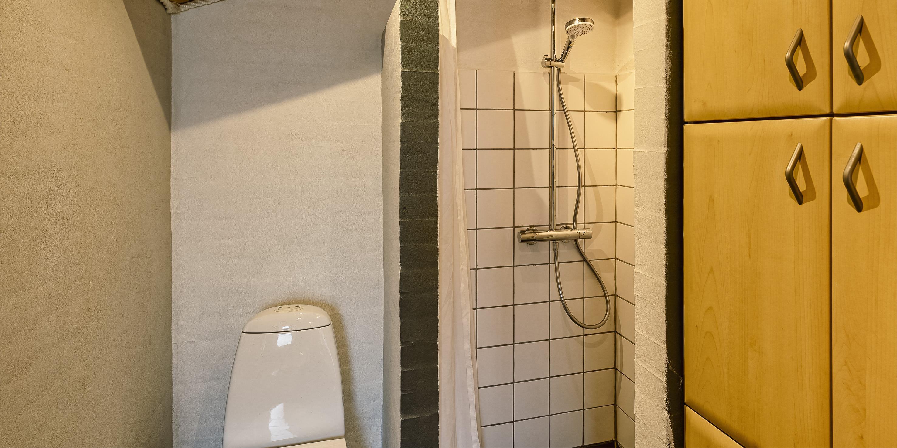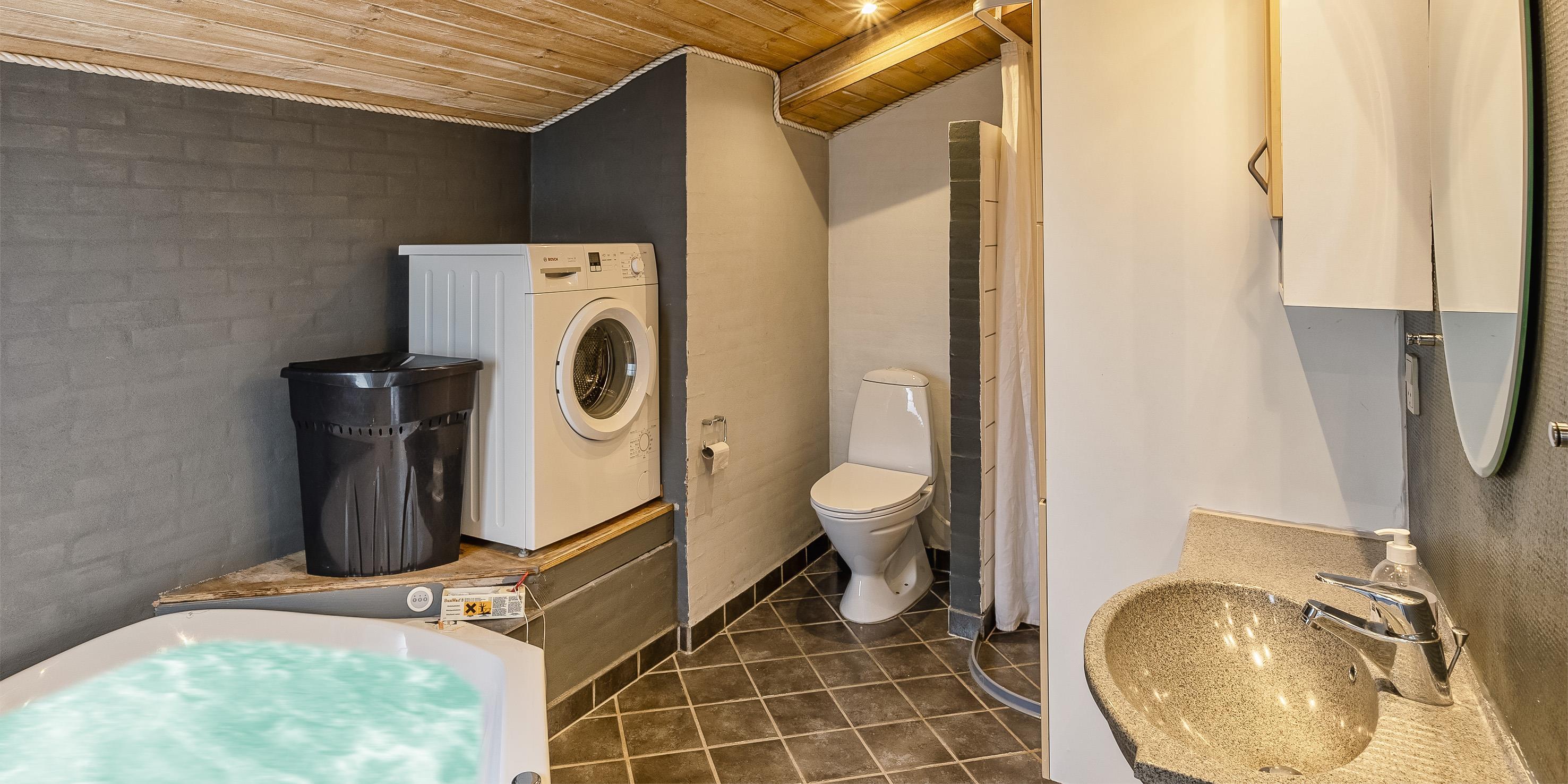 Bad med toilet, bruser og vask