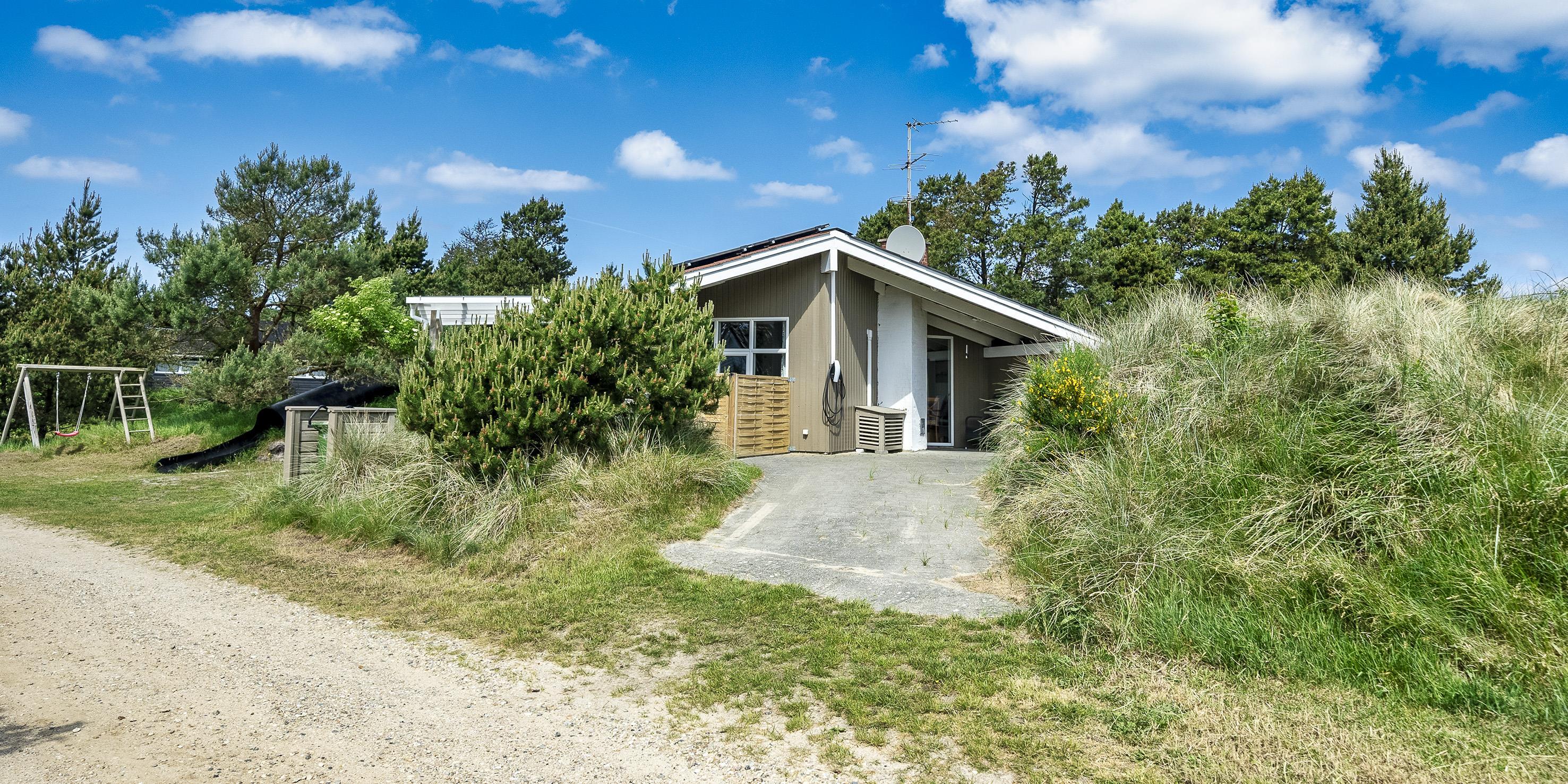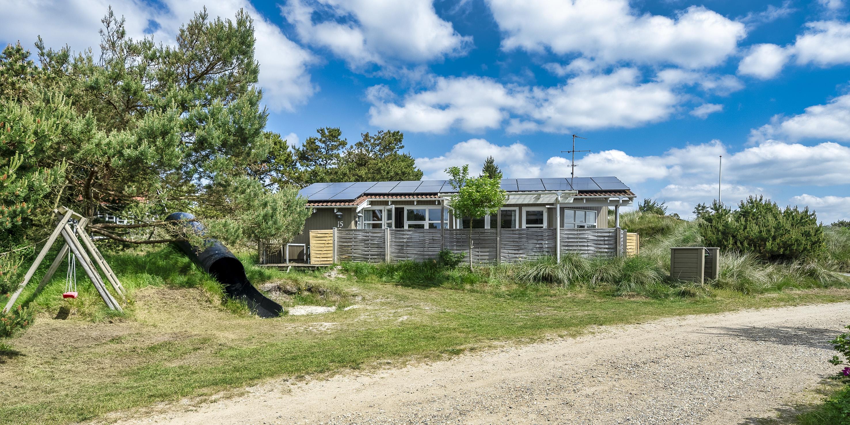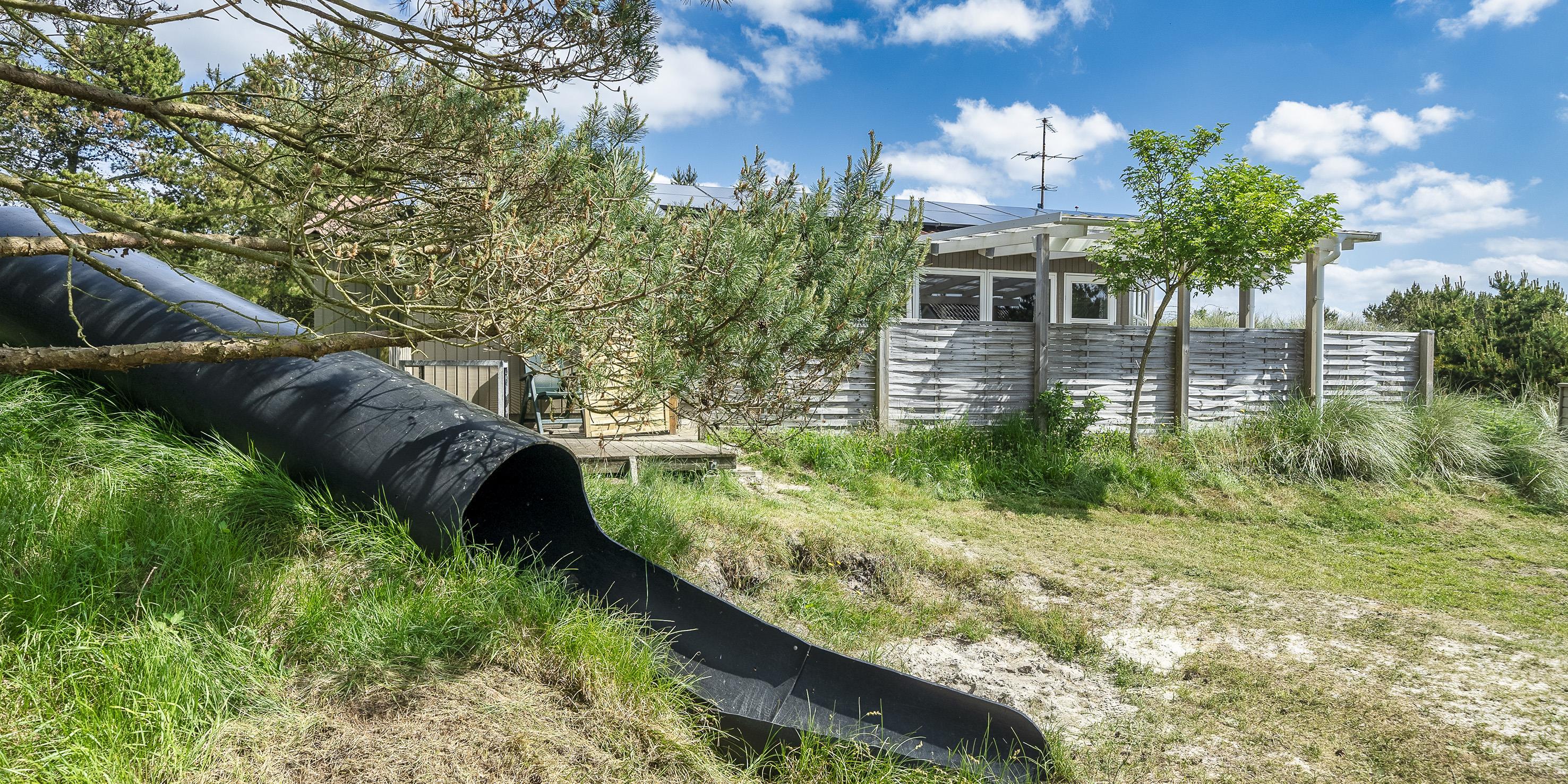 De udvendige faciliteter byder på en dejlig overdækket og lukket terrasse, hvor aftenerne kan forlænges og nydes til hen i foråret/efteråret. Sommerhuset ligger højt på en dejlig klitgrund med mulighed for at parkere ved siden af huset. Udenfor er der god mulighed for leg for børn på både gynge og en 7 meter lang rutschebane. Grunden er 1501 m2 stor.