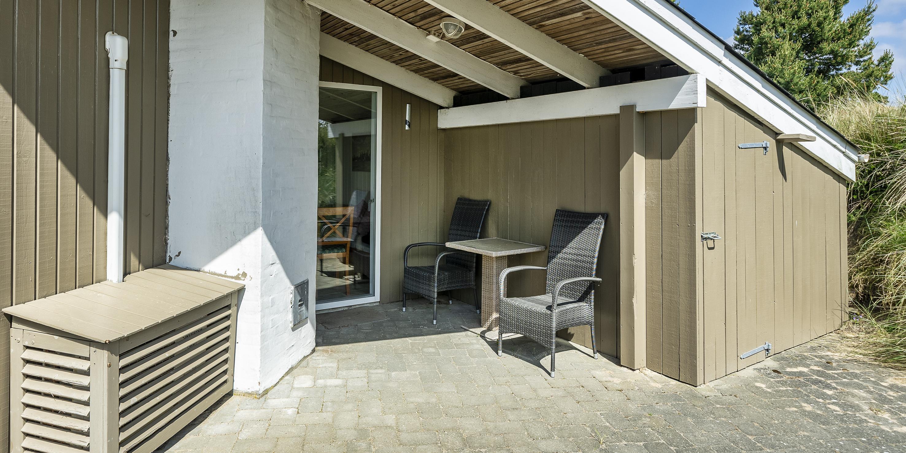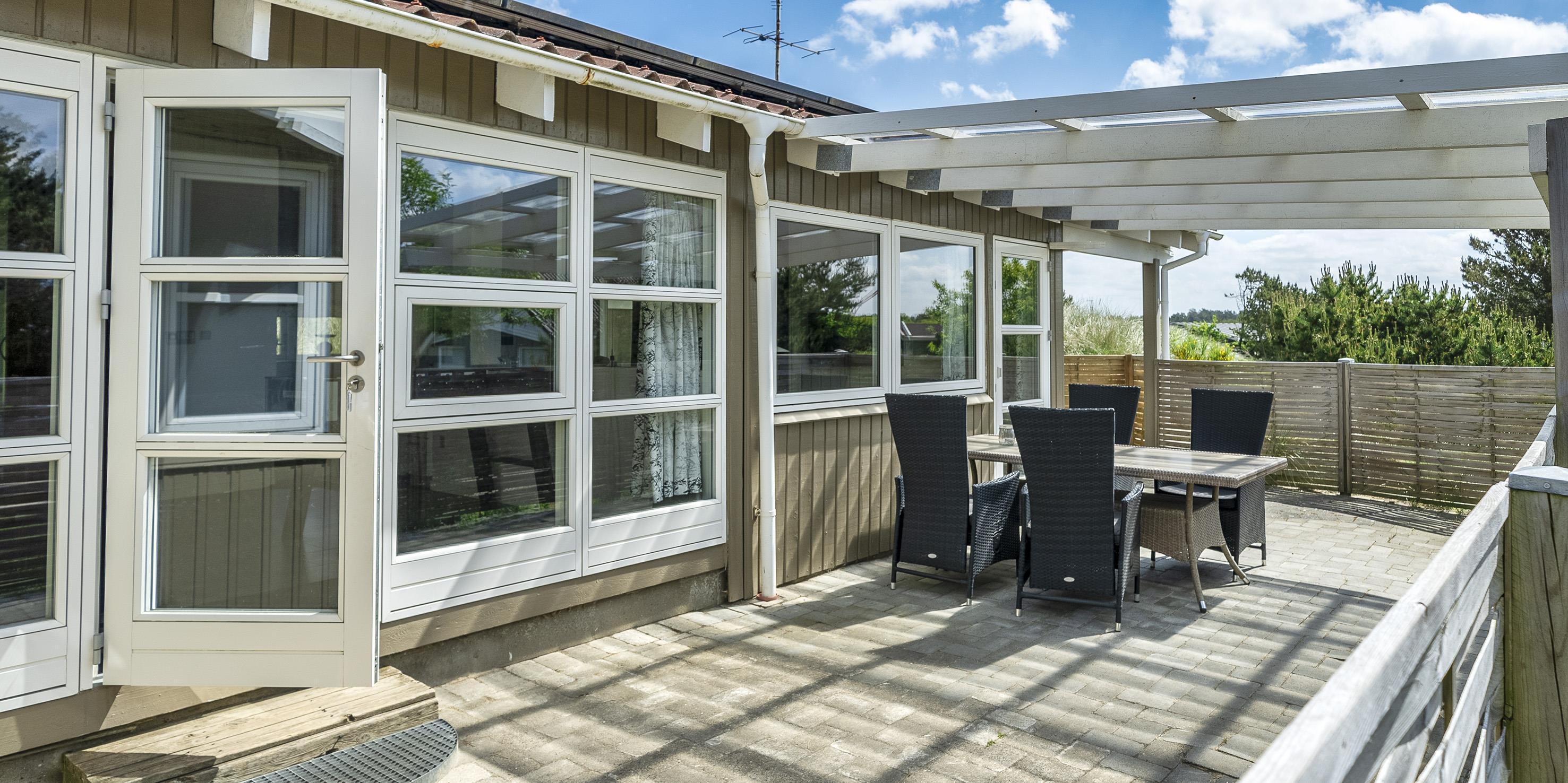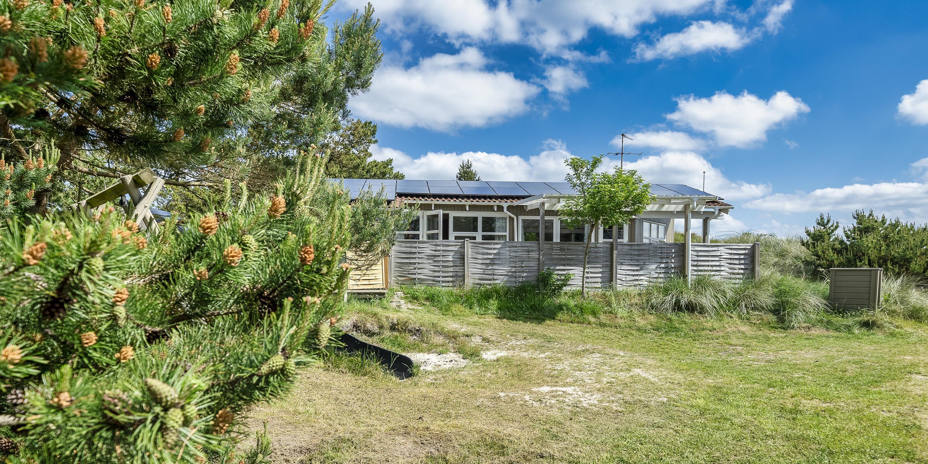 De udvendige faciliteter byder på en dejlig overdækket og lukket terrasse, hvor aftenerne kan forlænges og nydes til hen i foråret/efteråret. Sommerhuset ligger højt på en dejlig klitgrund med mulighed for at parkere ved siden af huset. Udenfor er der god mulighed for leg for børn på både gynge og en 7 meter lang rutschebane. Grunden er 1501 m2 stor.