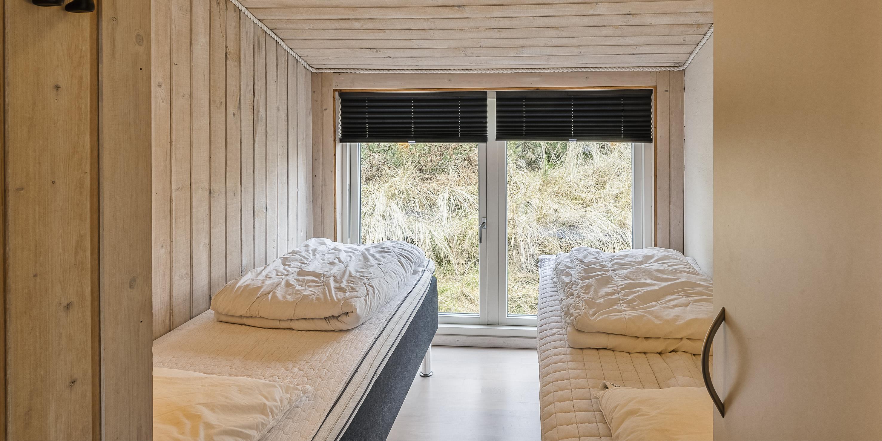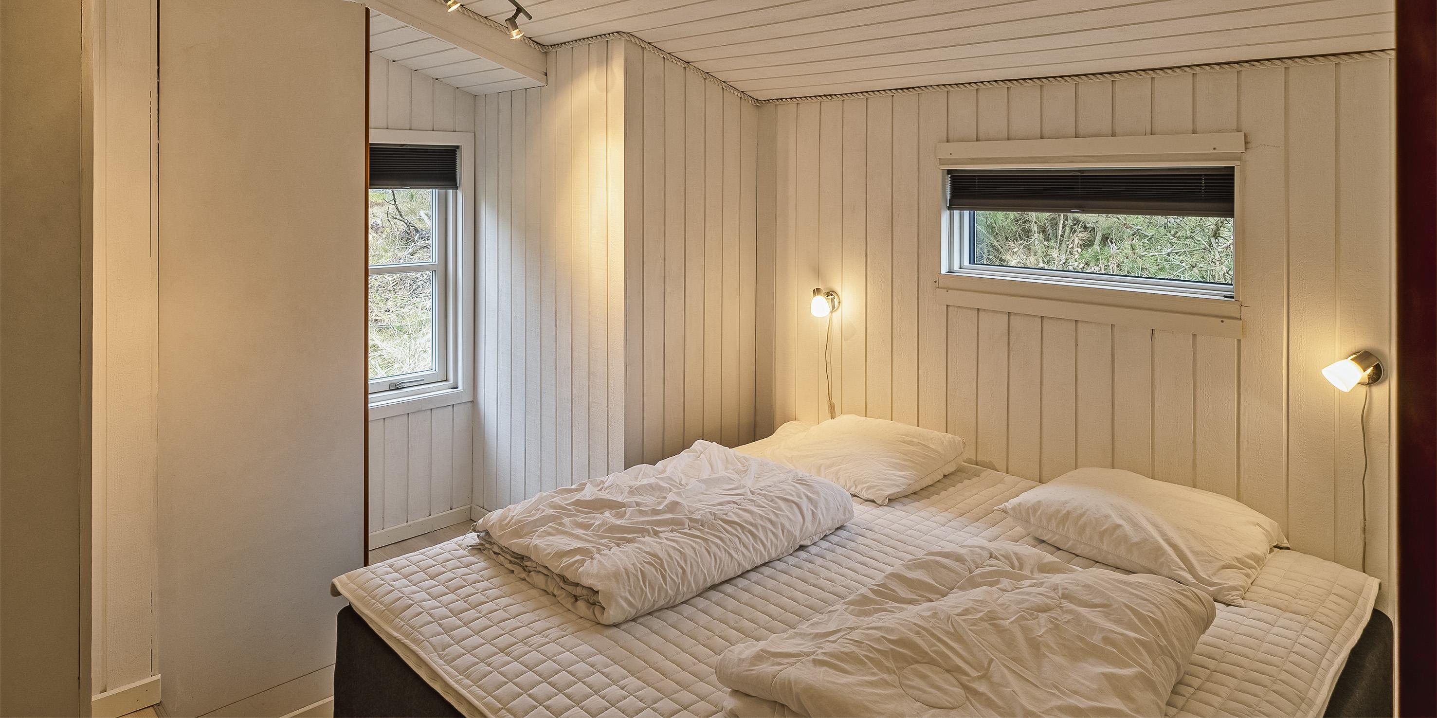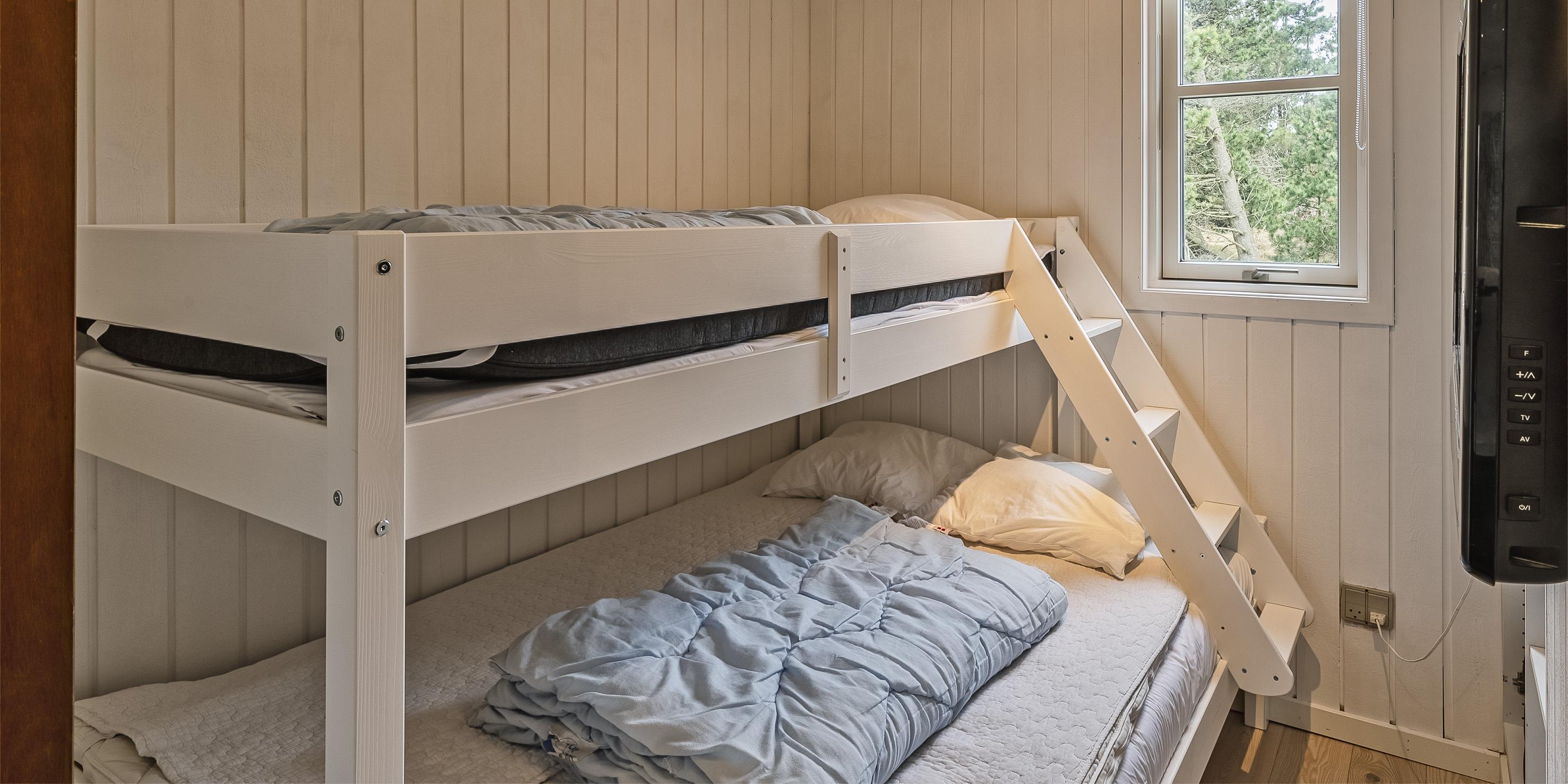 3 soveværelser. 1 med dobbeltseng 180x200 cm. 1 med 2 enkeltsenge. 1 med køjeseng.