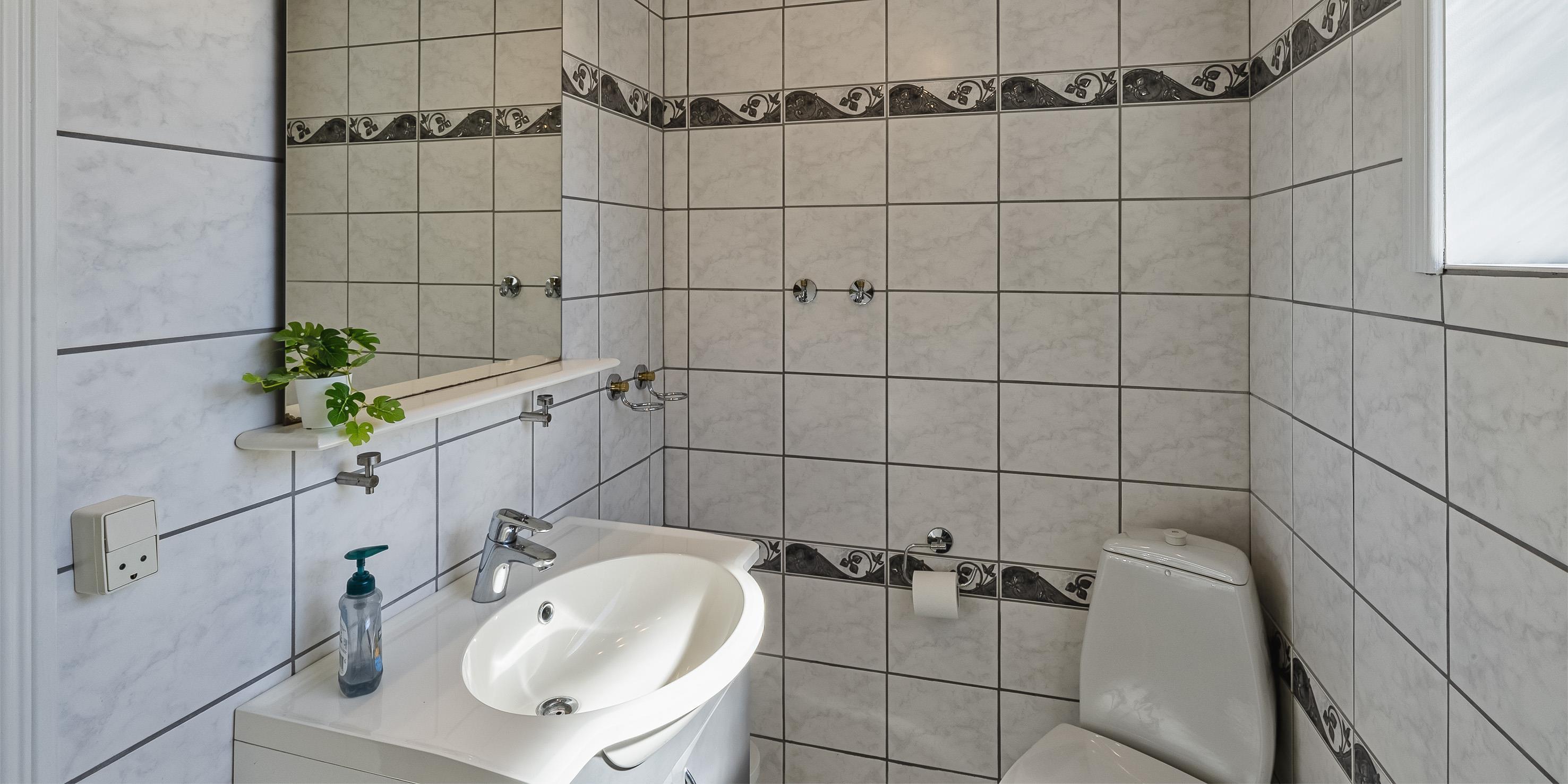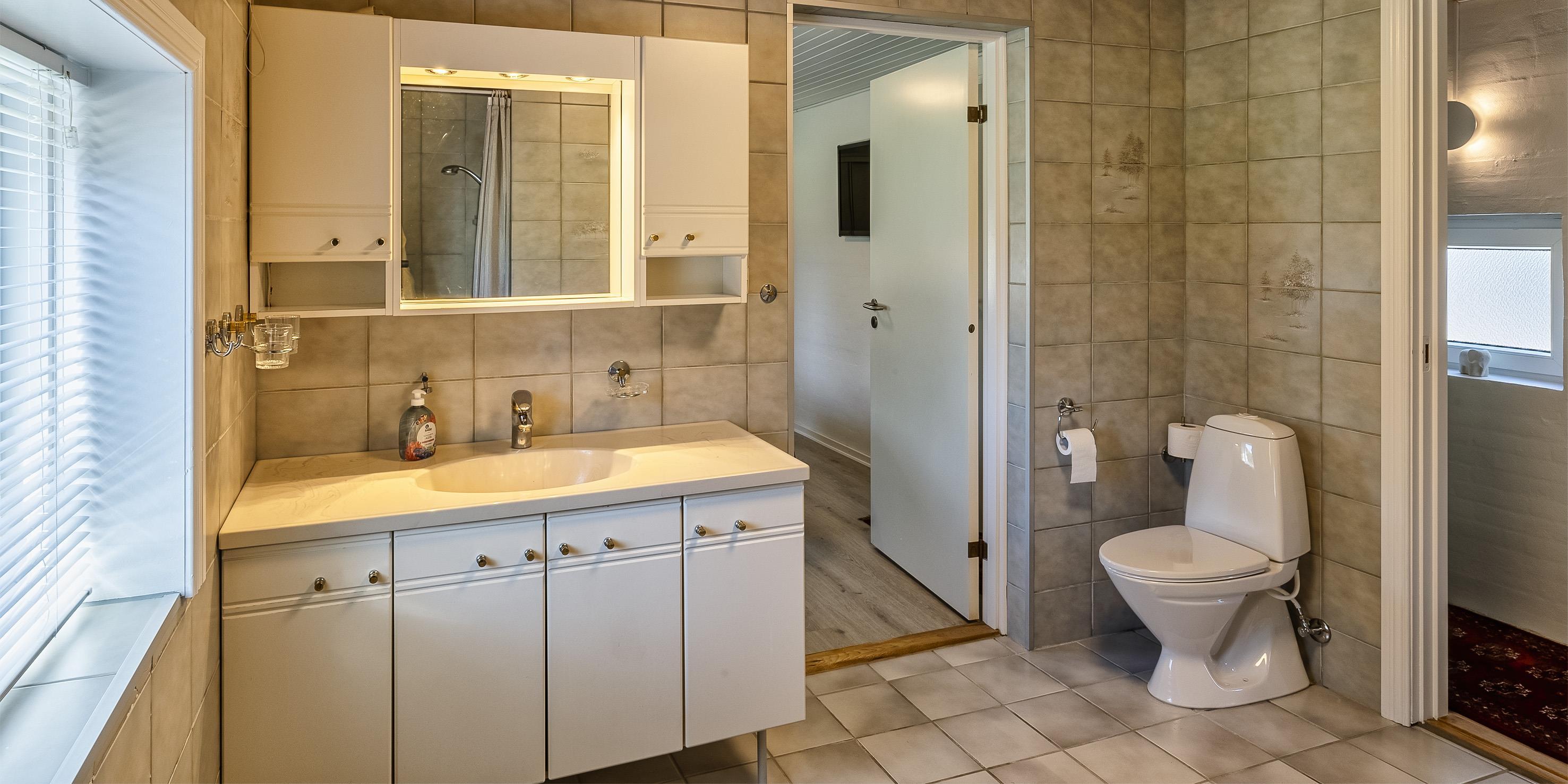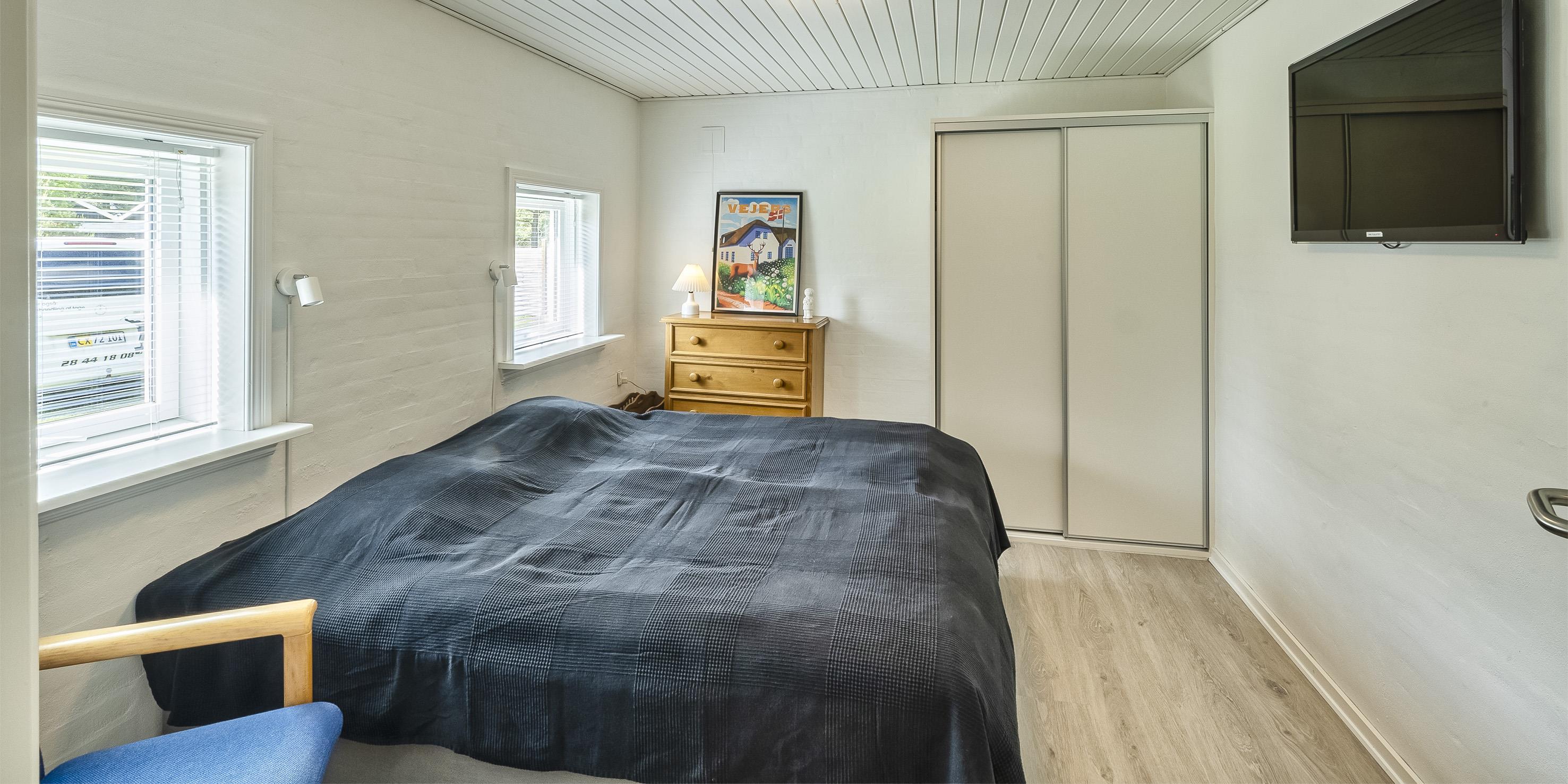 3 soveværelser. 1 med dobbeltseng 180x200 cm. 1 med smal dobbeltseng 120x200 cm. 1 med 1 køjeseng.