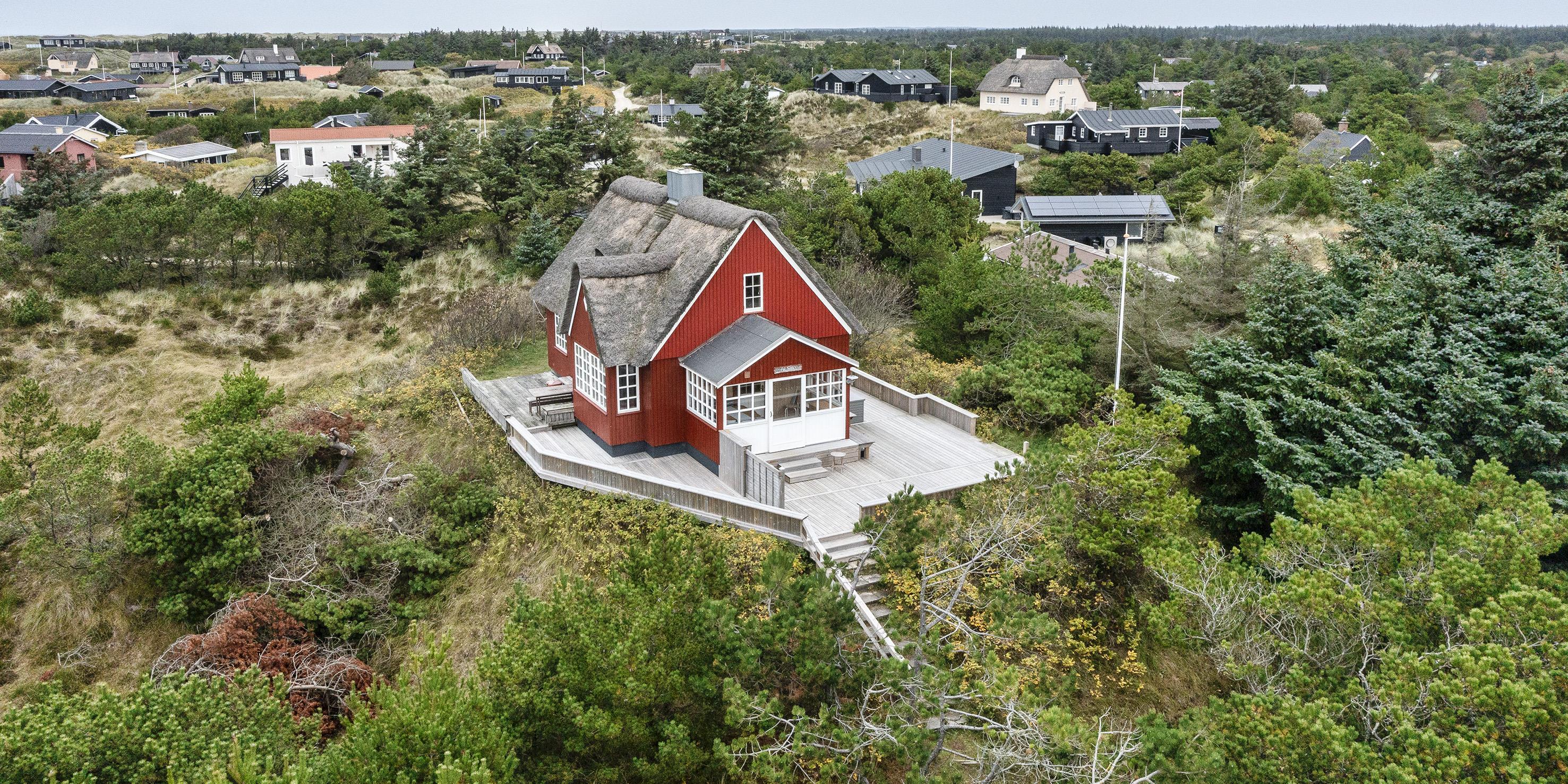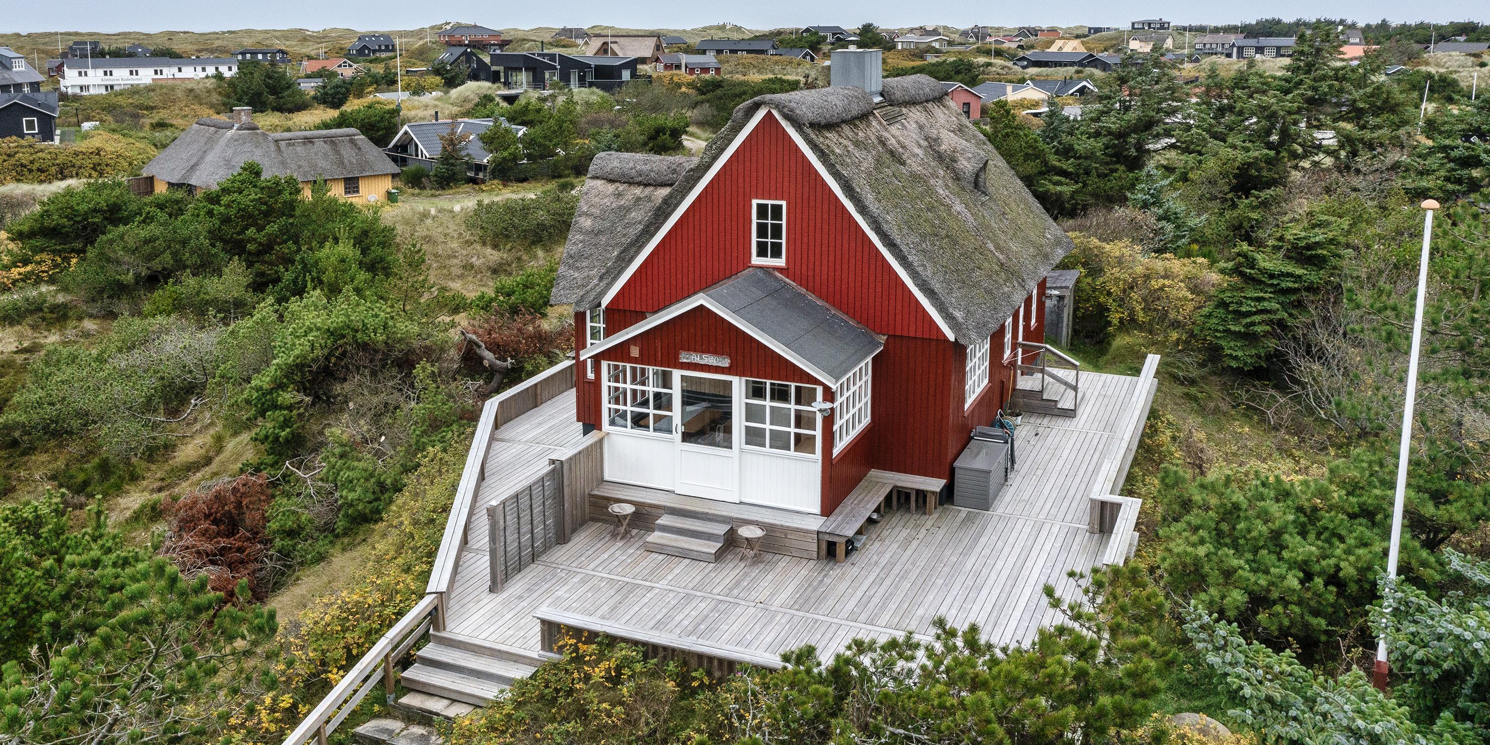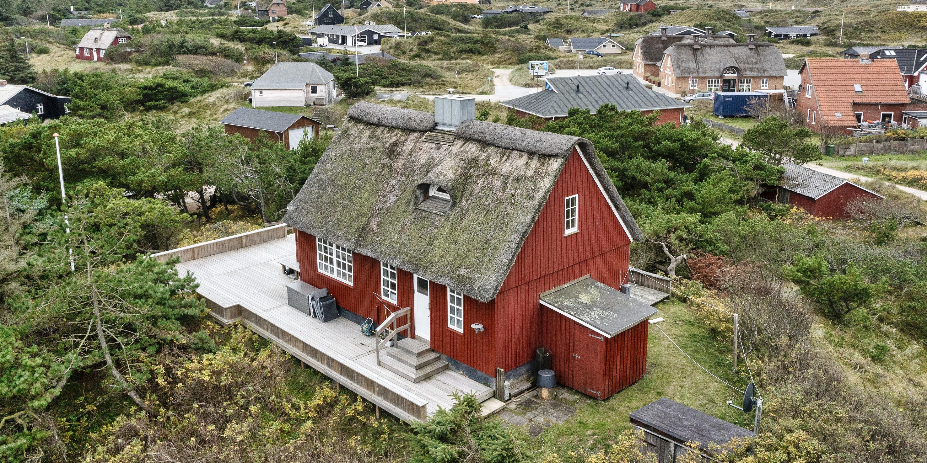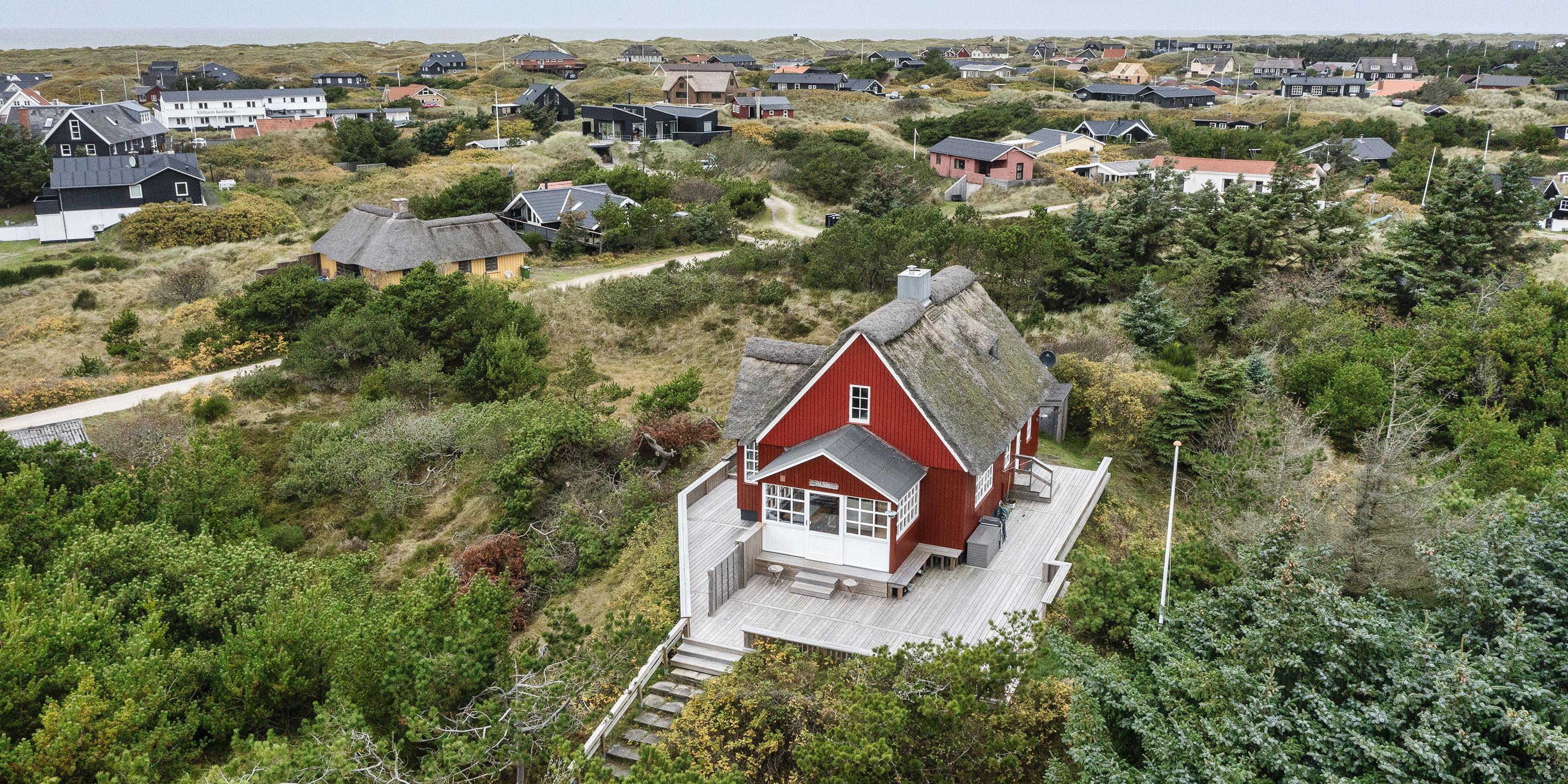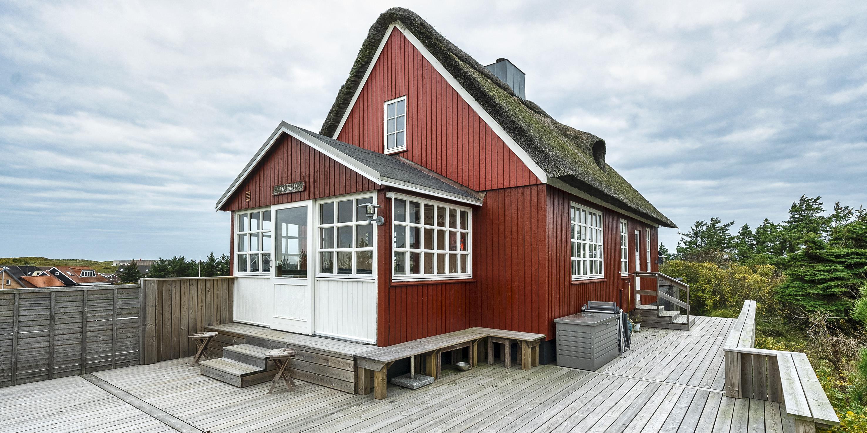 Charmerende, stråtækt ældre sommerhus beliggende højt på en klit. Huset er kaldt ”Alsbo” og er på 2 etager. Fra øverste etage har du en vidunderlig udsigt over det store sommerhusområde ved Vejers Strand. Feriehuset er indrettet til 6 personer og huset ligger cirka 400 meter fra stranden. Udestuen fungerer også som indgangsparti. Et hyggeligt sidde hjørne er placeret i udestuen, hvorfra du har en fantastisk udsigt gennem den store vinduesfront. Opholds- og spiseafdelingen er kombineret og indrettet med charmerende møbler. De danske tv-programmer kan modtages via udbyderen Stofa. Den indbyggede pejs giver varme og hygge mens Morsø pejsen er til pynt og kan ikke fyres. Køkkenet er et separat rum og er holdt enkelt, men har alt hvad du skal bruge til hverdagsbrug. Køkkenet er udstyret med keramisk kogeplade, ovn, opvaskemaskine, mikroovn og køleskab med fryser. Badeværelset har toilet, håndvask og bruser. Vaskemaskinen er anbragt i badeværelset. Endvidere er badeværelset udstyret med gulvvarme. Feriehuset har i alt tre soveværelser: DS + DS + 2S. Et soveværelse er i stueetagen og de to andre er ovenpå. Soveværelset nedenunder har en dobbeltseng (160x200). I det ene hjørne af opholdsområdet er trætrappen, som fører dig til det øverste område. Et soveværelse ovenpå har to enkeltsenge og det andet soveværelse har en dobbeltseng (140x20). Soveværelset med dobbeltsengen har også et lille hyggehjørne, udstyret med en lille madras. Huset har internetforbindelse (W-Lan). Det er tilladt at tage 2 hunde med. Rygning i ferieboligen er ikke tilladt. Der er bygget en træterrasse næsten rundt om hele huset. Feriehuset er bygget i 1930.