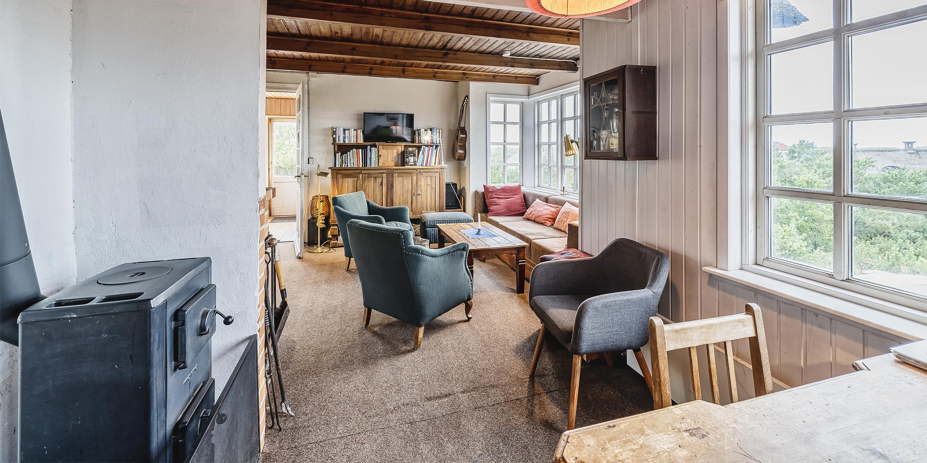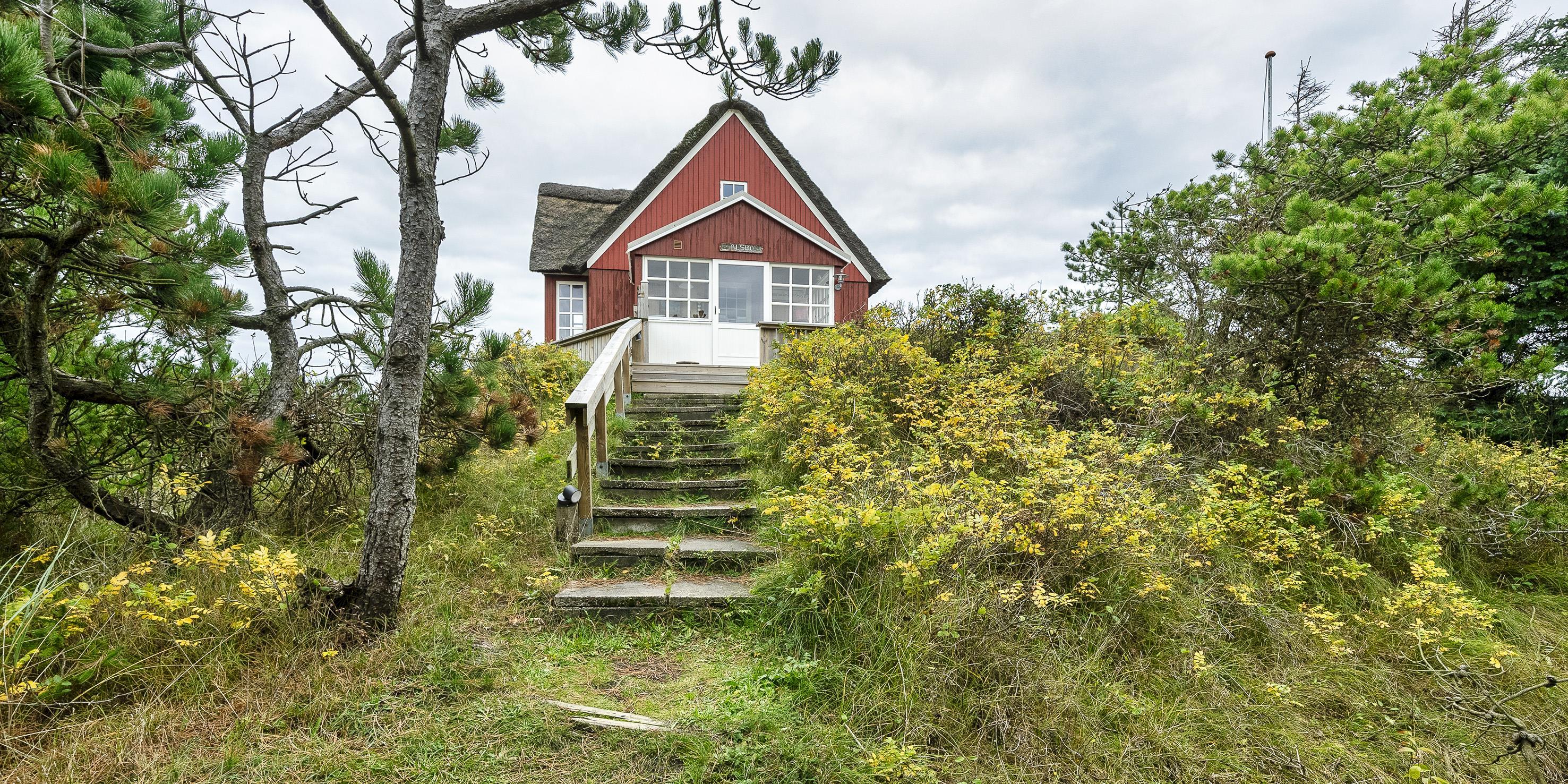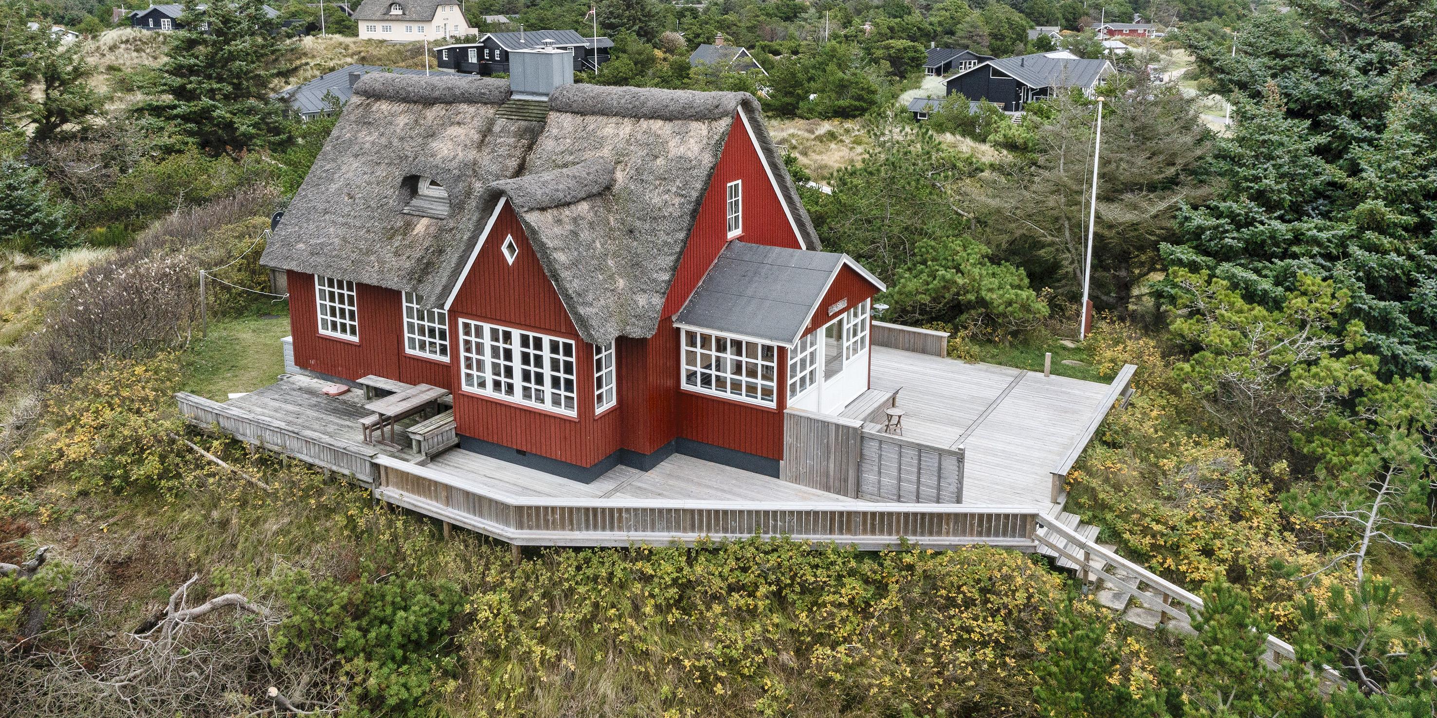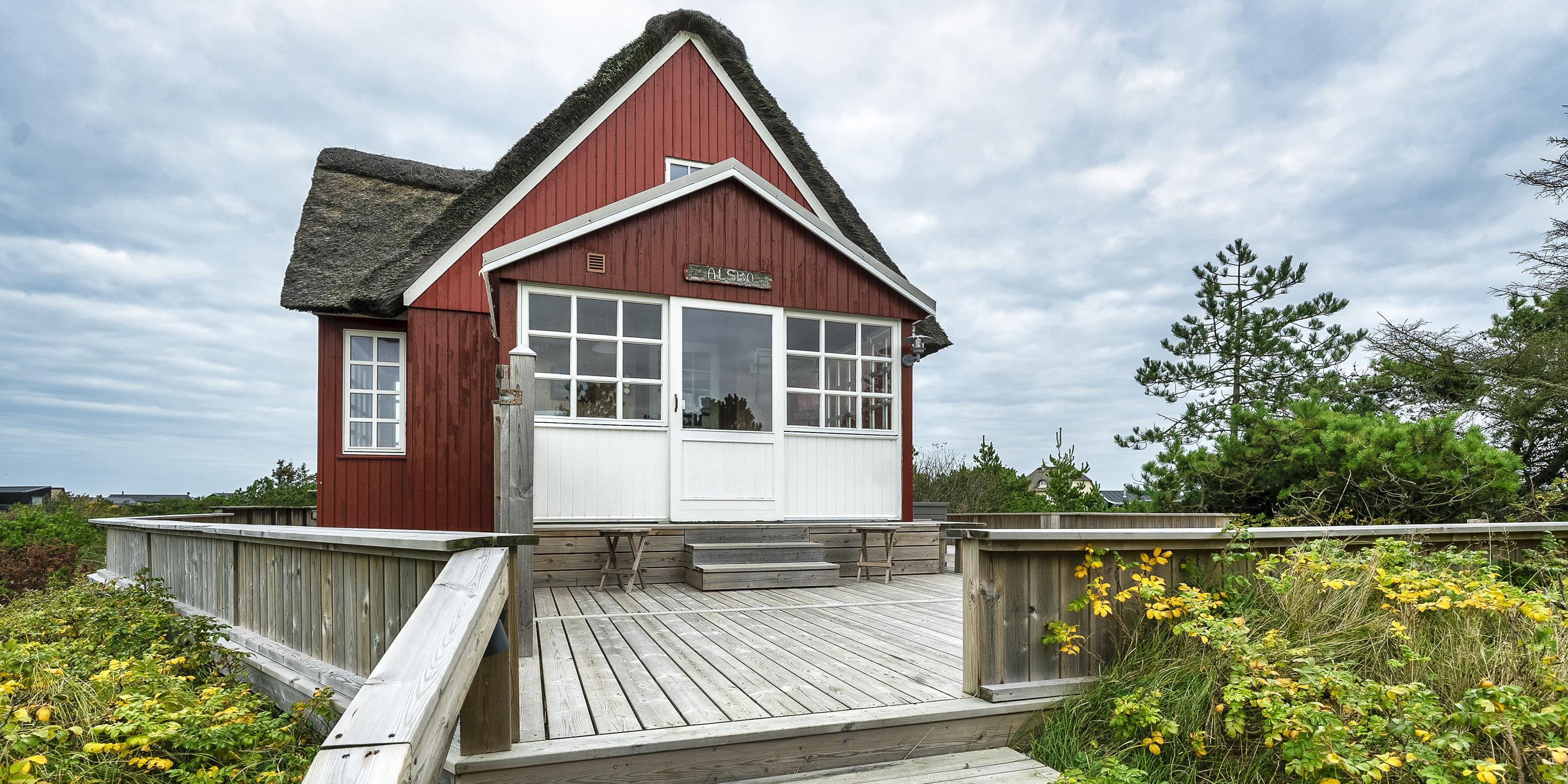 Charmerende, stråtækt ældre sommerhus beliggende højt på en klit. Huset er kaldt ”Alsbo” og er på 2 etager. Fra øverste etage har du en vidunderlig udsigt over det store sommerhusområde ved Vejers Strand. Feriehuset er indrettet til 6 personer og huset ligger cirka 400 meter fra stranden. Udestuen fungerer også som indgangsparti. Et hyggeligt sidde hjørne er placeret i udestuen, hvorfra du har en fantastisk udsigt gennem den store vinduesfront. Opholds- og spiseafdelingen er kombineret og indrettet med charmerende møbler. De danske tv-programmer kan modtages via udbyderen Stofa. Den indbyggede pejs giver varme og hygge mens Morsø pejsen er til pynt og kan ikke fyres. Køkkenet er et separat rum og er holdt enkelt, men har alt hvad du skal bruge til hverdagsbrug. Køkkenet er udstyret med keramisk kogeplade, ovn, opvaskemaskine, mikroovn og køleskab med fryser. Badeværelset har toilet, håndvask og bruser. Vaskemaskinen er anbragt i badeværelset. Endvidere er badeværelset udstyret med gulvvarme. Feriehuset har i alt tre soveværelser: DS + DS + 2S. Et soveværelse er i stueetagen og de to andre er ovenpå. Soveværelset nedenunder har en dobbeltseng (160x200). I det ene hjørne af opholdsområdet er trætrappen, som fører dig til det øverste område. Et soveværelse ovenpå har to enkeltsenge og det andet soveværelse har en dobbeltseng (140x20). Soveværelset med dobbeltsengen har også et lille hyggehjørne, udstyret med en lille madras. Huset har internetforbindelse (W-Lan). Det er tilladt at tage 2 hunde med. Rygning i ferieboligen er ikke tilladt. Der er bygget en træterrasse næsten rundt om hele huset. Feriehuset er bygget i 1930.