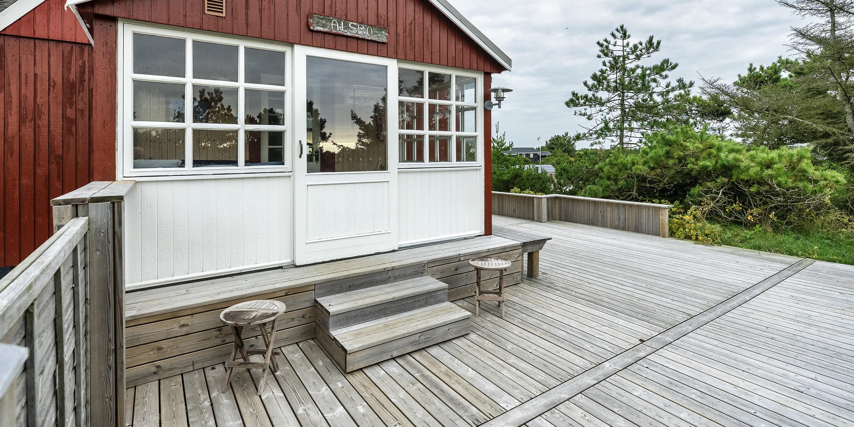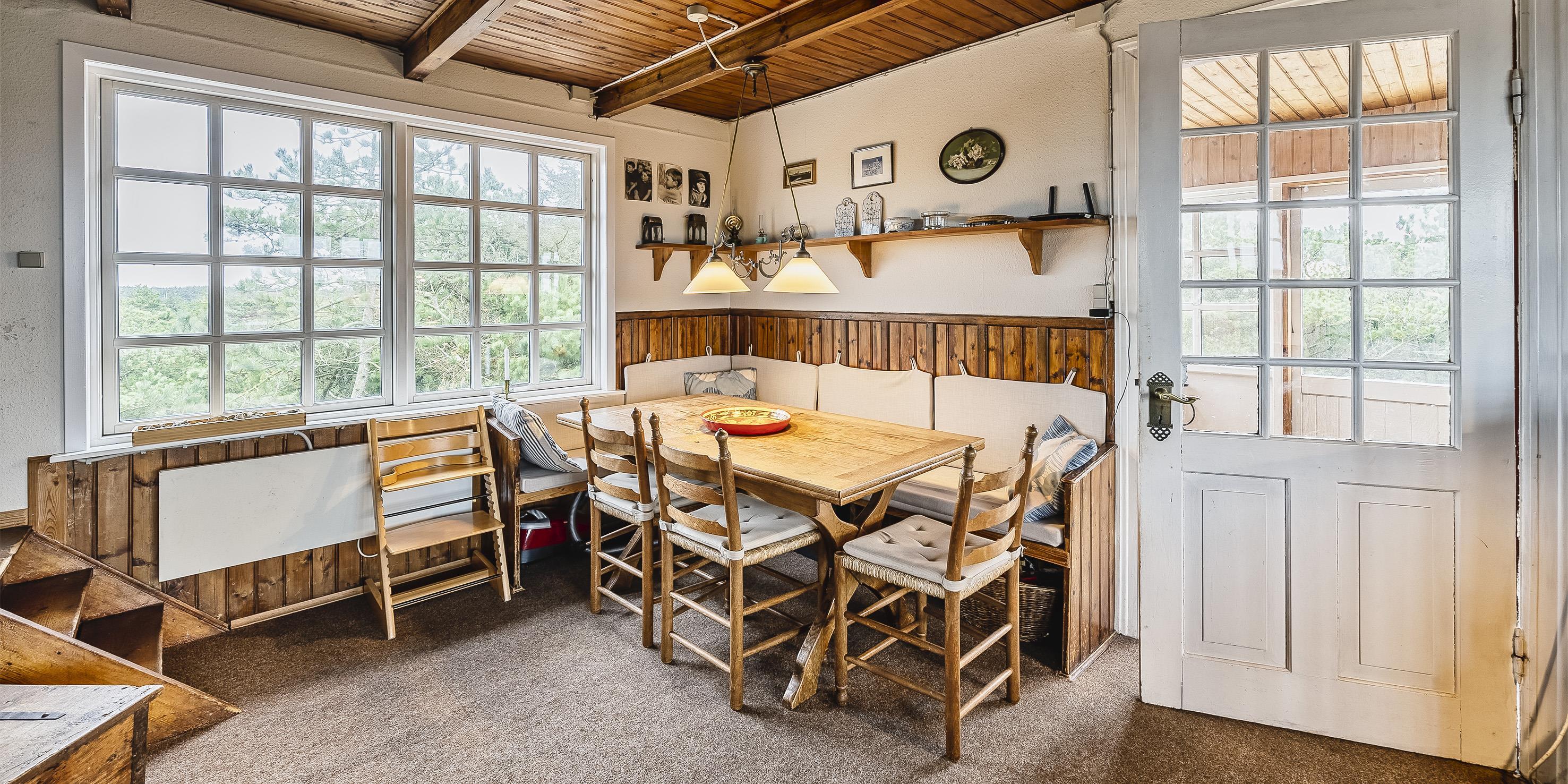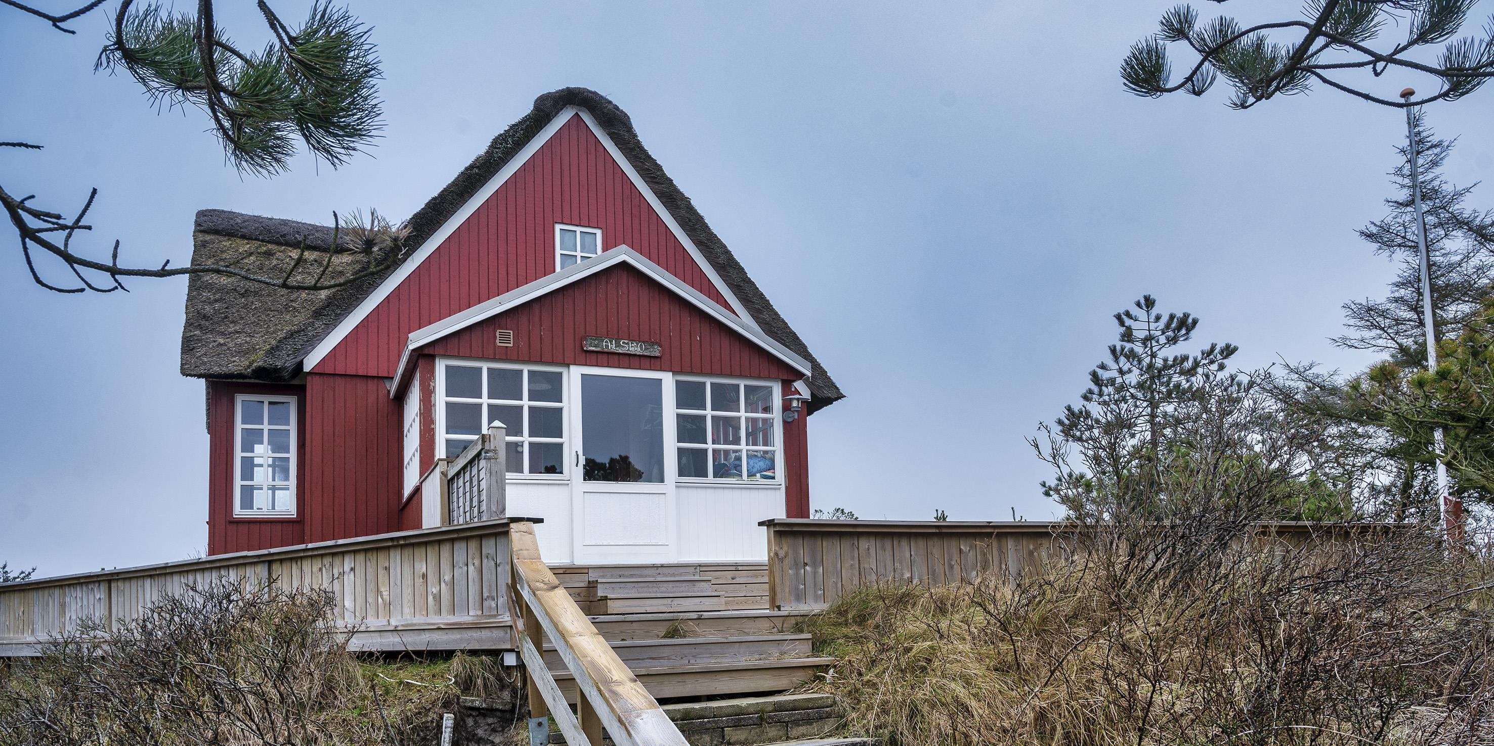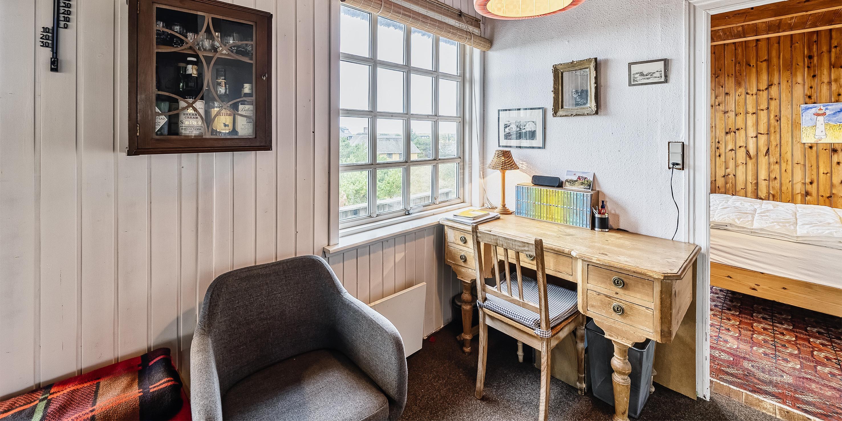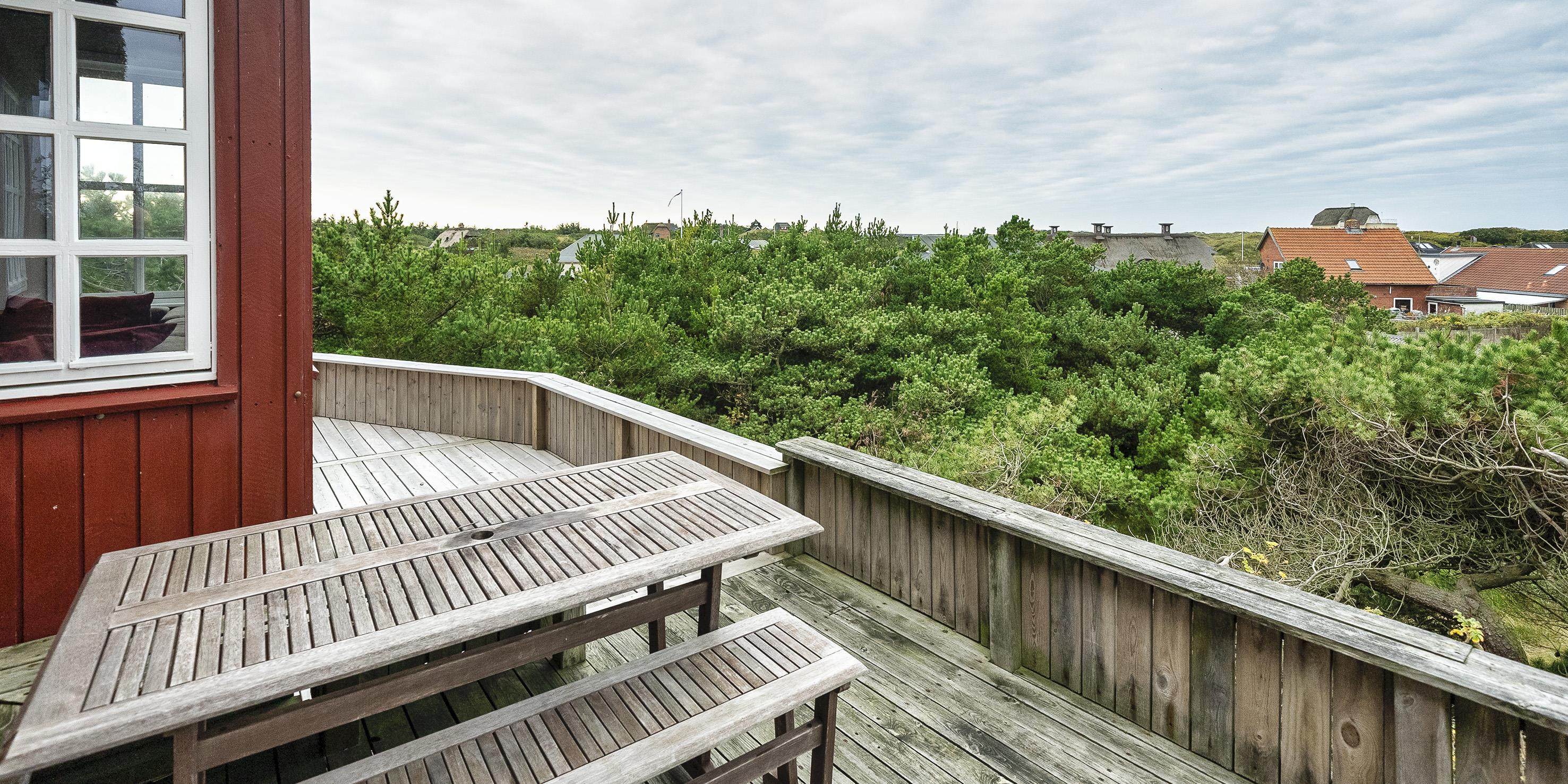 Charmerende, stråtækt ældre sommerhus beliggende højt på en klit. Huset er kaldt ”Alsbo” og er på 2 etager. Fra øverste etage har du en vidunderlig udsigt over det store sommerhusområde ved Vejers Strand. Feriehuset er indrettet til 6 personer og huset ligger cirka 400 meter fra stranden. Udestuen fungerer også som indgangsparti. Et hyggeligt sidde hjørne er placeret i udestuen, hvorfra du har en fantastisk udsigt gennem den store vinduesfront. Opholds- og spiseafdelingen er kombineret og indrettet med charmerende møbler. De danske tv-programmer kan modtages via udbyderen Stofa. Den indbyggede pejs giver varme og hygge mens Morsø pejsen er til pynt og kan ikke fyres. Køkkenet er et separat rum og er holdt enkelt, men har alt hvad du skal bruge til hverdagsbrug. Køkkenet er udstyret med keramisk kogeplade, ovn, opvaskemaskine, mikroovn og køleskab med fryser. Badeværelset har toilet, håndvask og bruser. Vaskemaskinen er anbragt i badeværelset. Endvidere er badeværelset udstyret med gulvvarme. Feriehuset har i alt tre soveværelser: DS + DS + 2S. Et soveværelse er i stueetagen og de to andre er ovenpå. Soveværelset nedenunder har en dobbeltseng (160x200). I det ene hjørne af opholdsområdet er trætrappen, som fører dig til det øverste område. Et soveværelse ovenpå har to enkeltsenge og det andet soveværelse har en dobbeltseng (140x20). Soveværelset med dobbeltsengen har også et lille hyggehjørne, udstyret med en lille madras. Huset har internetforbindelse (W-Lan). Det er tilladt at tage 2 hunde med. Rygning i ferieboligen er ikke tilladt. Der er bygget en træterrasse næsten rundt om hele huset. Feriehuset er bygget i 1930.
