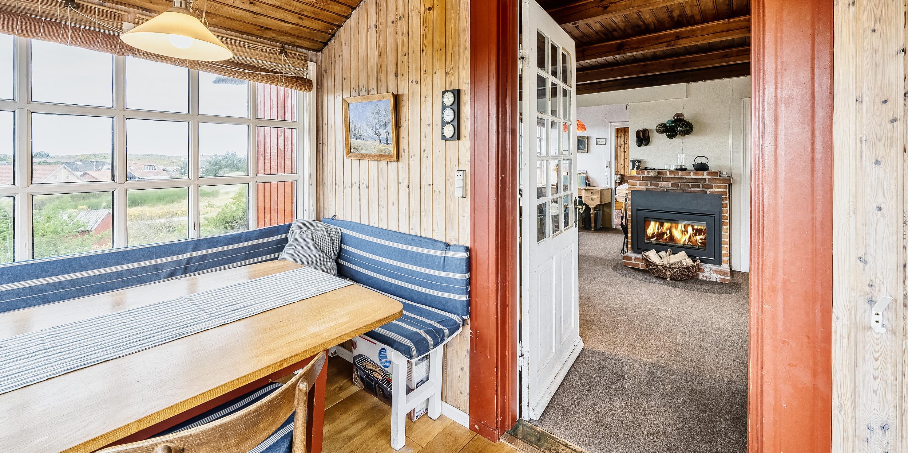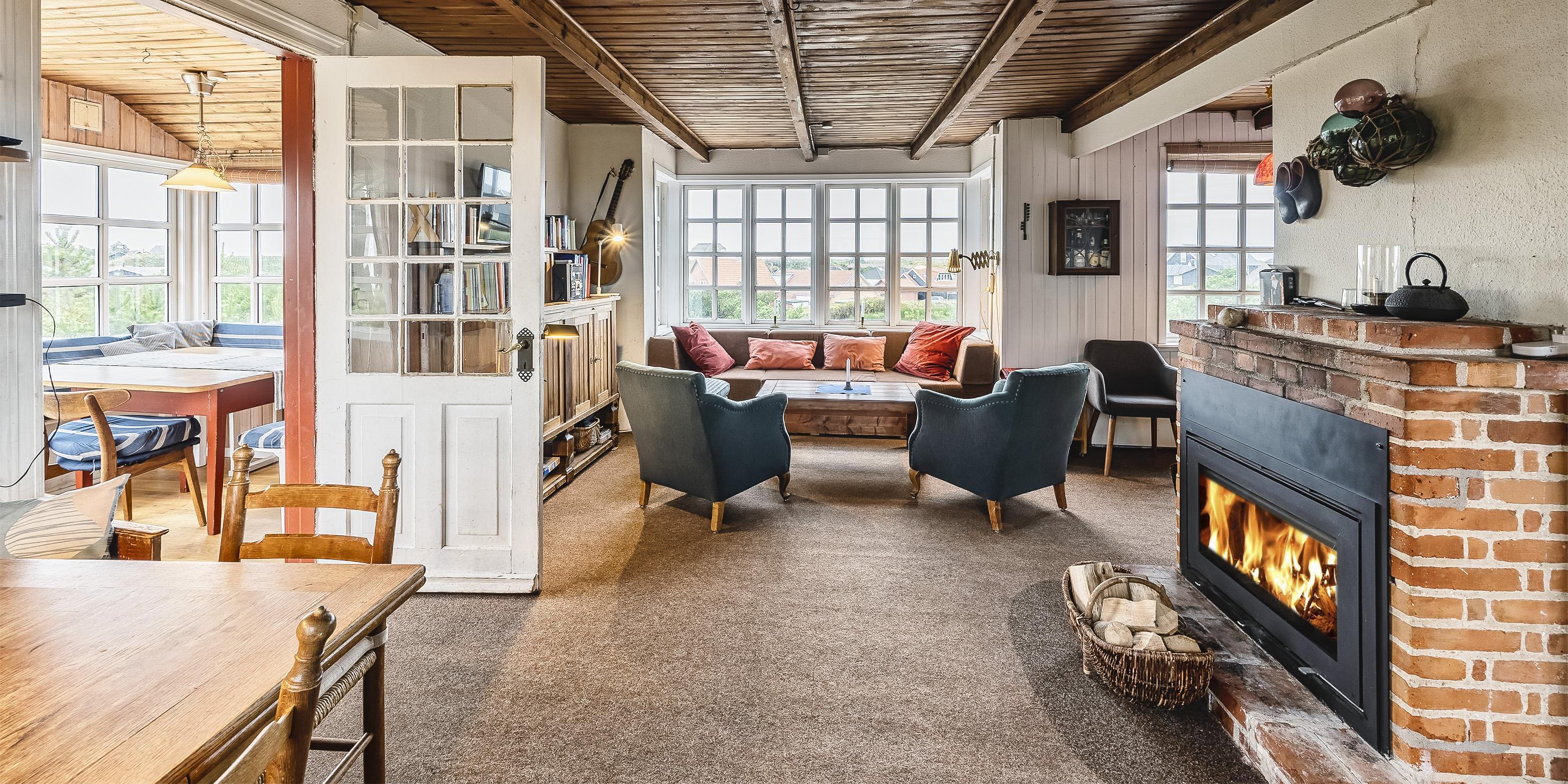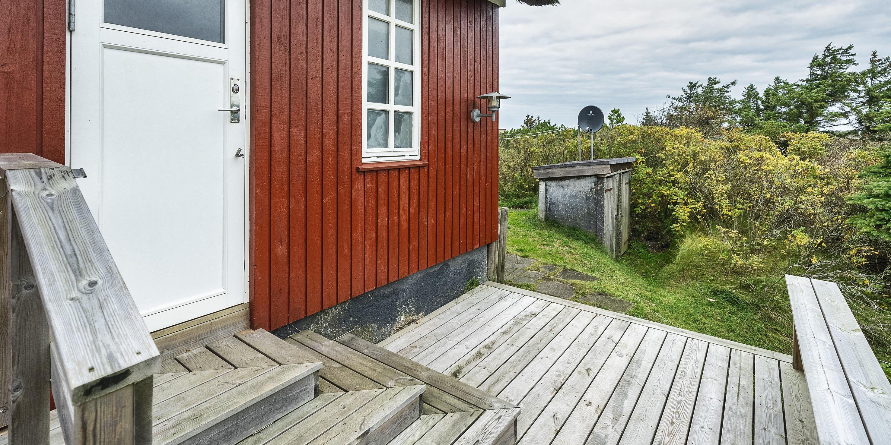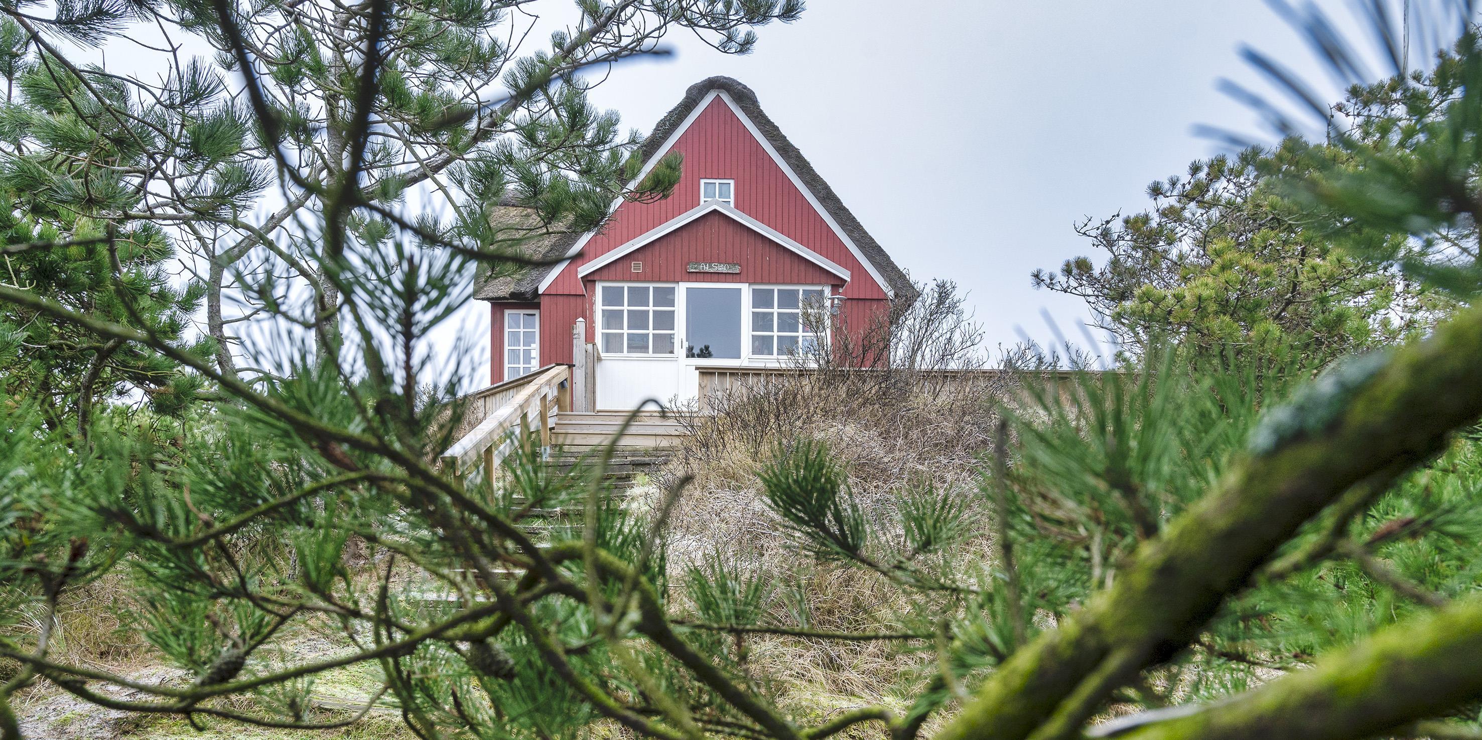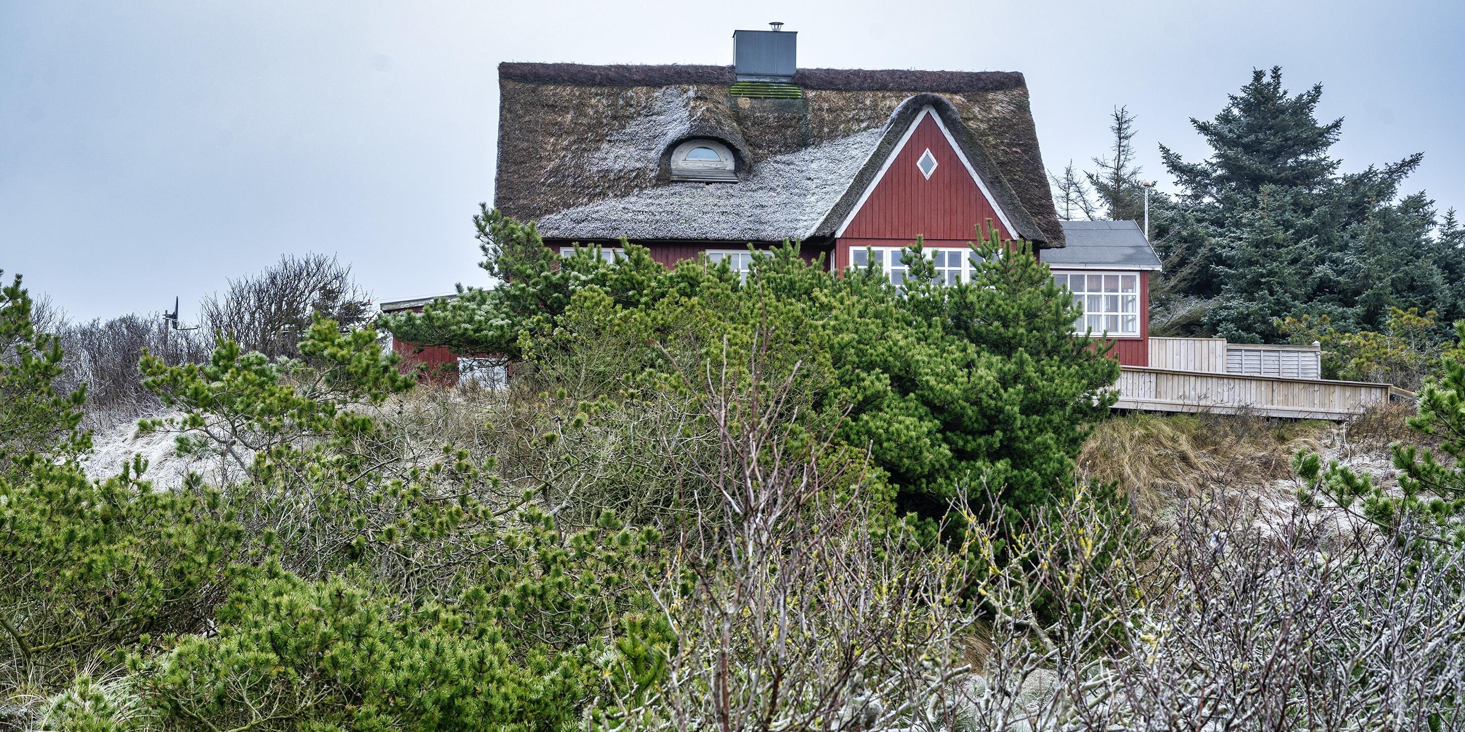 Charmerende, stråtækt ældre sommerhus beliggende højt på en klit. Huset er kaldt ”Alsbo” og er på 2 etager. Fra øverste etage har du en vidunderlig udsigt over det store sommerhusområde ved Vejers Strand. Feriehuset er indrettet til 6 personer og huset ligger cirka 400 meter fra stranden. Udestuen fungerer også som indgangsparti. Et hyggeligt sidde hjørne er placeret i udestuen, hvorfra du har en fantastisk udsigt gennem den store vinduesfront. Opholds- og spiseafdelingen er kombineret og indrettet med charmerende møbler. De danske tv-programmer kan modtages via udbyderen Stofa. Den indbyggede pejs giver varme og hygge mens Morsø pejsen er til pynt og kan ikke fyres. Køkkenet er et separat rum og er holdt enkelt, men har alt hvad du skal bruge til hverdagsbrug. Køkkenet er udstyret med keramisk kogeplade, ovn, opvaskemaskine, mikroovn og køleskab med fryser. Badeværelset har toilet, håndvask og bruser. Vaskemaskinen er anbragt i badeværelset. Endvidere er badeværelset udstyret med gulvvarme. Feriehuset har i alt tre soveværelser: DS + DS + 2S. Et soveværelse er i stueetagen og de to andre er ovenpå. Soveværelset nedenunder har en dobbeltseng (160x200). I det ene hjørne af opholdsområdet er trætrappen, som fører dig til det øverste område. Et soveværelse ovenpå har to enkeltsenge og det andet soveværelse har en dobbeltseng (140x20). Soveværelset med dobbeltsengen har også et lille hyggehjørne, udstyret med en lille madras. Huset har internetforbindelse (W-Lan). Det er tilladt at tage 2 hunde med. Rygning i ferieboligen er ikke tilladt. Der er bygget en træterrasse næsten rundt om hele huset. Feriehuset er bygget i 1930.