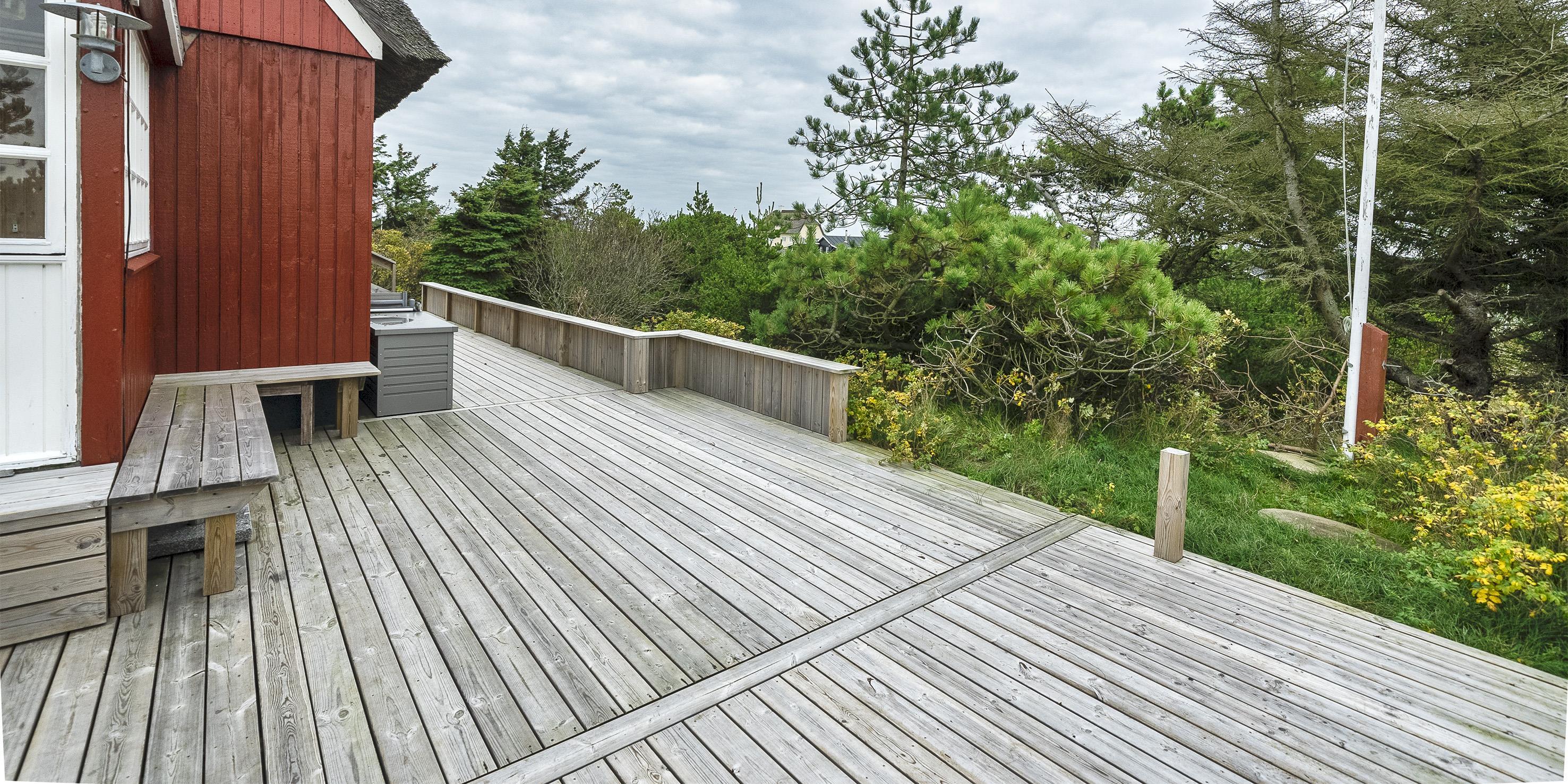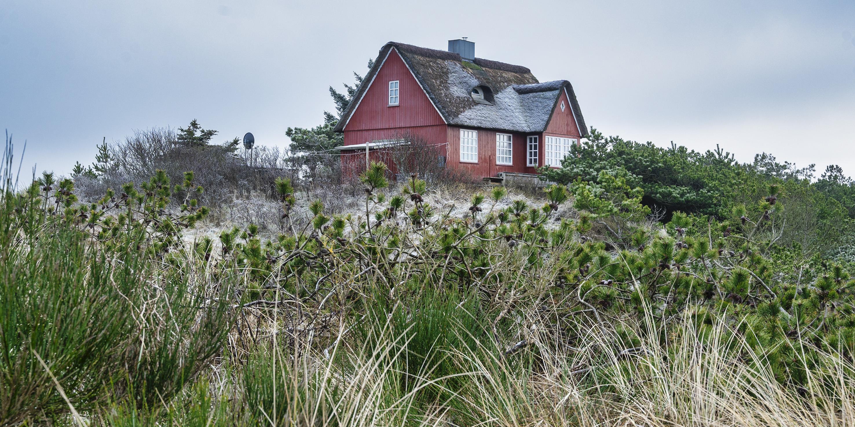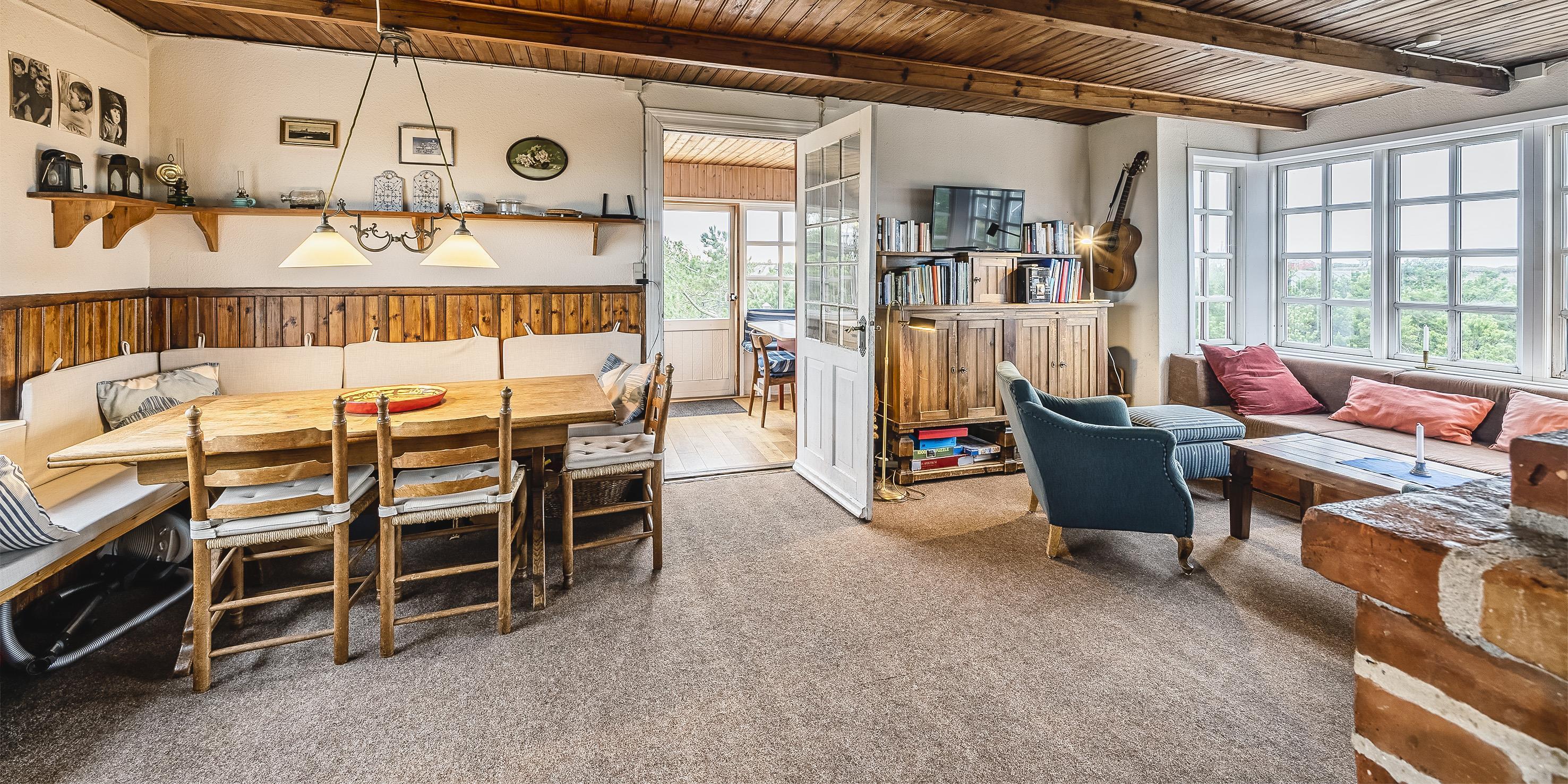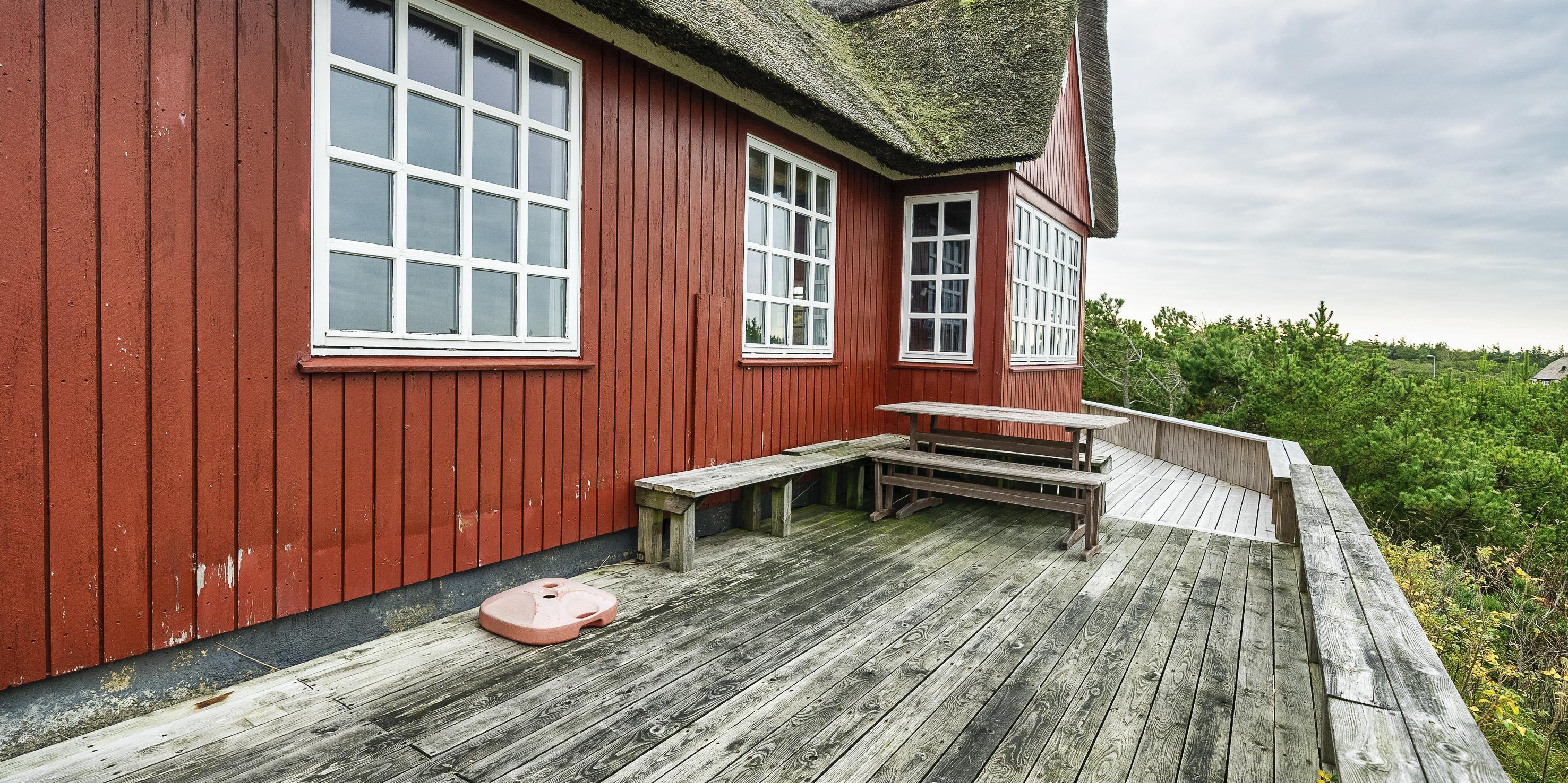 Charmerende, stråtækt ældre sommerhus beliggende højt på en klit. Huset er kaldt ”Alsbo” og er på 2 etager. Fra øverste etage har du en vidunderlig udsigt over det store sommerhusområde ved Vejers Strand. Feriehuset er indrettet til 6 personer og huset ligger cirka 400 meter fra stranden. Udestuen fungerer også som indgangsparti. Et hyggeligt sidde hjørne er placeret i udestuen, hvorfra du har en fantastisk udsigt gennem den store vinduesfront. Opholds- og spiseafdelingen er kombineret og indrettet med charmerende møbler. De danske tv-programmer kan modtages via udbyderen Stofa. Den indbyggede pejs giver varme og hygge mens Morsø pejsen er til pynt og kan ikke fyres. Køkkenet er et separat rum og er holdt enkelt, men har alt hvad du skal bruge til hverdagsbrug. Køkkenet er udstyret med keramisk kogeplade, ovn, opvaskemaskine, mikroovn og køleskab med fryser. Badeværelset har toilet, håndvask og bruser. Vaskemaskinen er anbragt i badeværelset. Endvidere er badeværelset udstyret med gulvvarme. Feriehuset har i alt tre soveværelser: DS + DS + 2S. Et soveværelse er i stueetagen og de to andre er ovenpå. Soveværelset nedenunder har en dobbeltseng (160x200). I det ene hjørne af opholdsområdet er trætrappen, som fører dig til det øverste område. Et soveværelse ovenpå har to enkeltsenge og det andet soveværelse har en dobbeltseng (140x20). Soveværelset med dobbeltsengen har også et lille hyggehjørne, udstyret med en lille madras. Huset har internetforbindelse (W-Lan). Det er tilladt at tage 2 hunde med. Rygning i ferieboligen er ikke tilladt. Der er bygget en træterrasse næsten rundt om hele huset. Feriehuset er bygget i 1930.