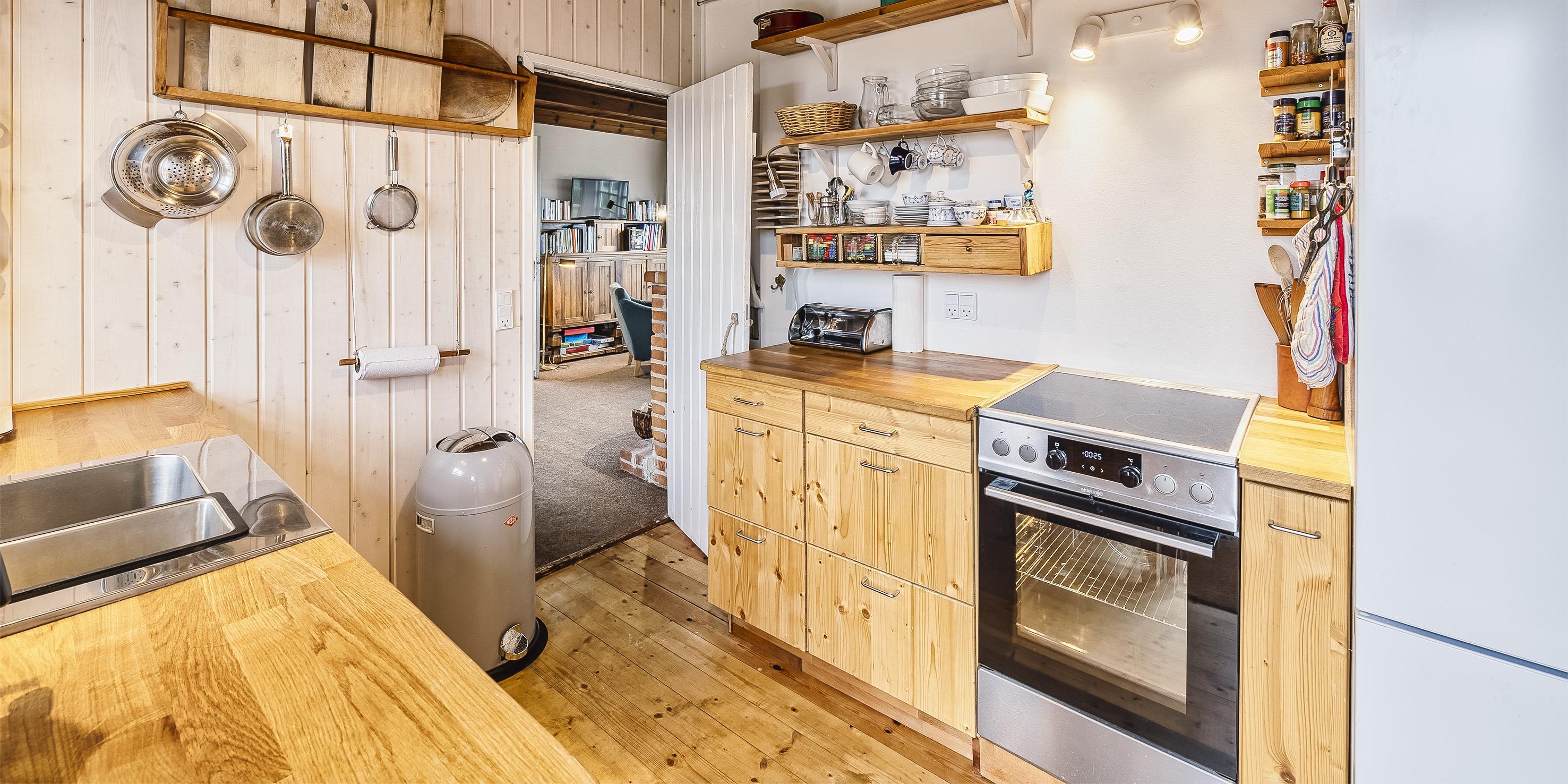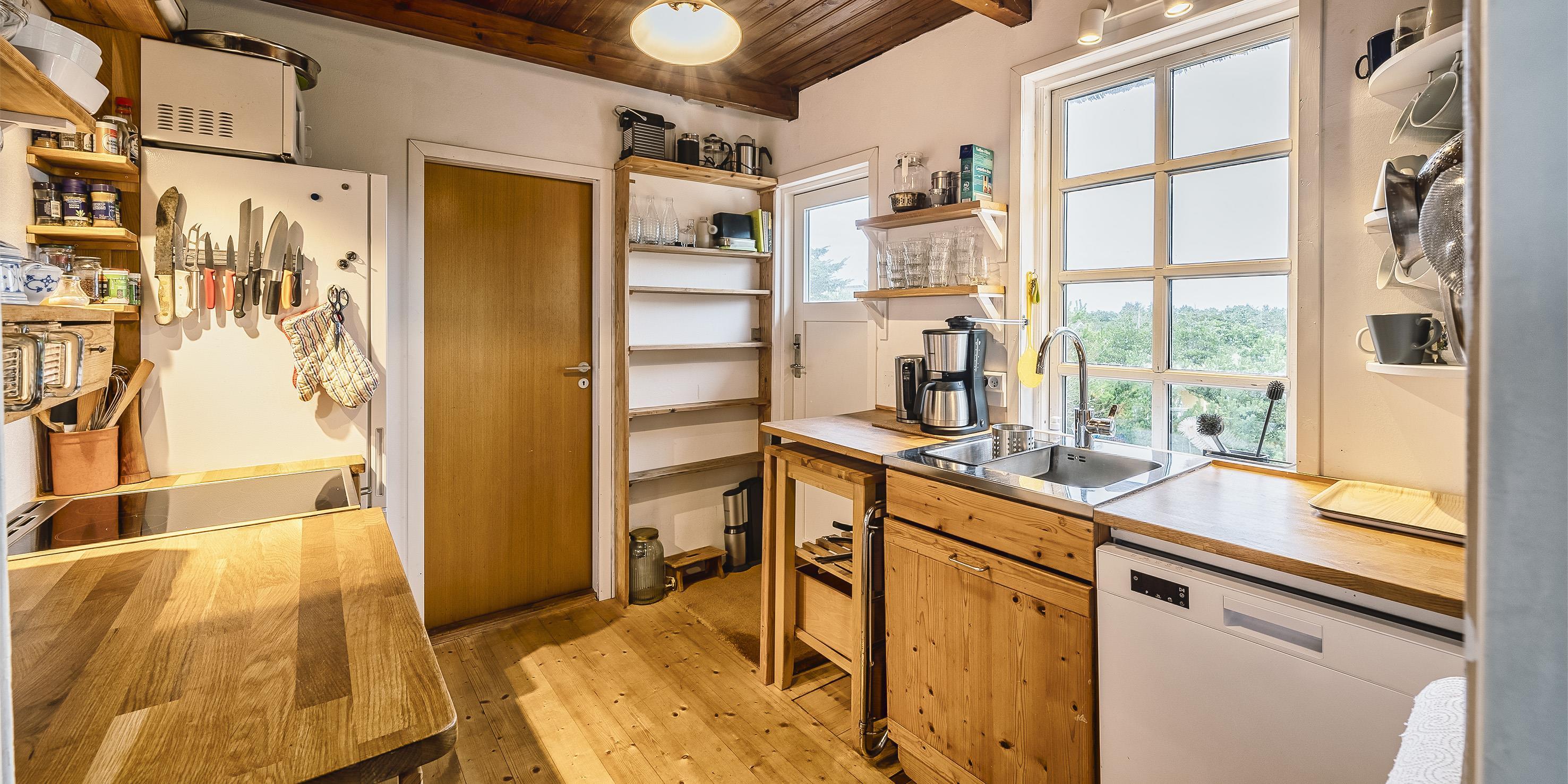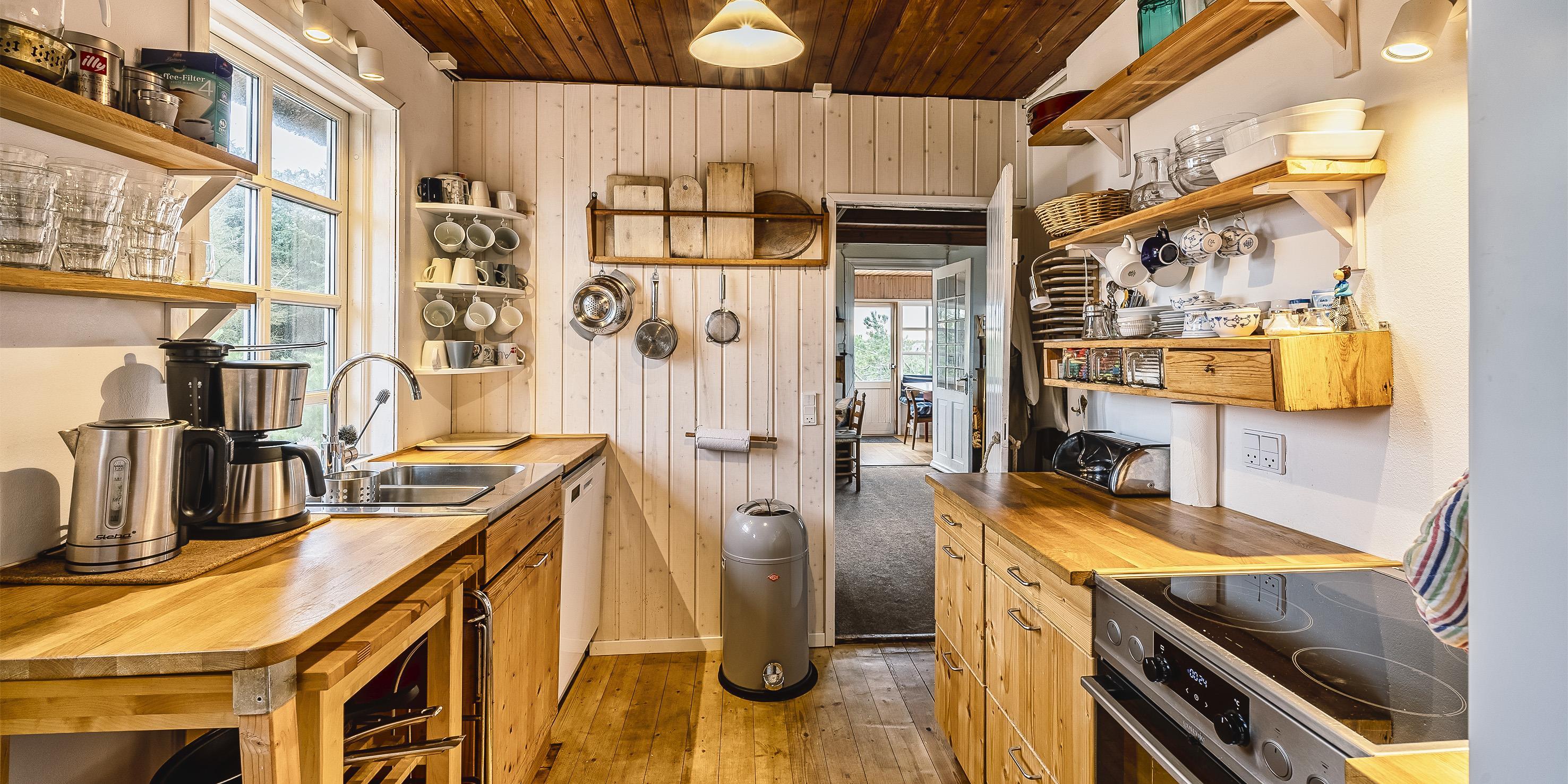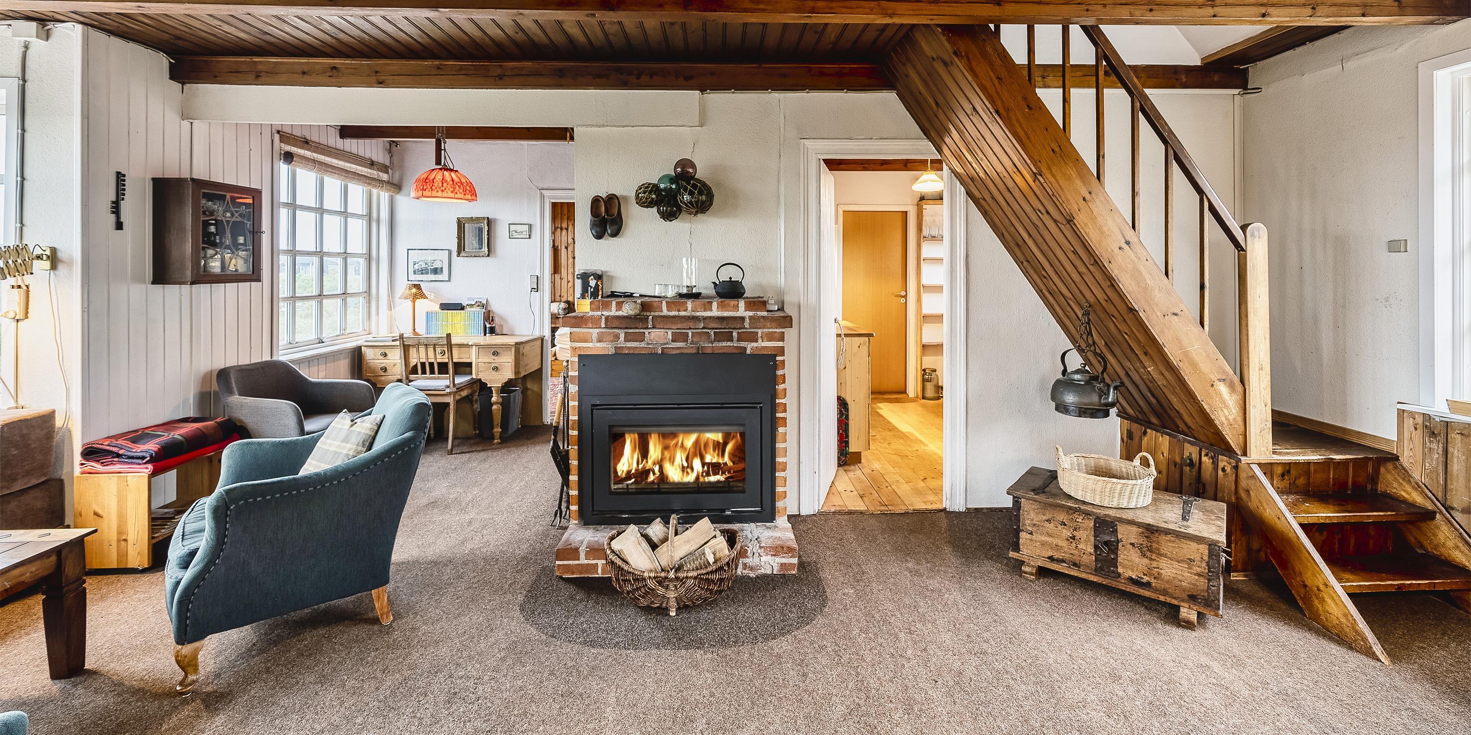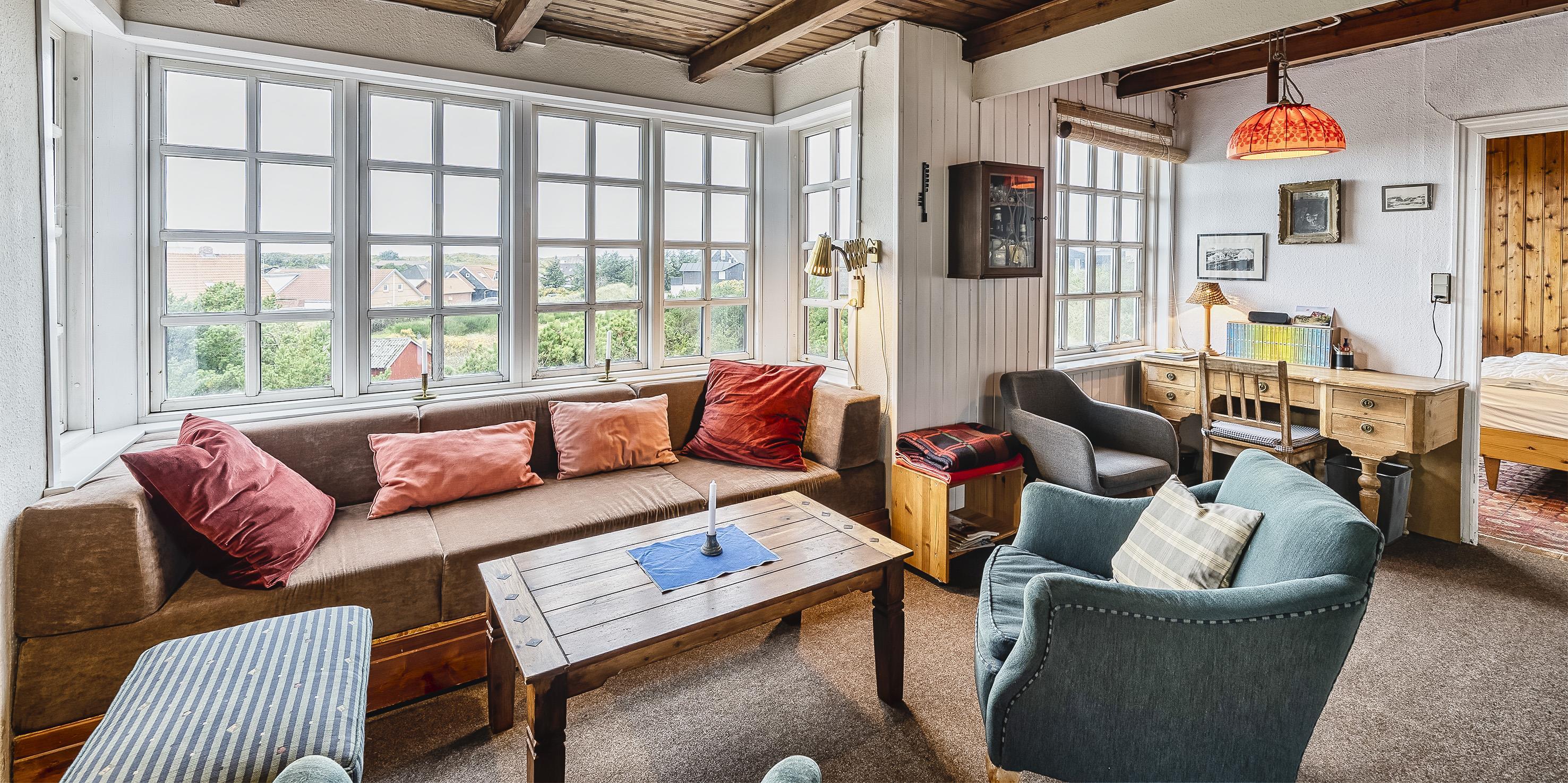 Charmerende, stråtækt ældre sommerhus beliggende højt på en klit. Huset er kaldt ”Alsbo” og er på 2 etager. Fra øverste etage har du en vidunderlig udsigt over det store sommerhusområde ved Vejers Strand. Feriehuset er indrettet til 6 personer og huset ligger cirka 400 meter fra stranden. Udestuen fungerer også som indgangsparti. Et hyggeligt sidde hjørne er placeret i udestuen, hvorfra du har en fantastisk udsigt gennem den store vinduesfront. Opholds- og spiseafdelingen er kombineret og indrettet med charmerende møbler. De danske tv-programmer kan modtages via udbyderen Stofa. Den indbyggede pejs giver varme og hygge mens Morsø pejsen er til pynt og kan ikke fyres. Køkkenet er et separat rum og er holdt enkelt, men har alt hvad du skal bruge til hverdagsbrug. Køkkenet er udstyret med keramisk kogeplade, ovn, opvaskemaskine, mikroovn og køleskab med fryser. Badeværelset har toilet, håndvask og bruser. Vaskemaskinen er anbragt i badeværelset. Endvidere er badeværelset udstyret med gulvvarme. Feriehuset har i alt tre soveværelser: DS + DS + 2S. Et soveværelse er i stueetagen og de to andre er ovenpå. Soveværelset nedenunder har en dobbeltseng (160x200). I det ene hjørne af opholdsområdet er trætrappen, som fører dig til det øverste område. Et soveværelse ovenpå har to enkeltsenge og det andet soveværelse har en dobbeltseng (140x20). Soveværelset med dobbeltsengen har også et lille hyggehjørne, udstyret med en lille madras. Huset har internetforbindelse (W-Lan). Det er tilladt at tage 2 hunde med. Rygning i ferieboligen er ikke tilladt. Der er bygget en træterrasse næsten rundt om hele huset. Feriehuset er bygget i 1930.