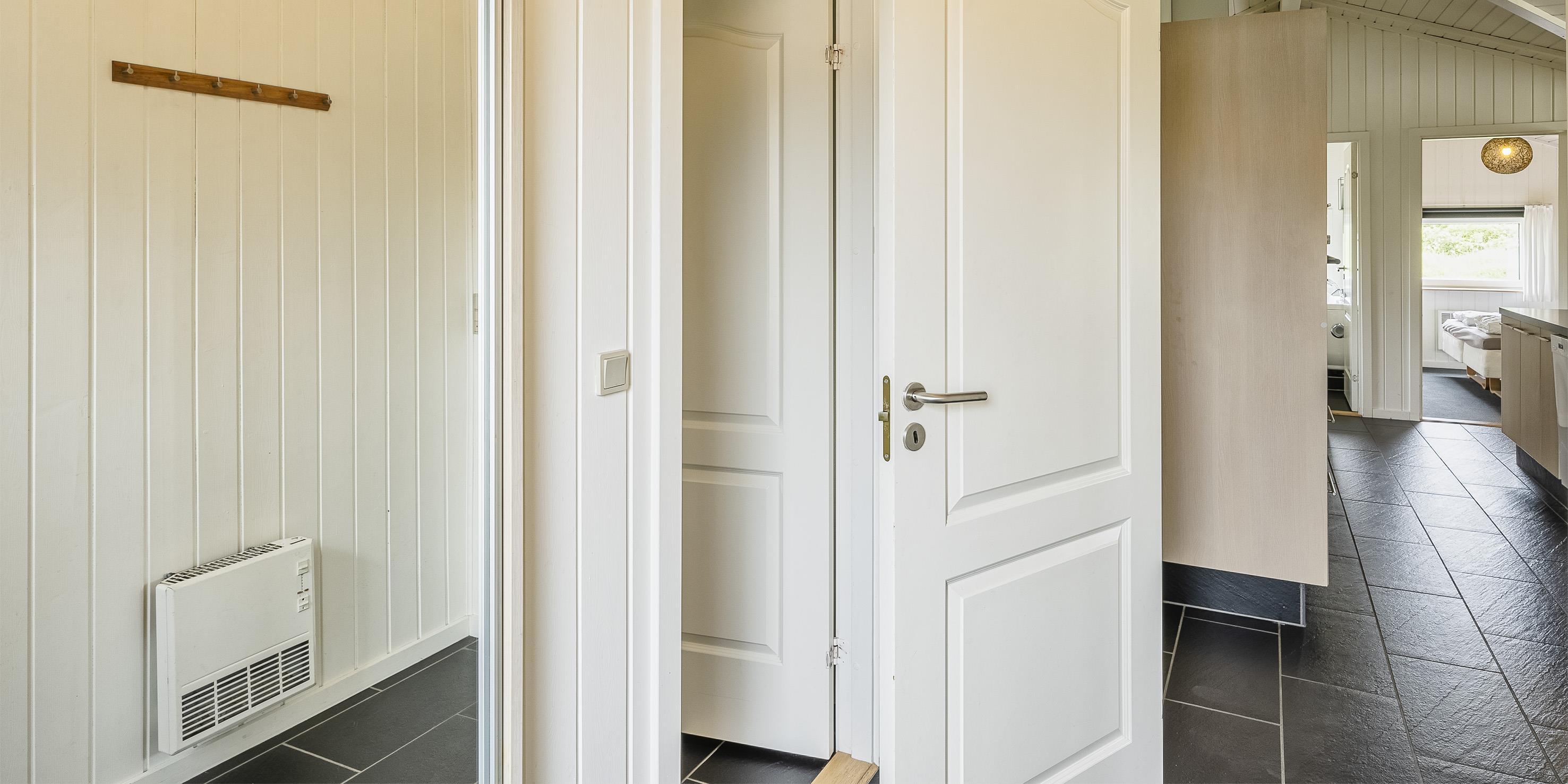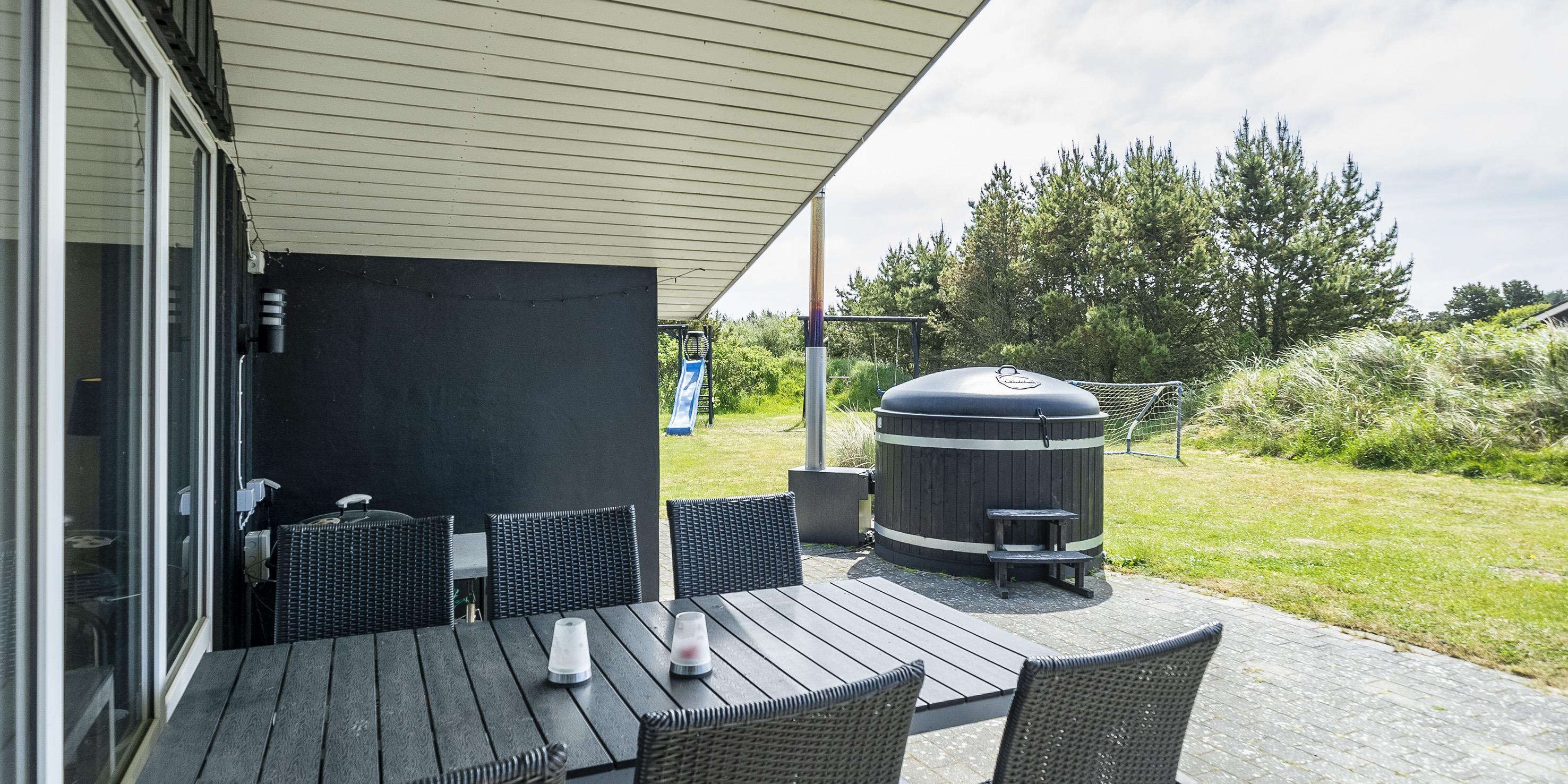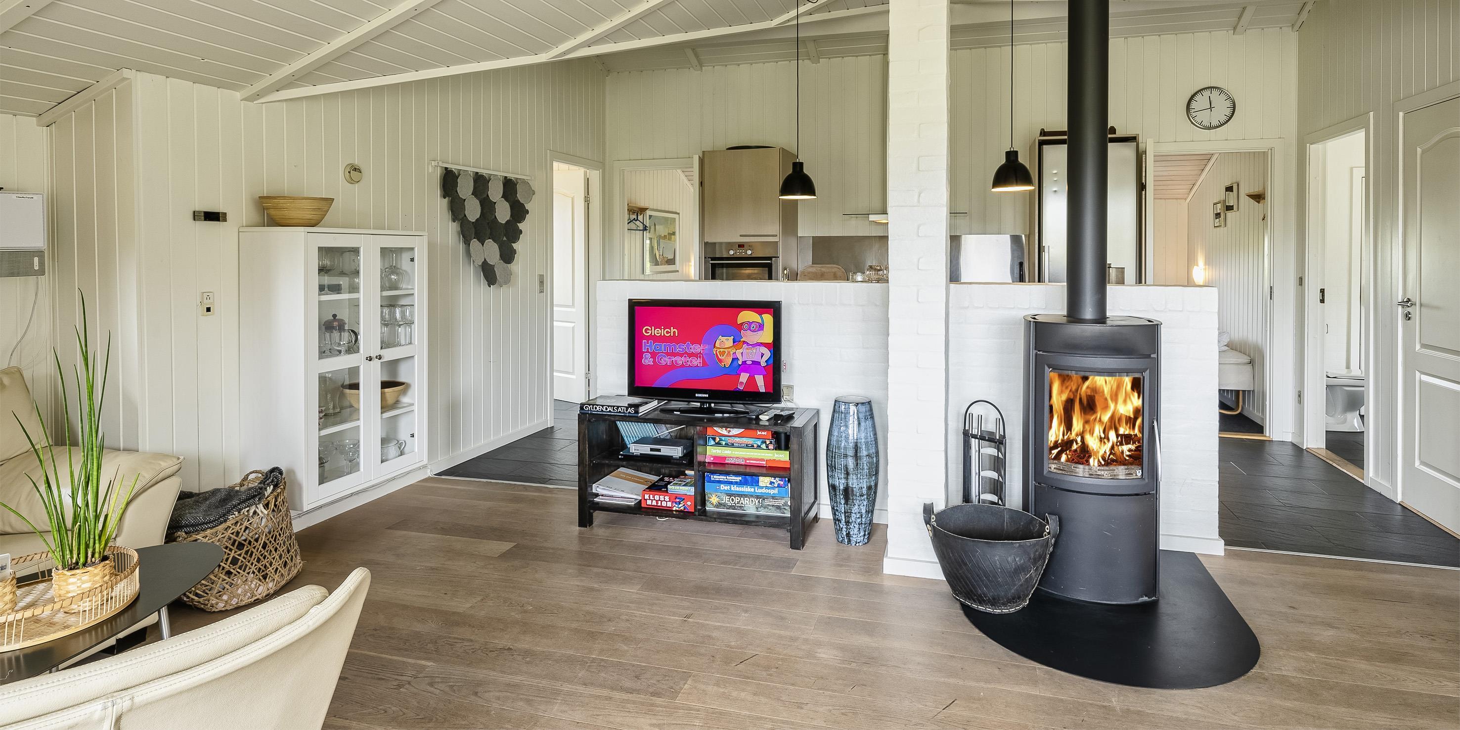 Sommerhuset: Entre med plads til garderoben. Huset råder over 2 dejlige badeværelser med gulvvarme. Det ene badeværelse med sauna og spa. Stort køkkenalrum og stue ud i et samt god spiseplads. Rummet er lyst og dejligt med gode vinduespartier og udgang til terrassen. Terrassen er delvis overdækket og med vildmarksbad. Køkkenet fremstår med alt komfort såsom opvaskemaskine, mikroovn, kogeplade, emhætte og køle-/frysekombination. Dejlig opholdsstue med brændeovn, DVD-afspiller, fjernsyn, radio og trådløs internetadgang. De danske programmer kan streames via Google Chrome Cast. Huset har i alt 3 soverum: DS + 2S + 2S. 2 soveværelser med hver 2 enkeltsenge og 1 soveværelse med 1 dobbeltseng. Vaskemaskine og tørretumbler befinder sig ved garderoben. Dejlig terrasse-miljø med havemøbler, grill og vildmarksbad. På terrassen kan dagene nydes fra morgen til aften. Carport, hvor bilen kan parkeres.