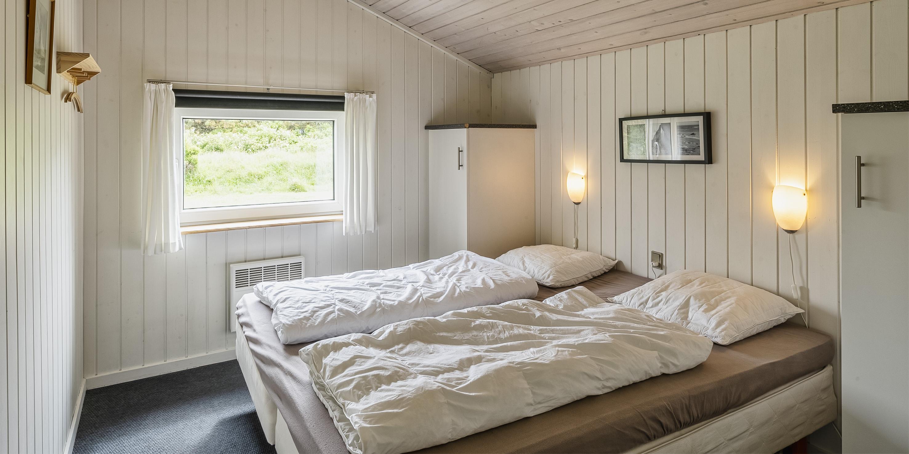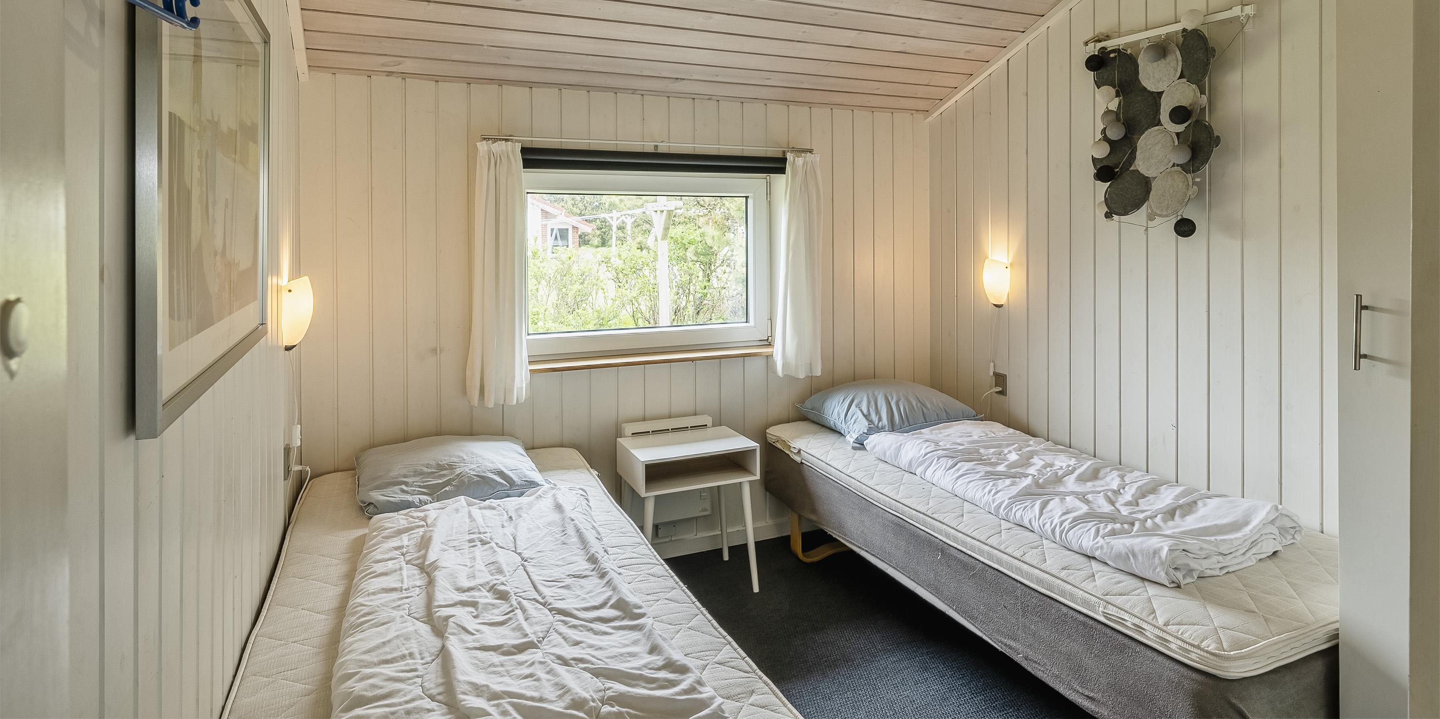3 soveværelser. 1 med dobbeltseng 180x200 cm. 2 med 2 enkeltsenge (á 90x200 cm)