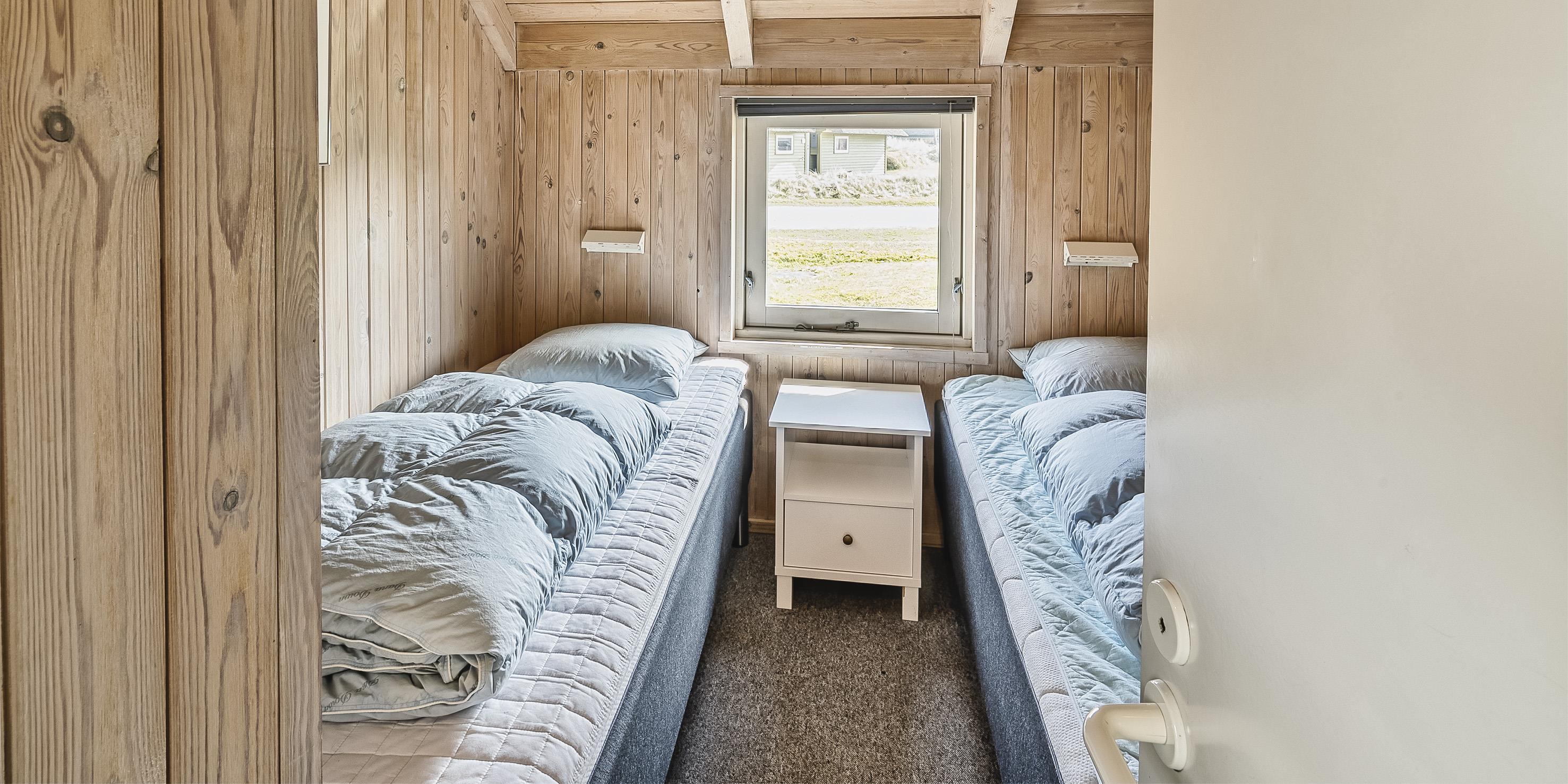 4 soveværelser. 2 med dobbeltseng 180x200 cm. 2 med 2 enkeltsenge (á 90x200 cm)