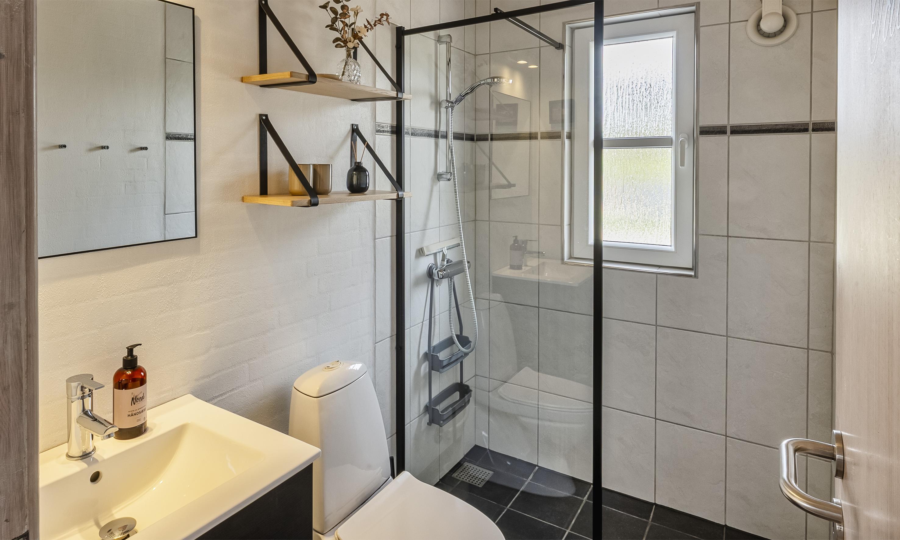 Bad med toilet, bruser og vask