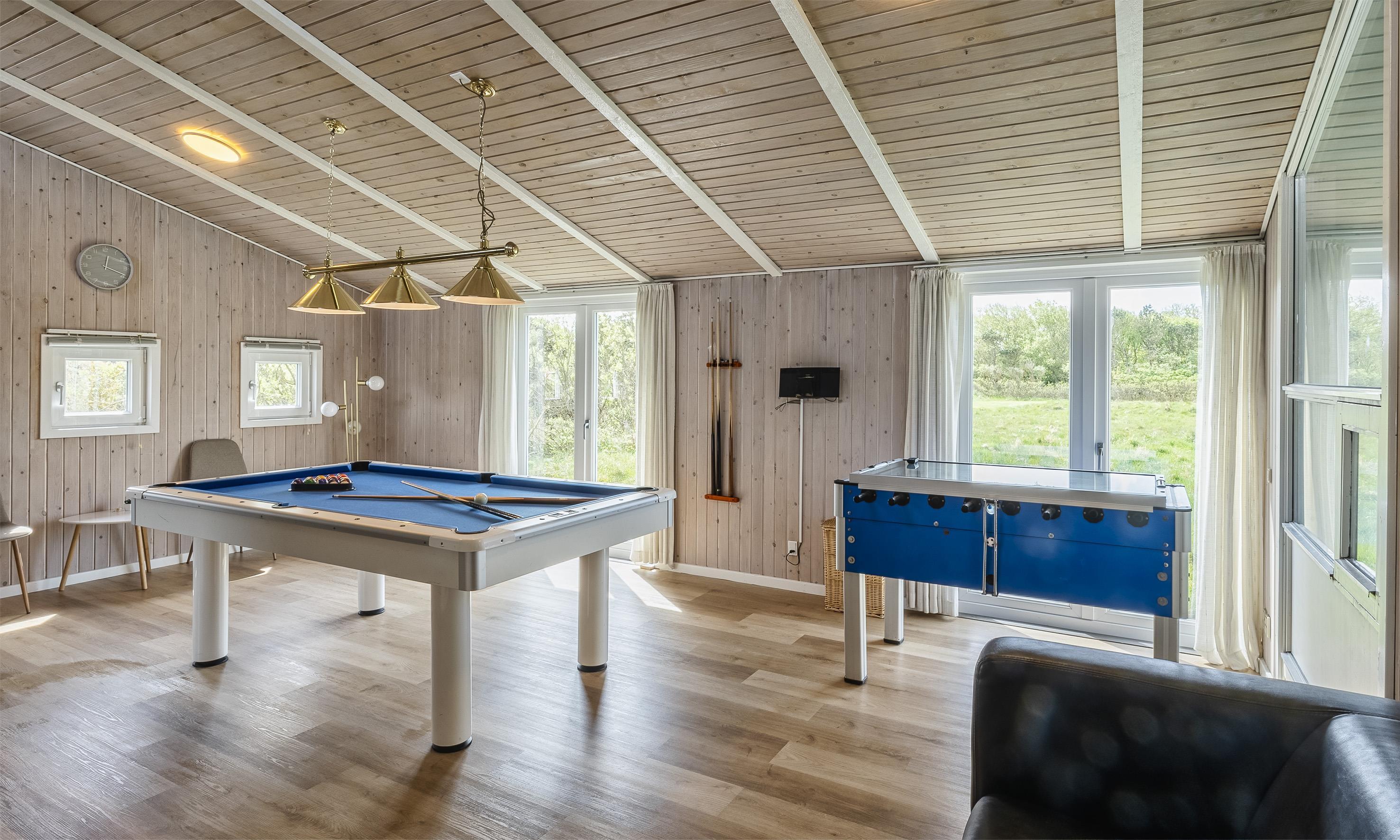 Stort og lyst aktivitetsrum med bordtennis, billardbord og bordfodbold.