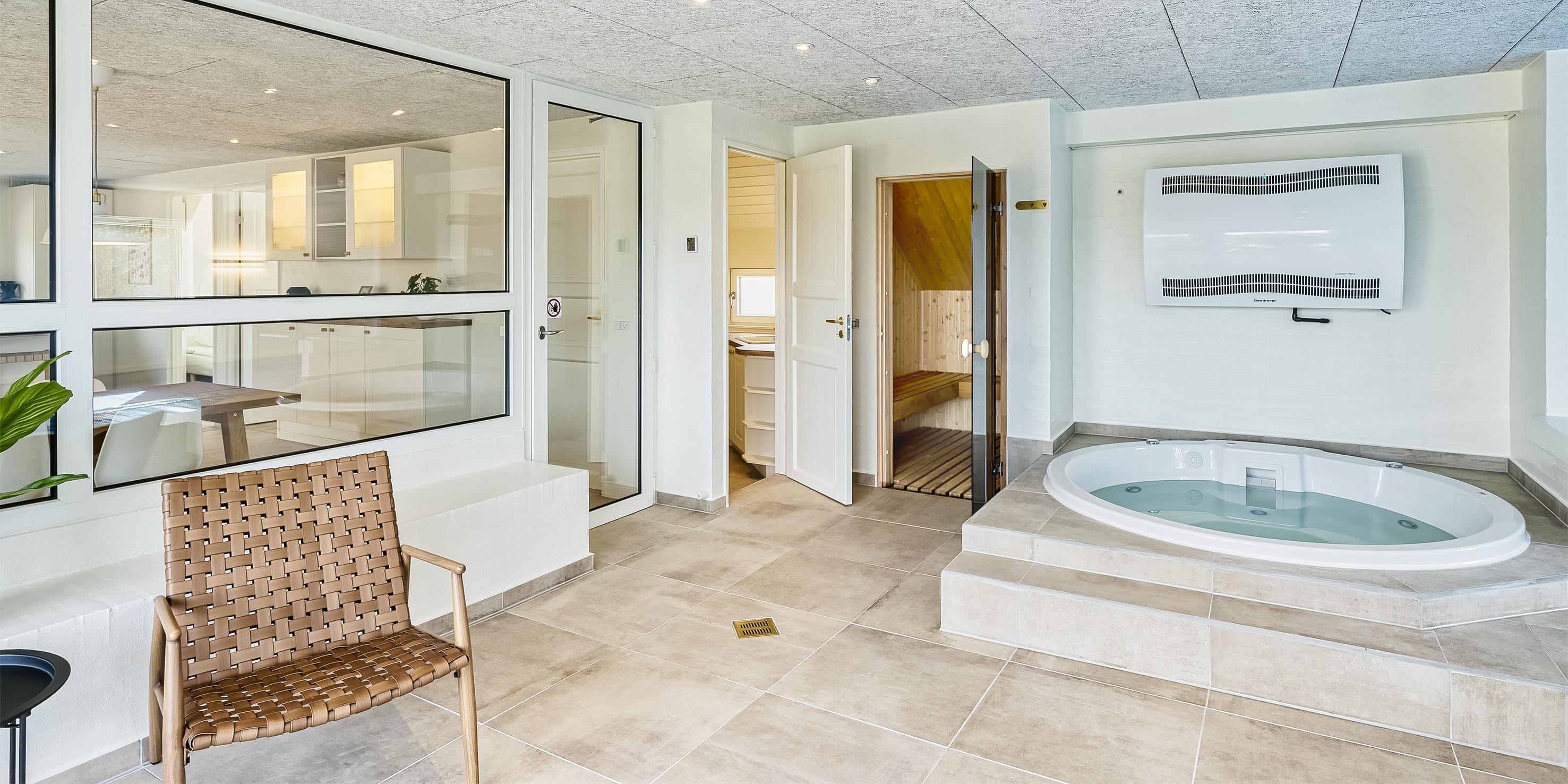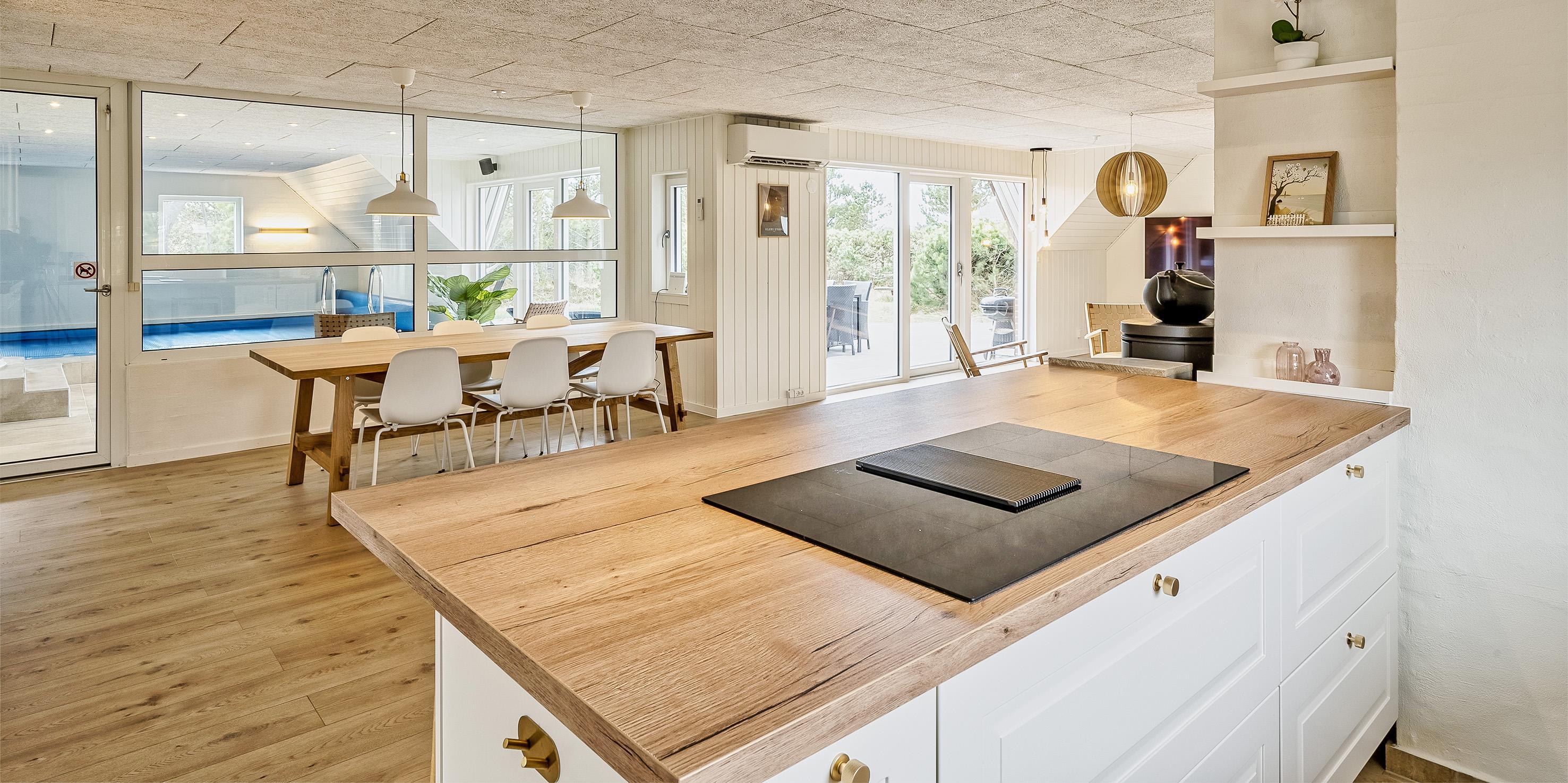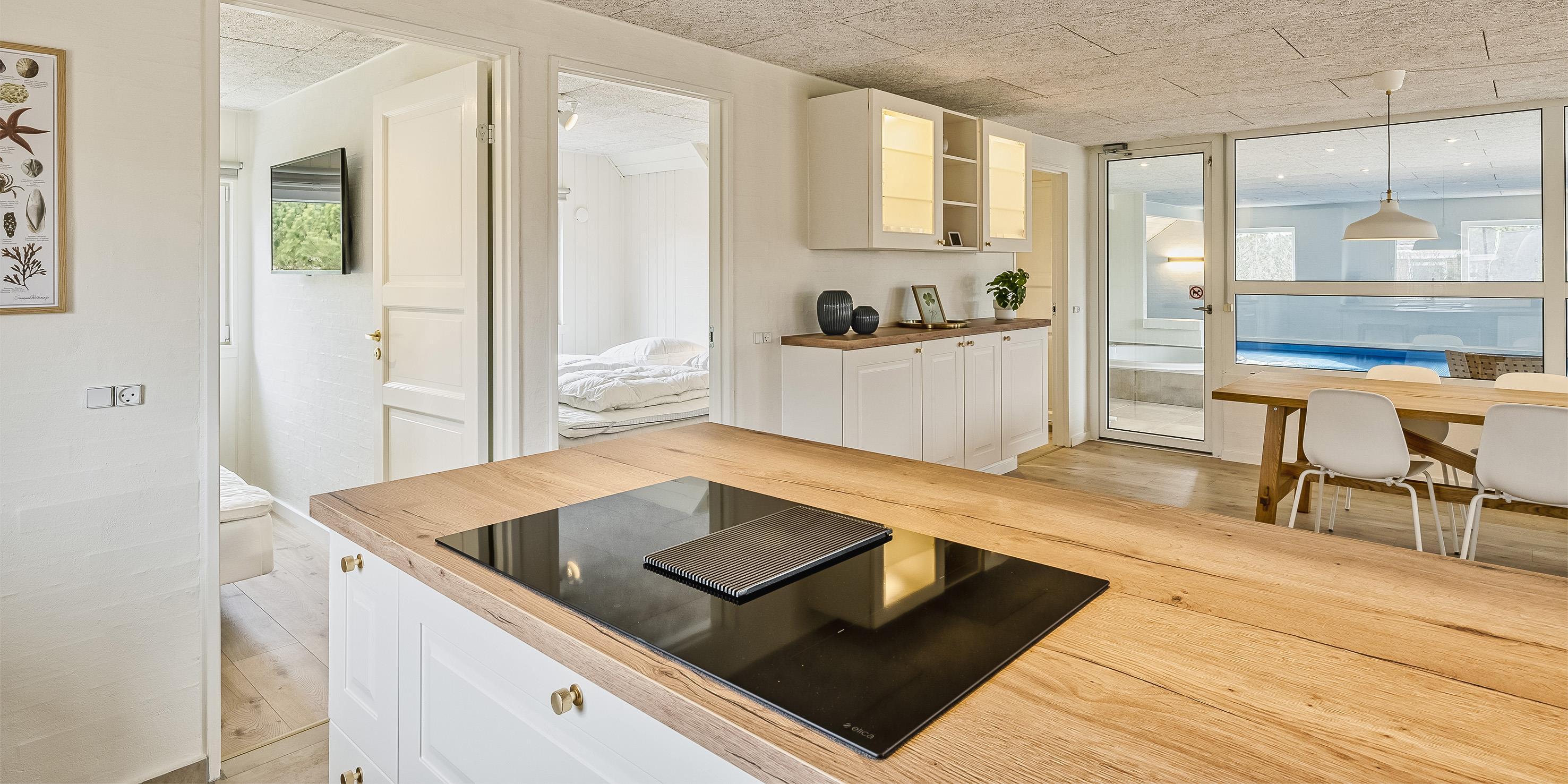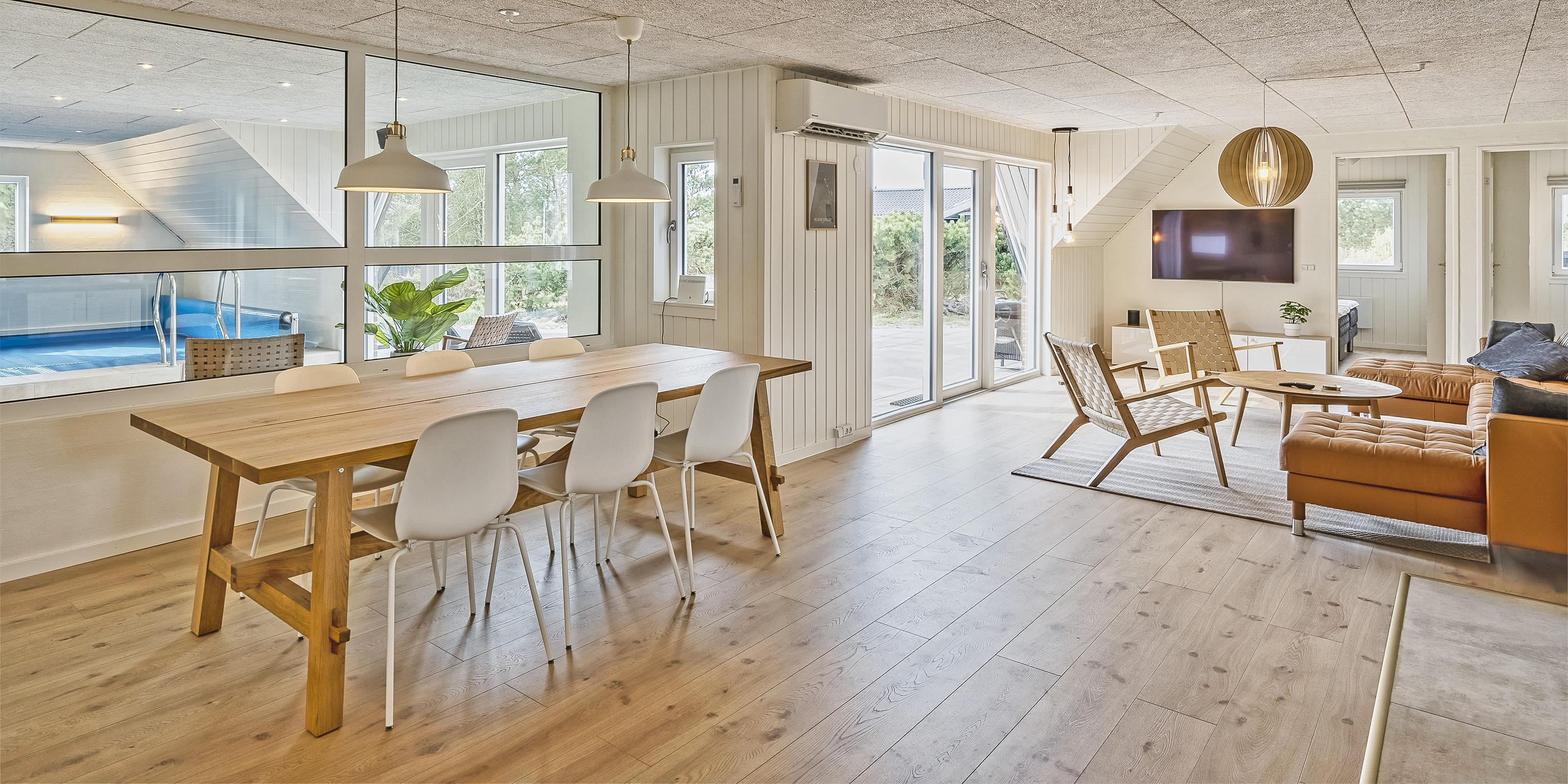 Huset indeholder: Nyt lyst køkken med opvaskemaskine, mikroovn og køle-/frysekombination. Køkkenet er i åben forbindelse med spiseplads og stuen. Stuen er indrettet i lyse nordiske farver. Stue med ny brændeovn, Smart-tv og YouSee App, hvor de danske programmer kan streames fra. Fra spisepladsen har man udsyn til poolrummet. 5 soveværelser: DS + DS + DS + DS + 2S. 4 gode soveværelser med hver 1 dobbeltseng og 1 soveværelse med 2 enkeltsenge. 2 badeværelser med bruser/wc. Begge badeværelser er nyrenoverede og lysnet. Poolrum med swimmingpool (ca. 7,25 meter x 3,20 meter x 1,30 meter dybt), stor standvandsspa ( til ca. 6 personerog sauna. Huset har også en vaskemaskine og tørretumbler. Trådløs Internetadgang. Laderstander til el-bil.