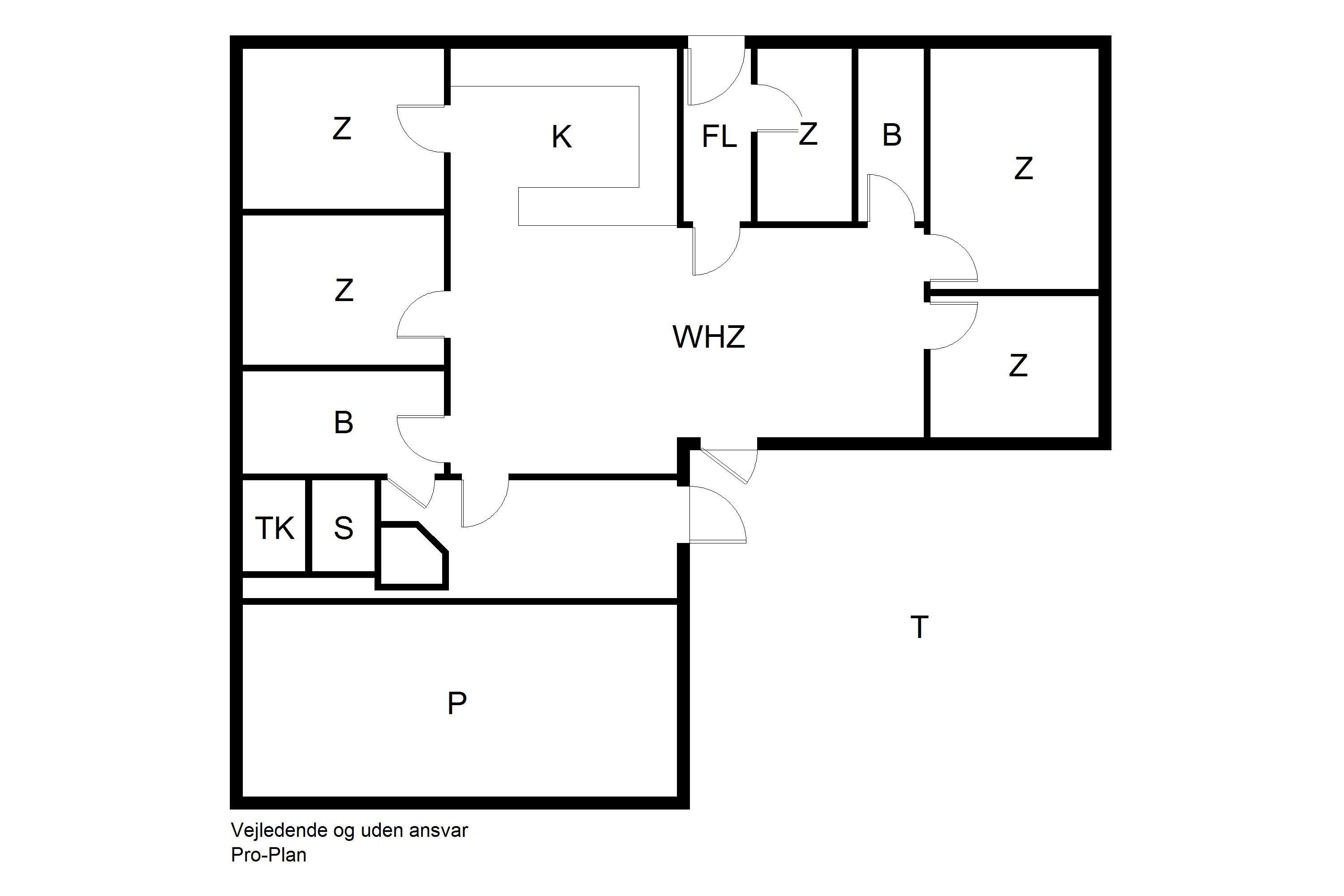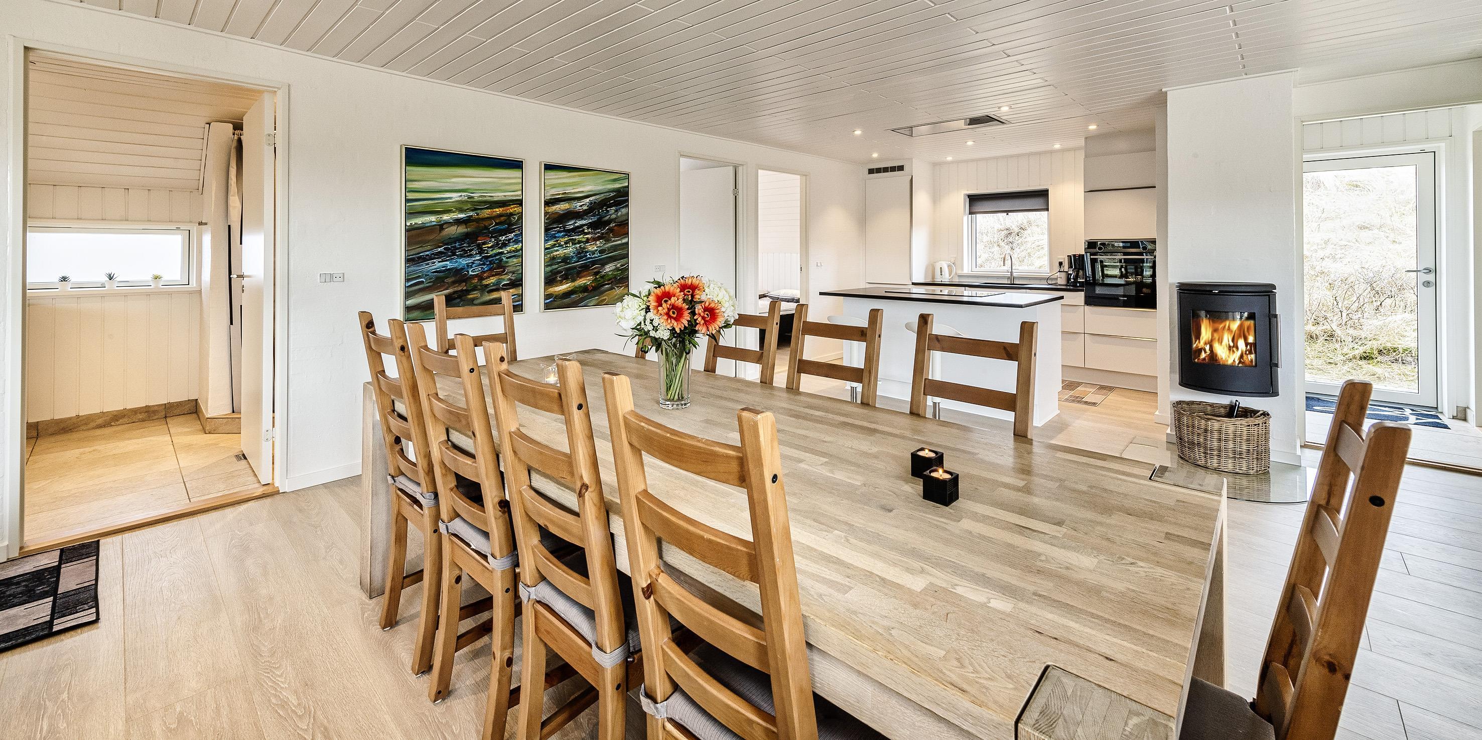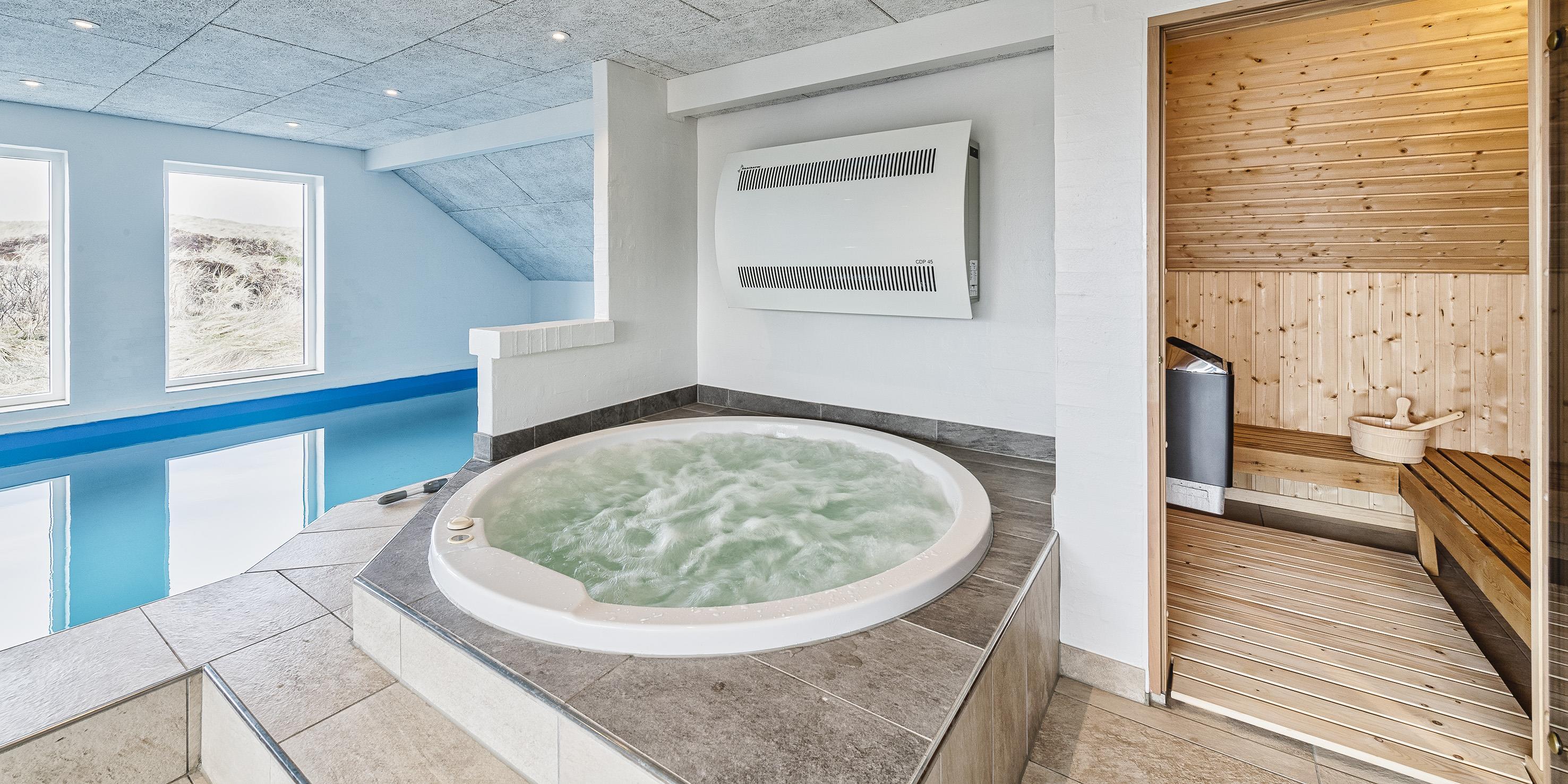 Huset indeholder: Indgang/fordelingsgang. Fra indgangen kommer man over i husets åbne opholdsrum. Opholdsrummet er opdelt i åbent køkken-alrum, spisestueafdeling og en dejlig sofa område. Opholdsstuen har et stort vinduesparti hvorfra udsigten ud over klitlandskabet kan nydes i fulde drag. Stuen er indrettet med dejligt sofaområde med stofa-TV (sommerhuspakken), trådløst internet og brændeovn. Nyt lyst køkken i åben forbindelse med spisestuen. Køkkenet fremstår med køle-/fryseskab, indbygningsovn, kogeø med keramisk kogeplade, emhætte. I forbindelse med køkkenet, er der en åben spiseplads med kig til pool afdelingen. Fra stuen er der adgang til det store poolrum, poolen er ca.7,3 x 3,3 x1,30 meter ( længde x brede x dybde), der forefindes en fastvandspa til 5 personer, sauna og en dejlig afslapningsplads ved vinduespartiet mod syd. Stort badeværelse med bruser/wc, vaskearrangement. Hele herligheden kan nydes fra stuen igennem det store vinduesparti. Huset råder over 5 soveværelse: DS + DS + DS + DS + 2S, 4 rummelige soveværelser med hver en dobbeltseng og garderobeskabe, 1 soveværelse med køjeseng. Badeværelse med bruser/wc og vaskearrangement samt vaskemaskine og tørretumbler. Dejlig sydvendt terrasse med gode havemøbler og med en pragtfuld udsigt over klitlandskabet. Rygning er ikke tilladt. Der kan ikke parkeres direkte ved huset, der adgang via en trappe. Byggeår 1993. Total renoveret i 2020.