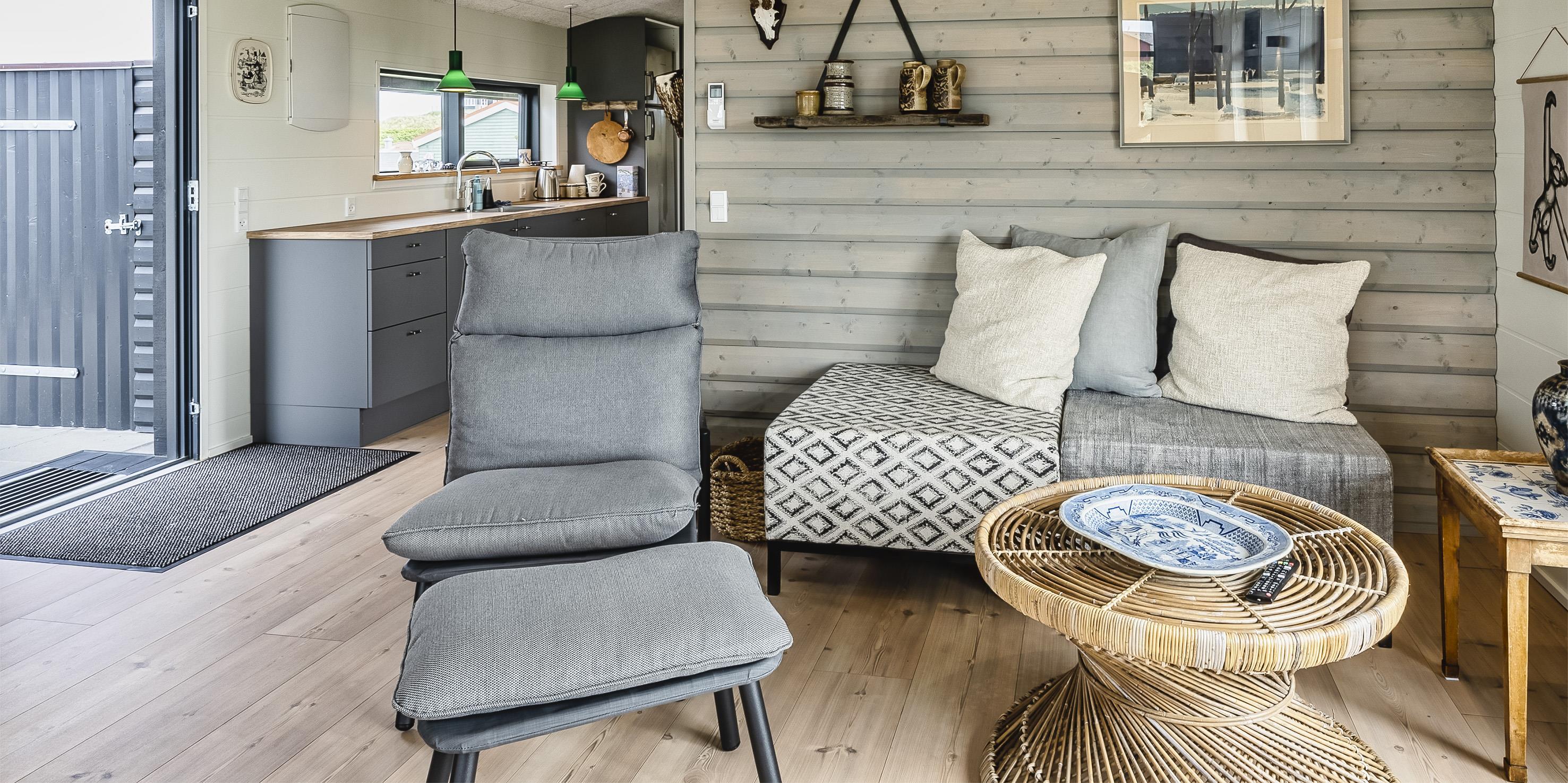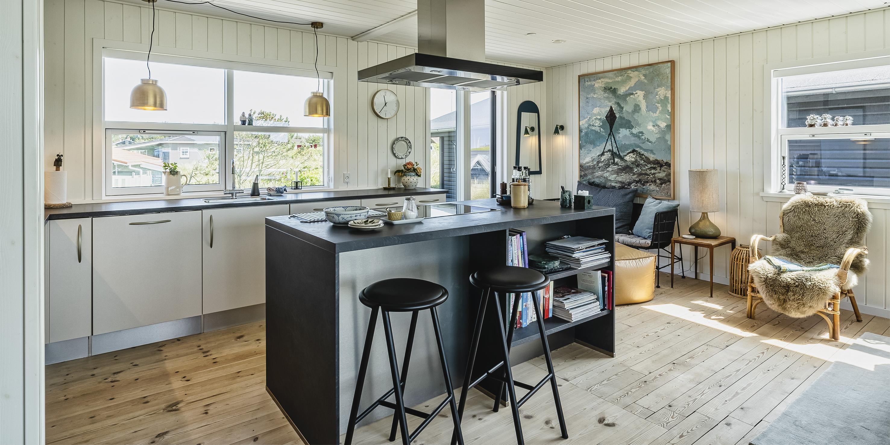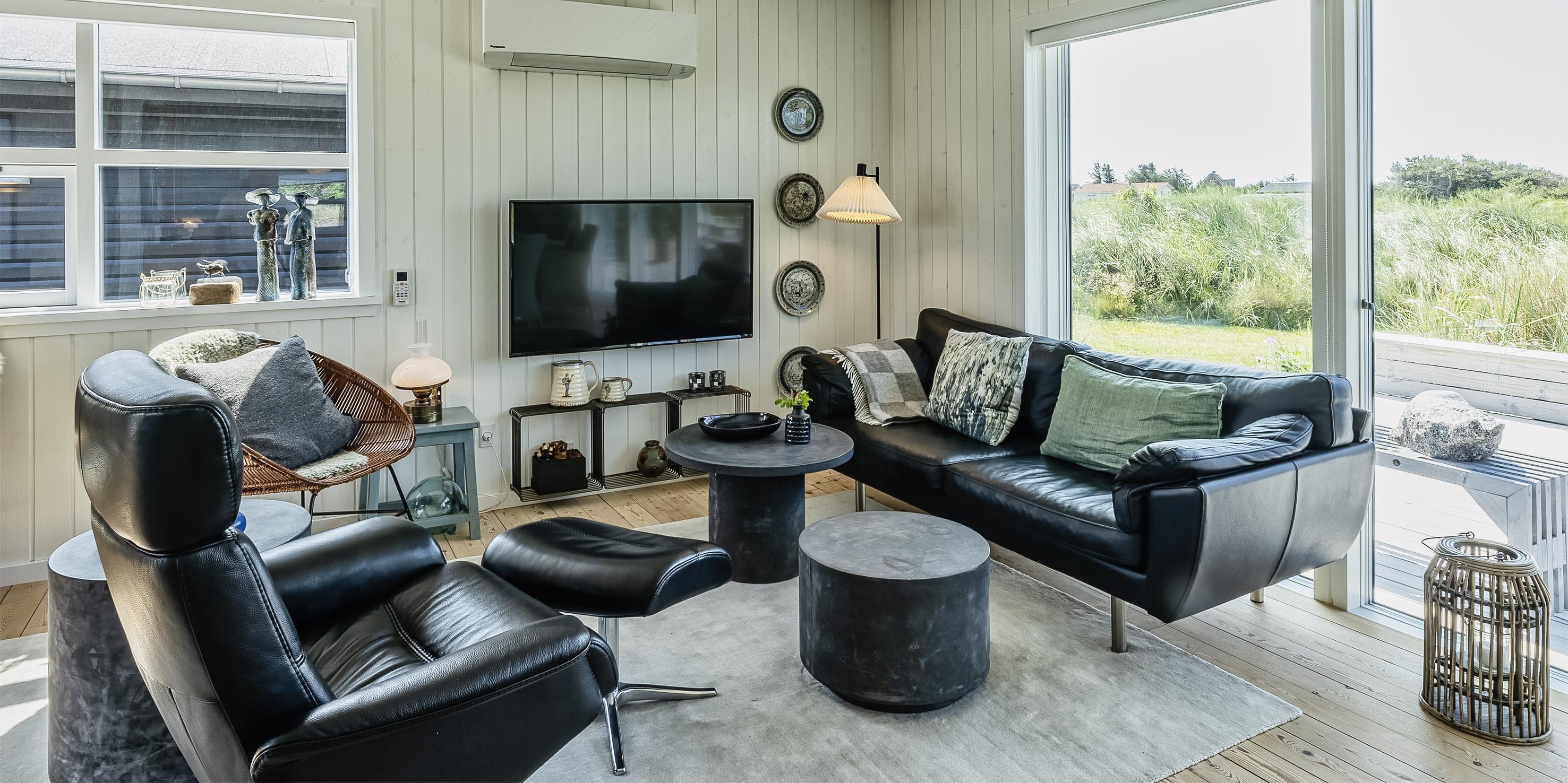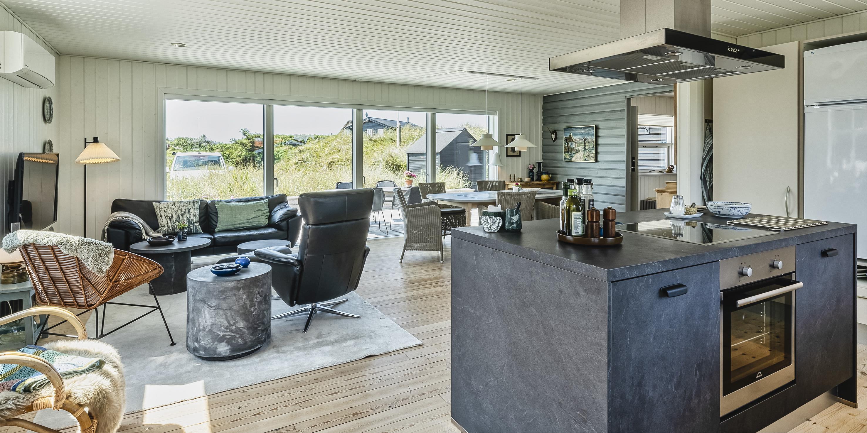 Sommerhuset byder på en skøn atmosfære i en moderne, nordisk stil, og med store panoramavinduer vendt mod naturen.
