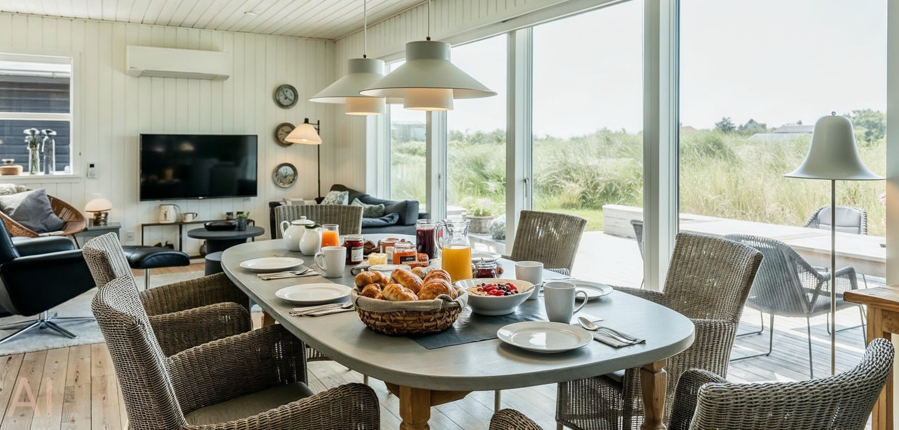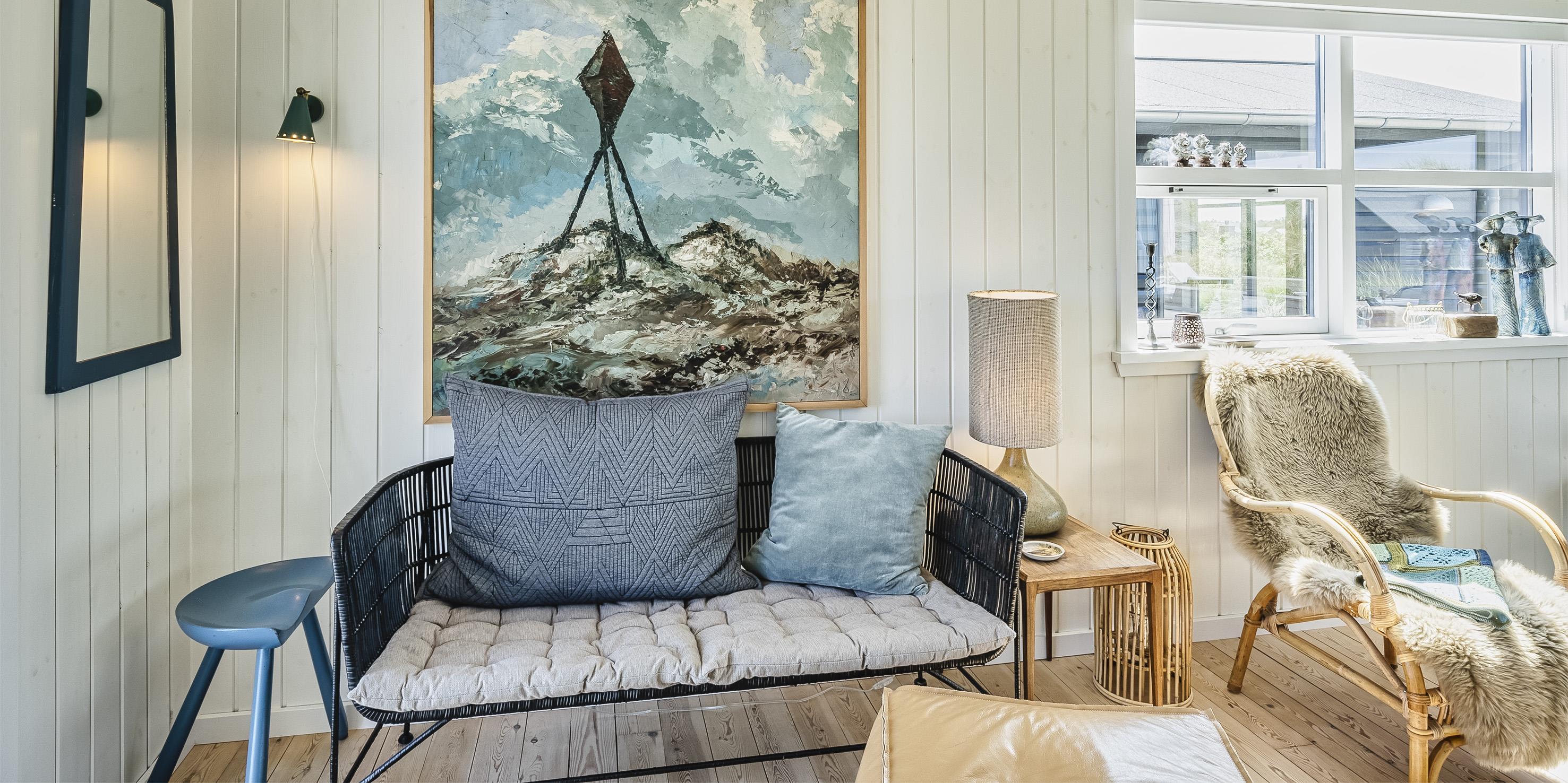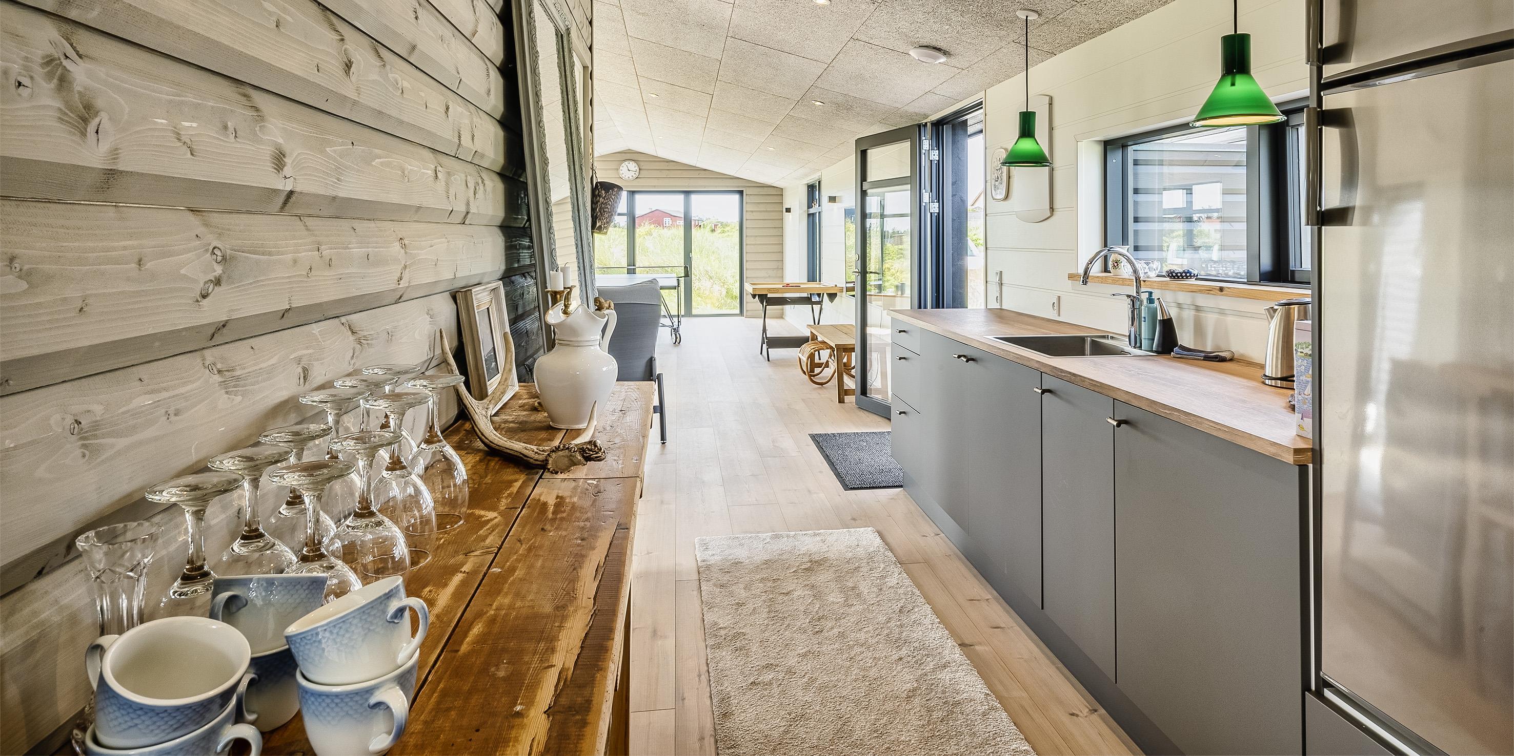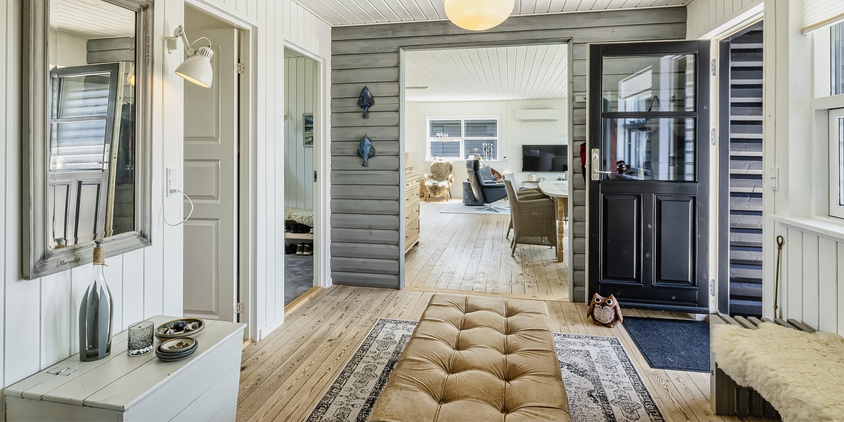 Sommerhuset byder på en skøn atmosfære i en moderne, nordisk stil, og med store panoramavinduer vendt mod naturen.
